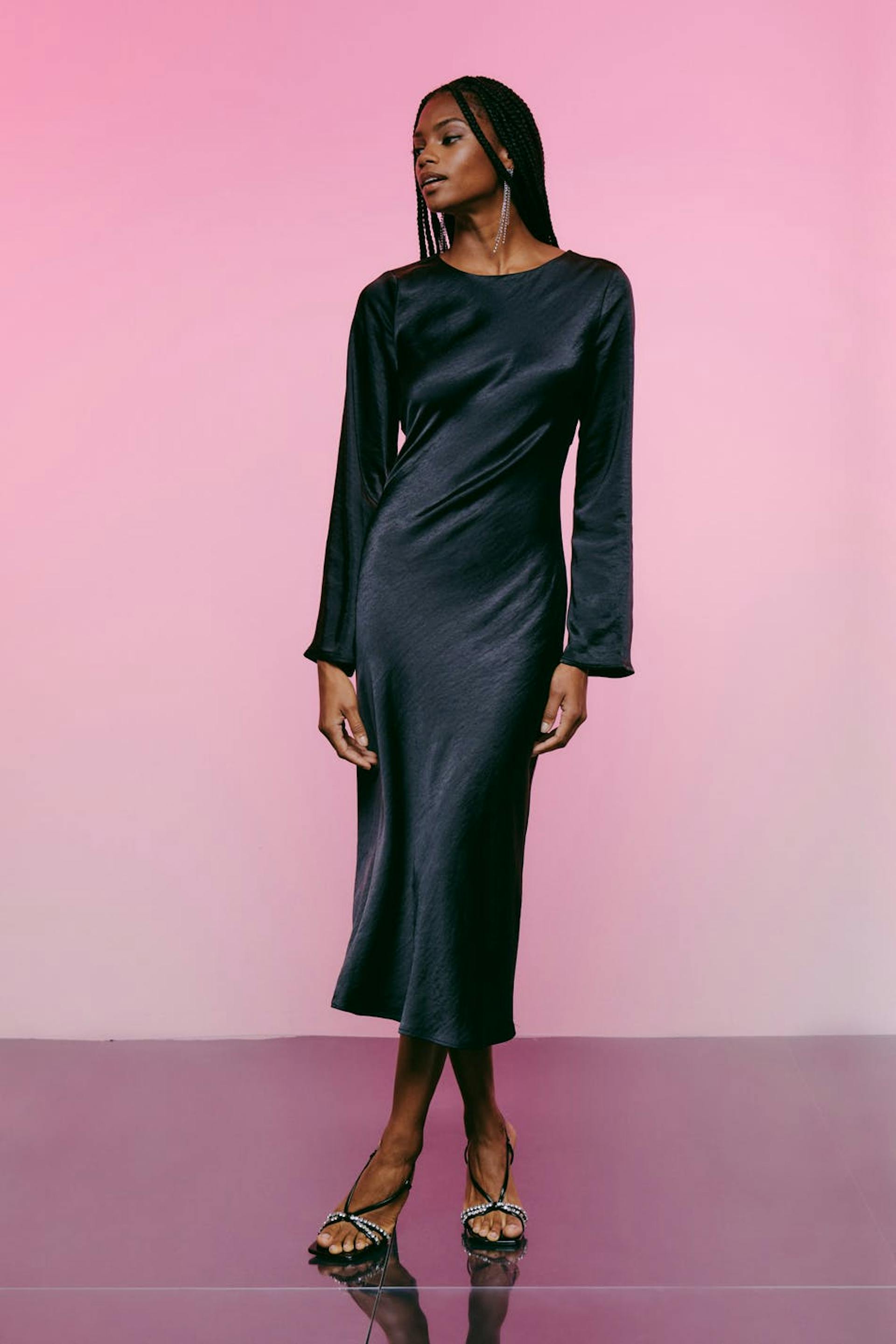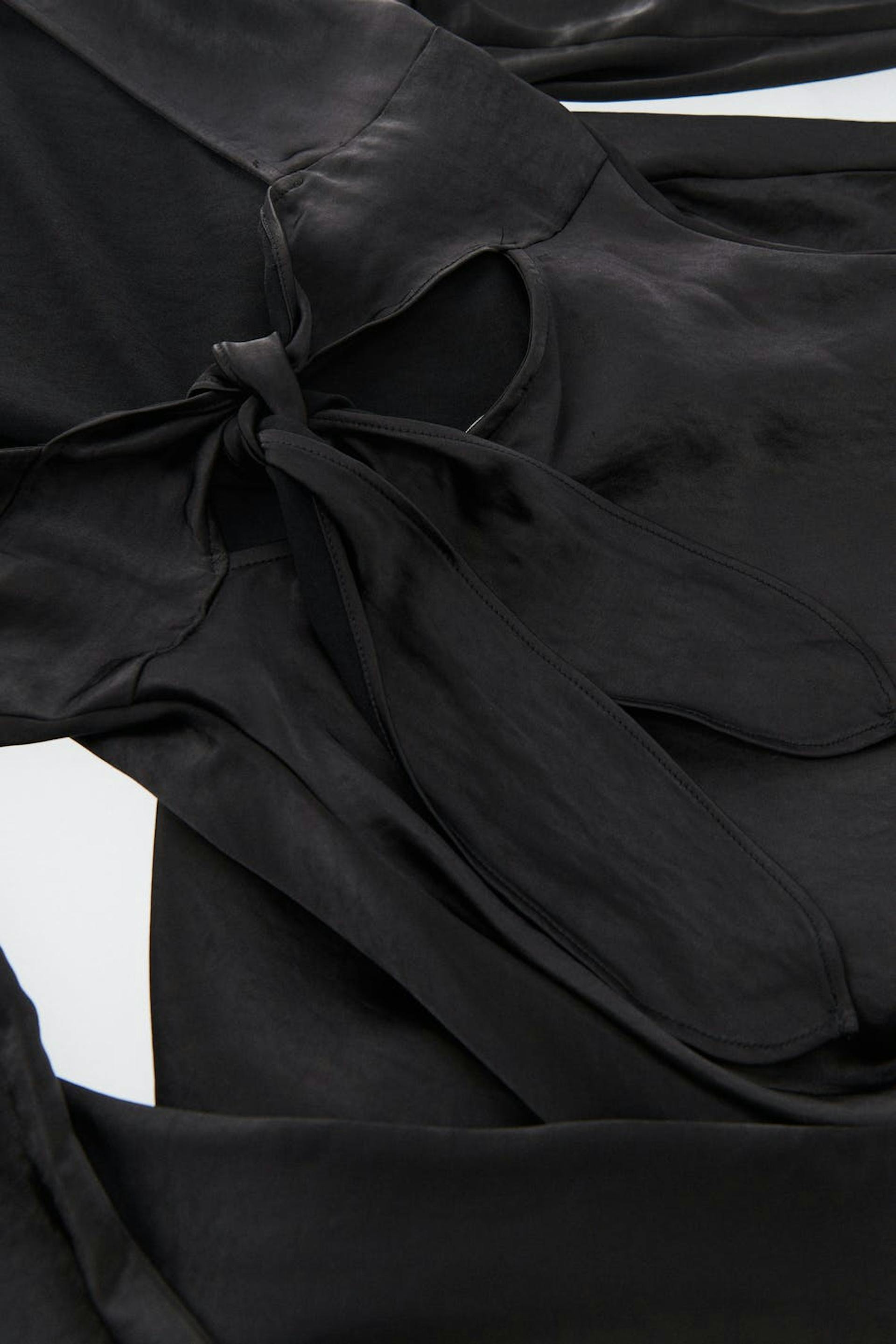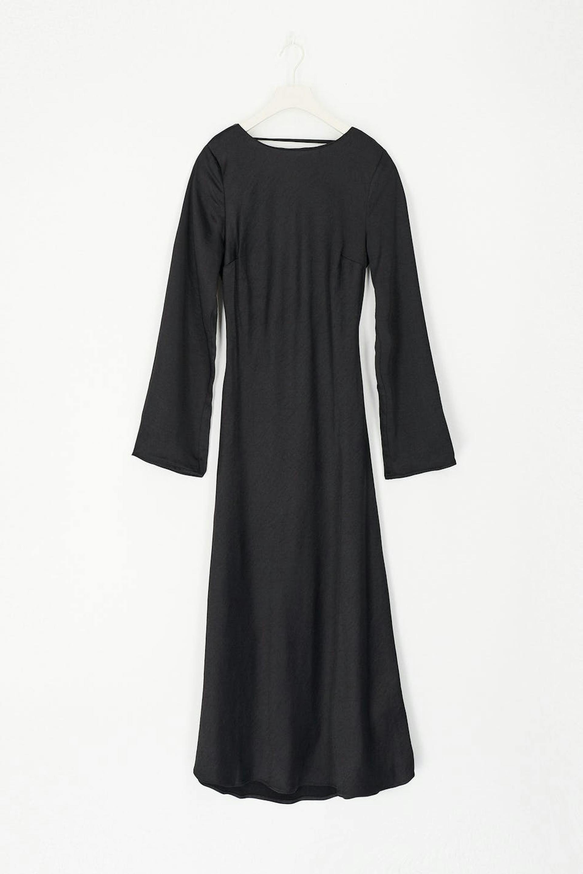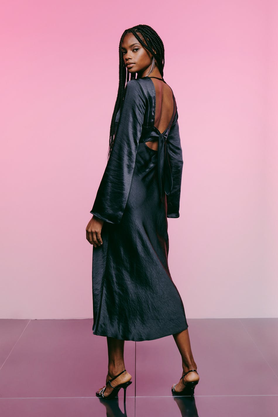 Long-sleeved satin dress with open back. The satin dress is black and has high neckline. It has a knot detail in the back and midi length.