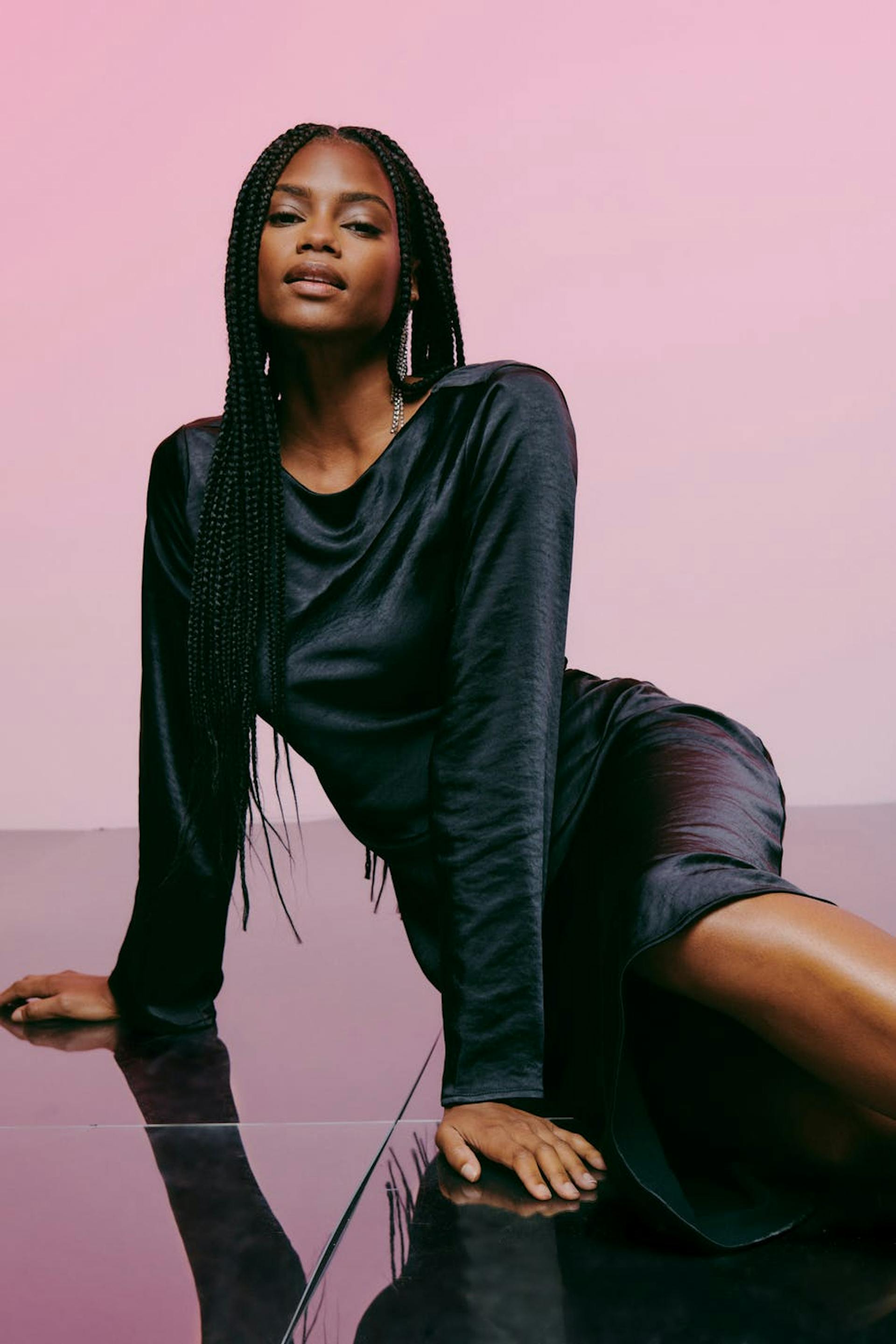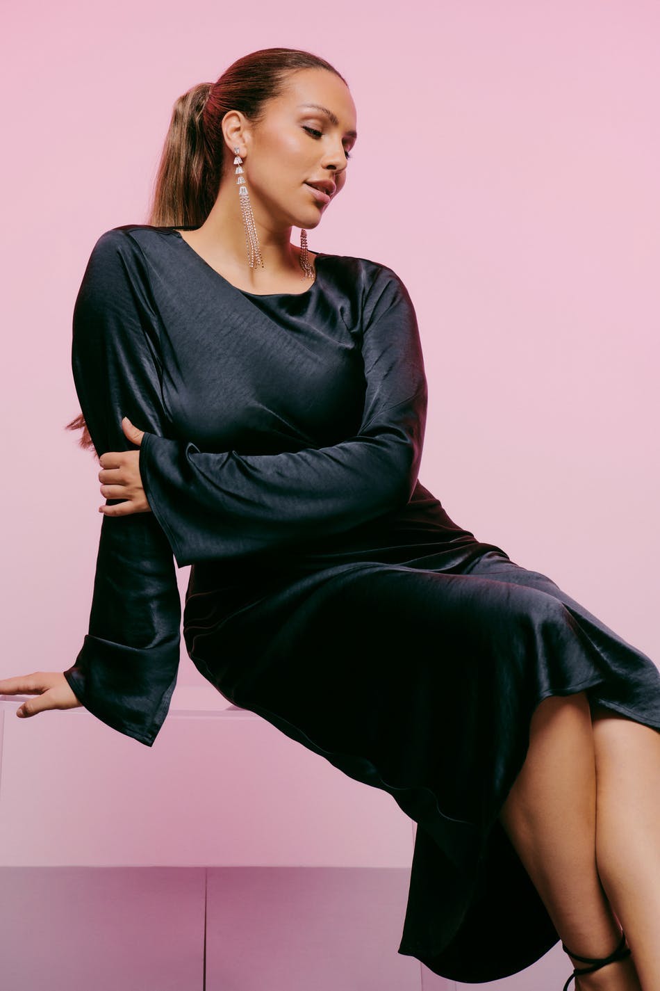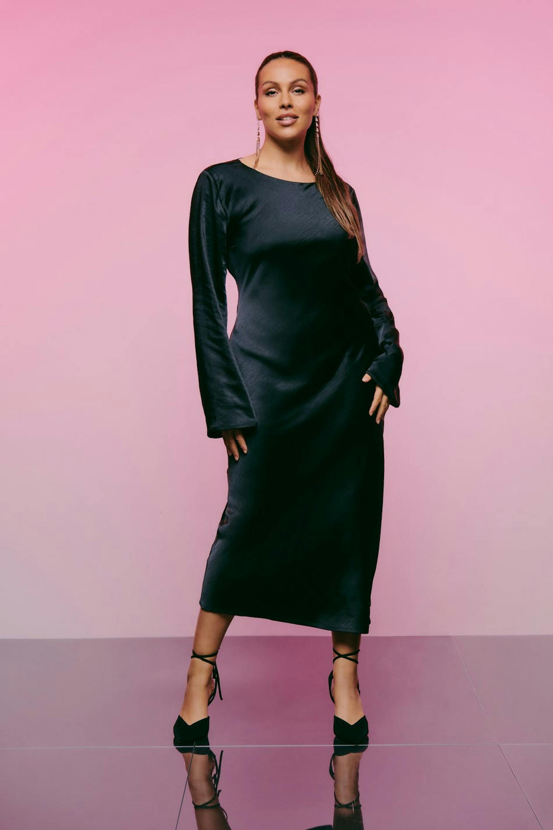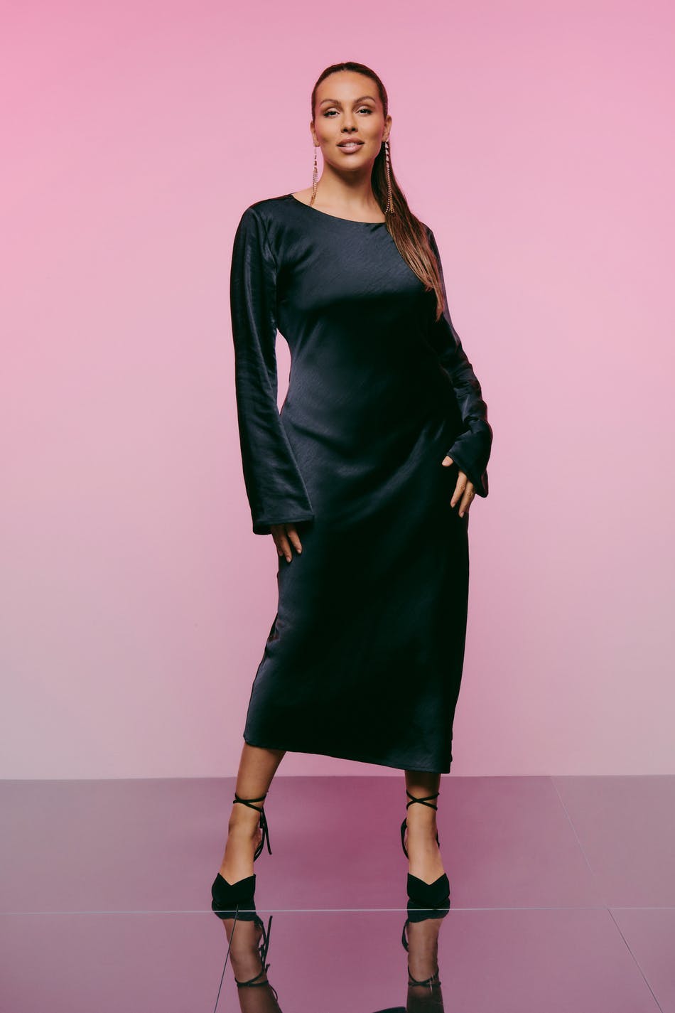 Long-sleeved satin dress with open back. The satin dress is black and has high neckline. It has a knot detail in the back and midi length.