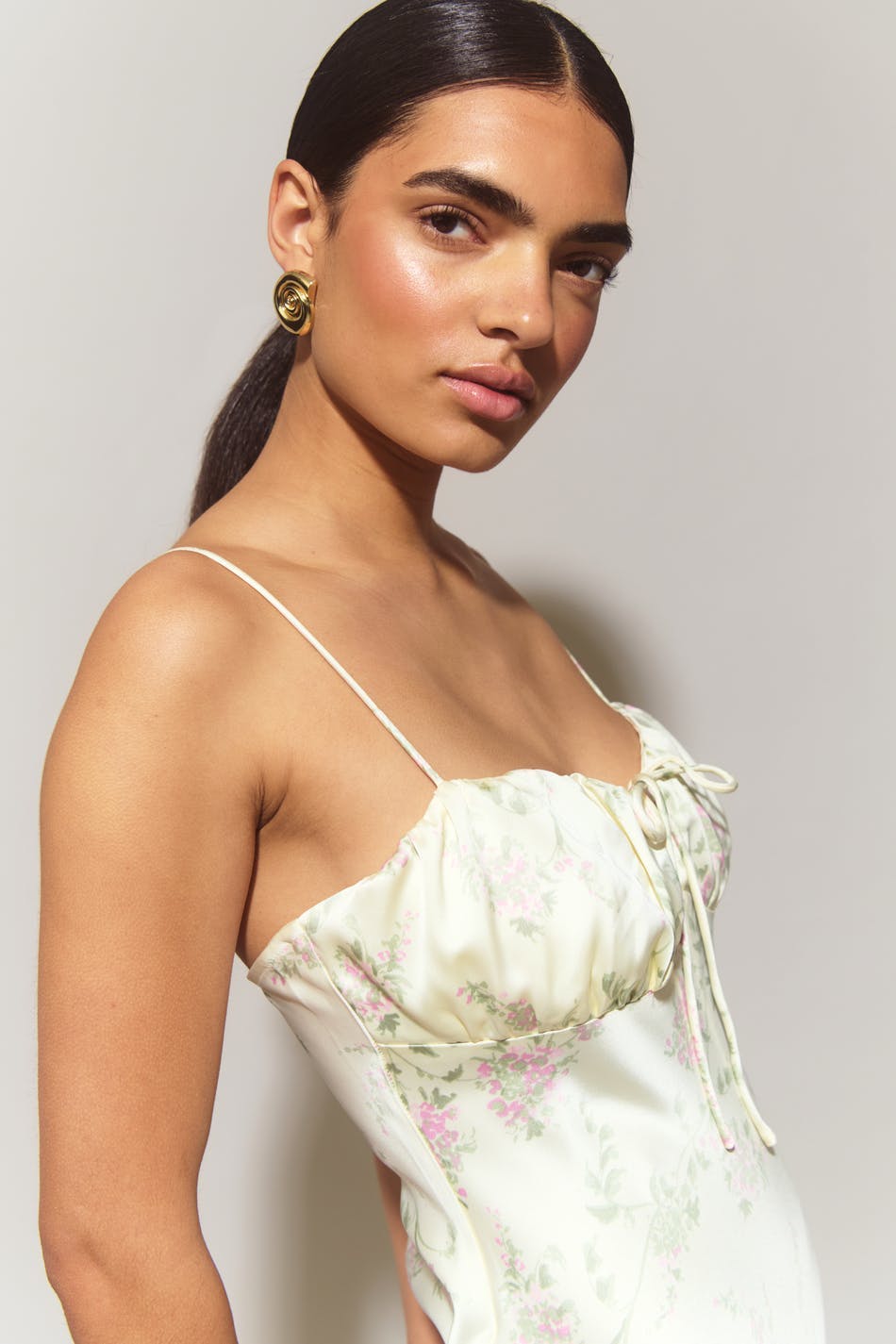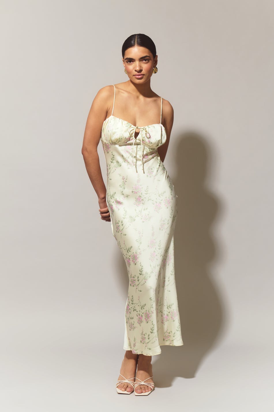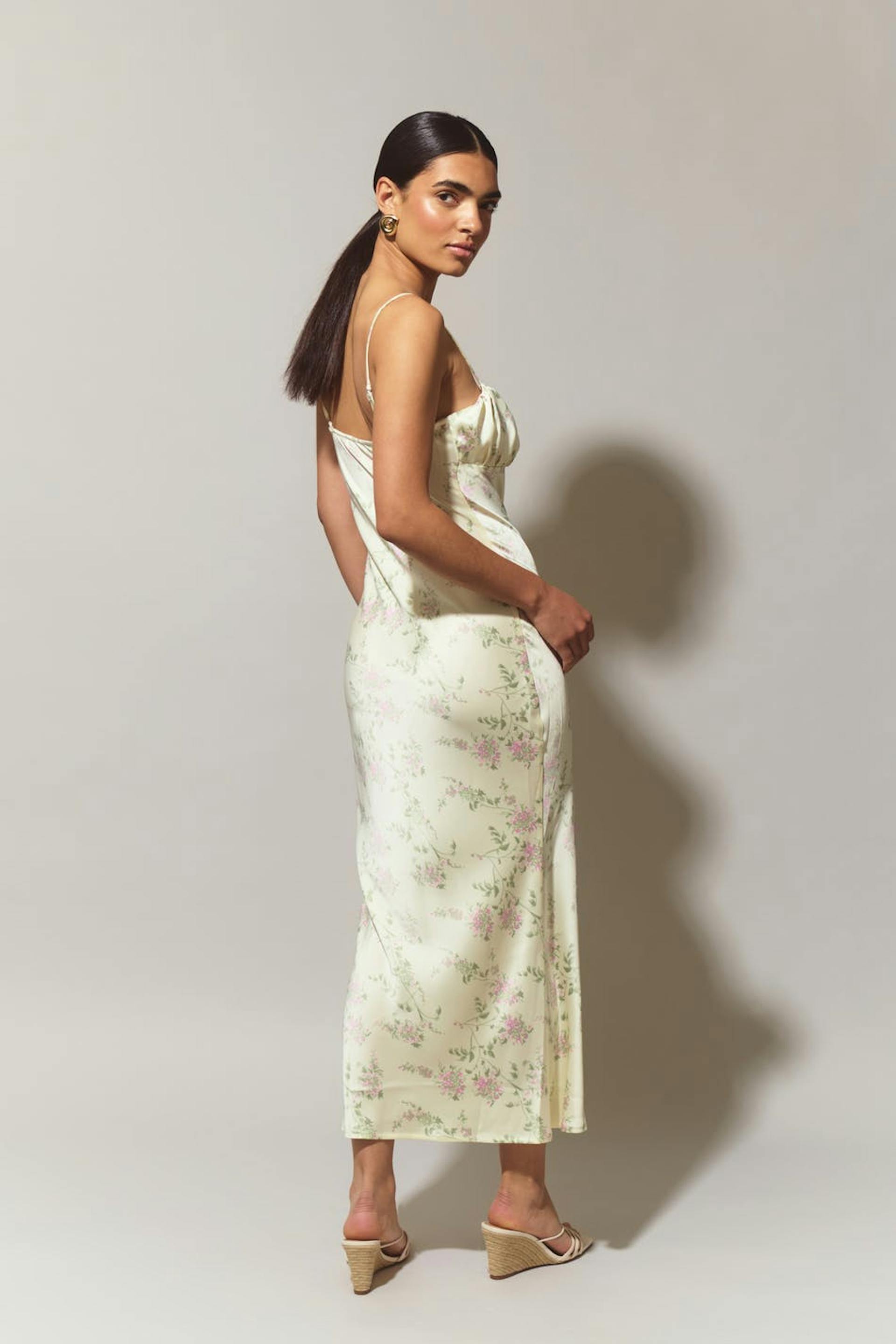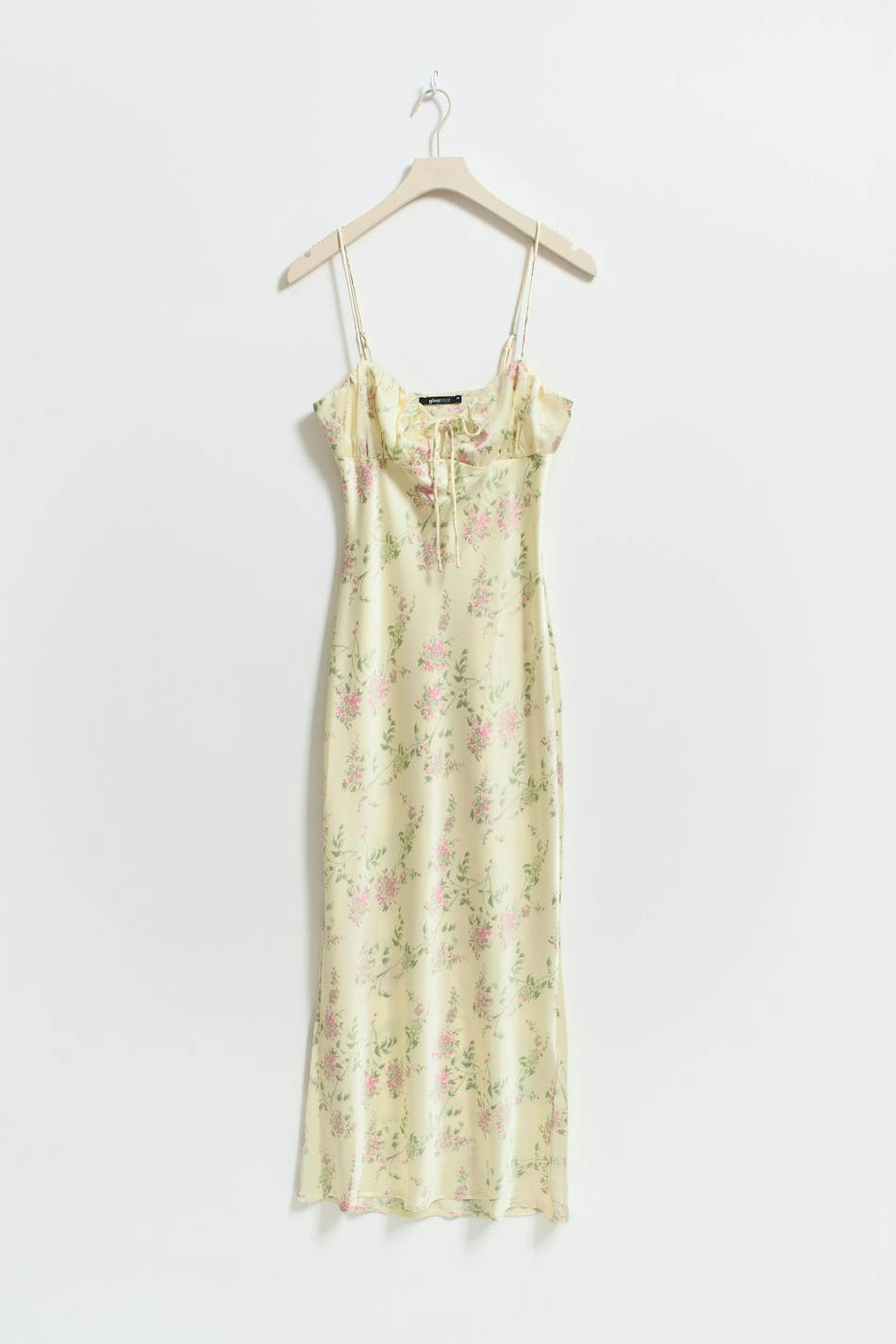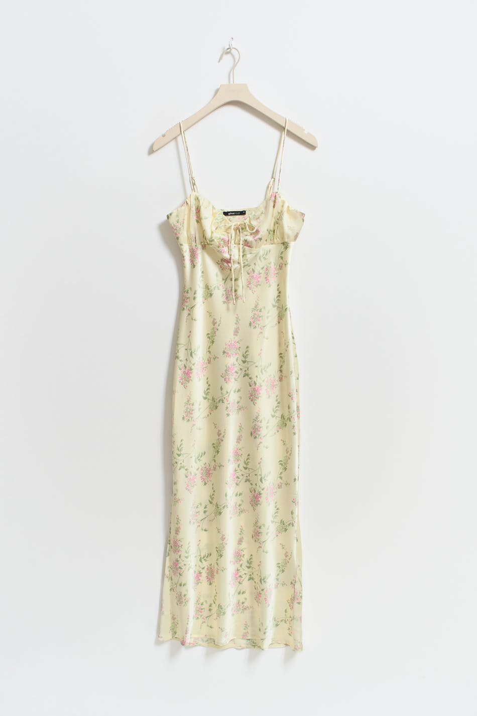 Floral satin dress with ruched bust. The satin dress is yellow, pink and sleeveless. It has slim shoulder straps, figure-hugging fit, soft, shiny quality, tie detail at the front and midi length.