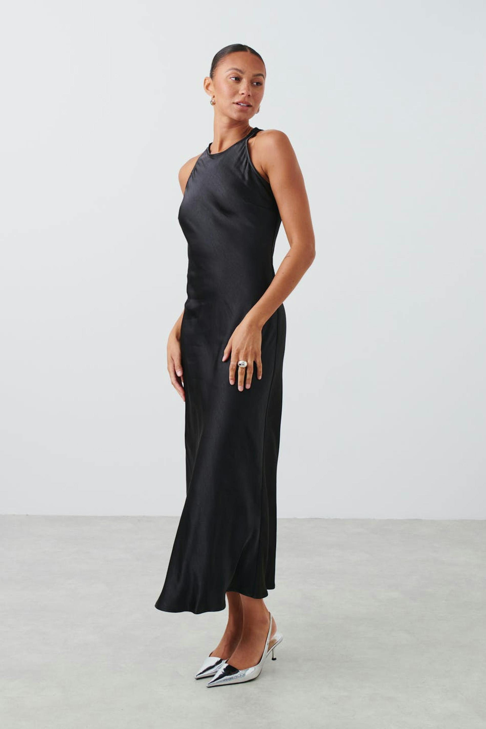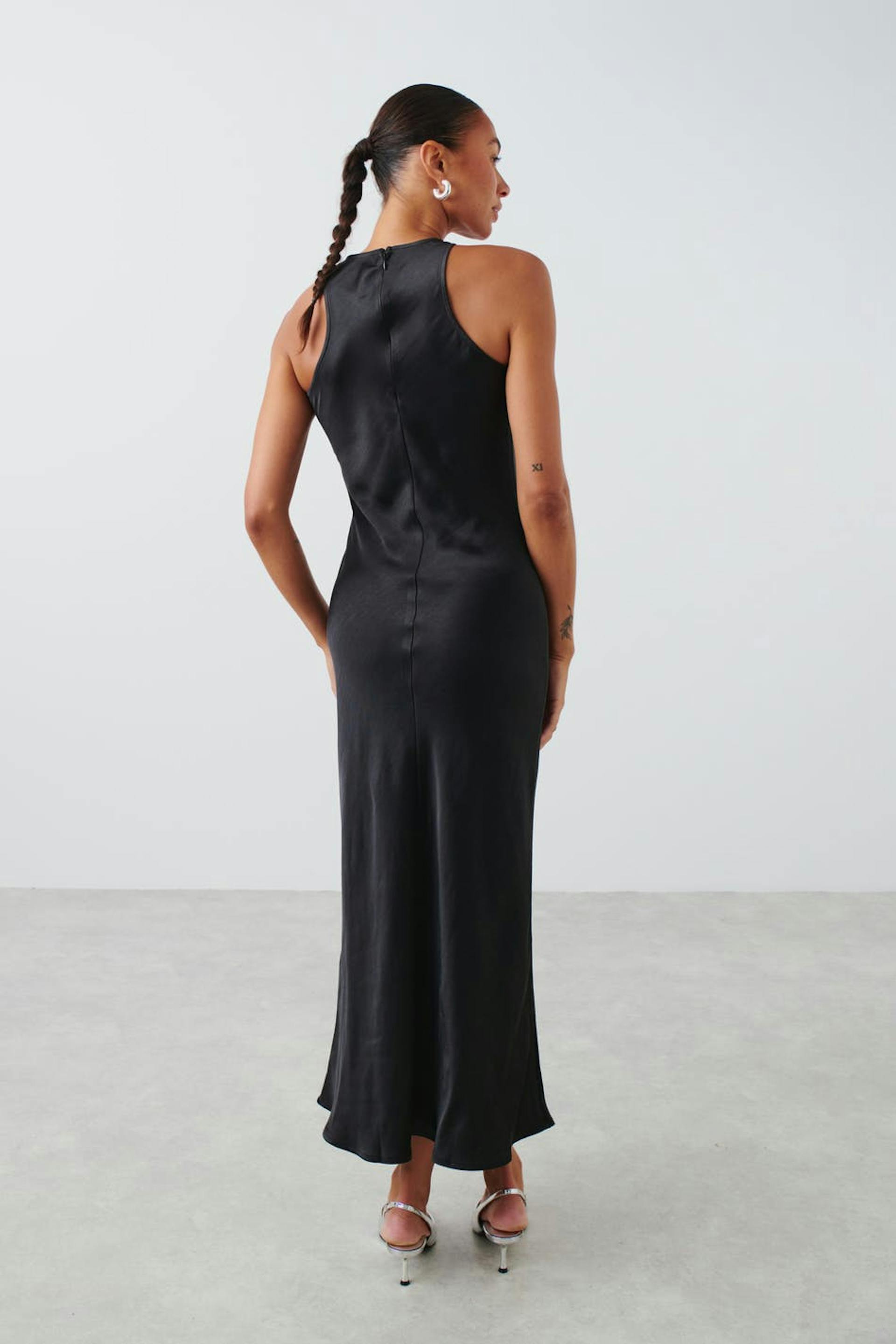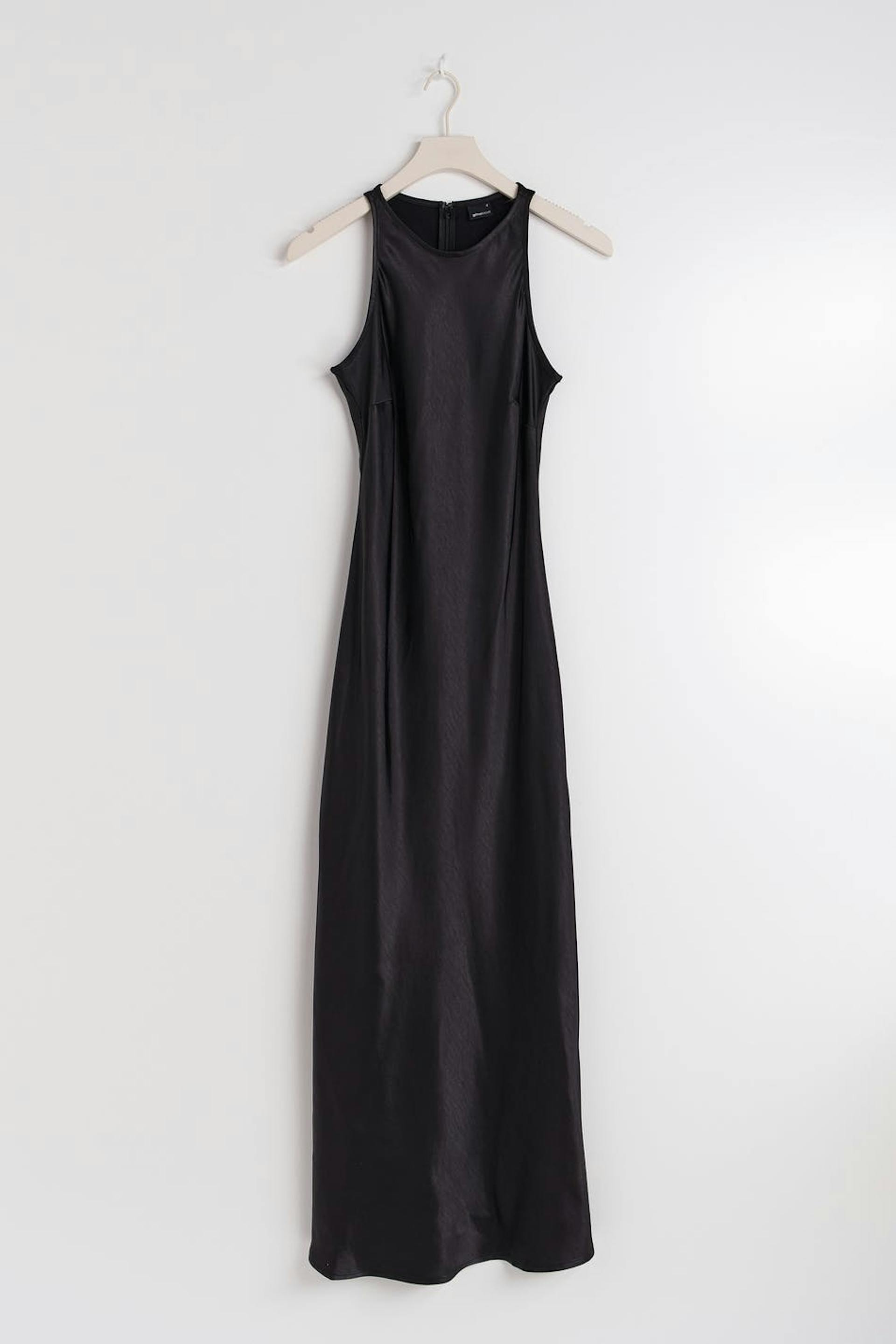 Sleeveless maxi dress in satin with high neckline. The dress is black and has zip in the back.