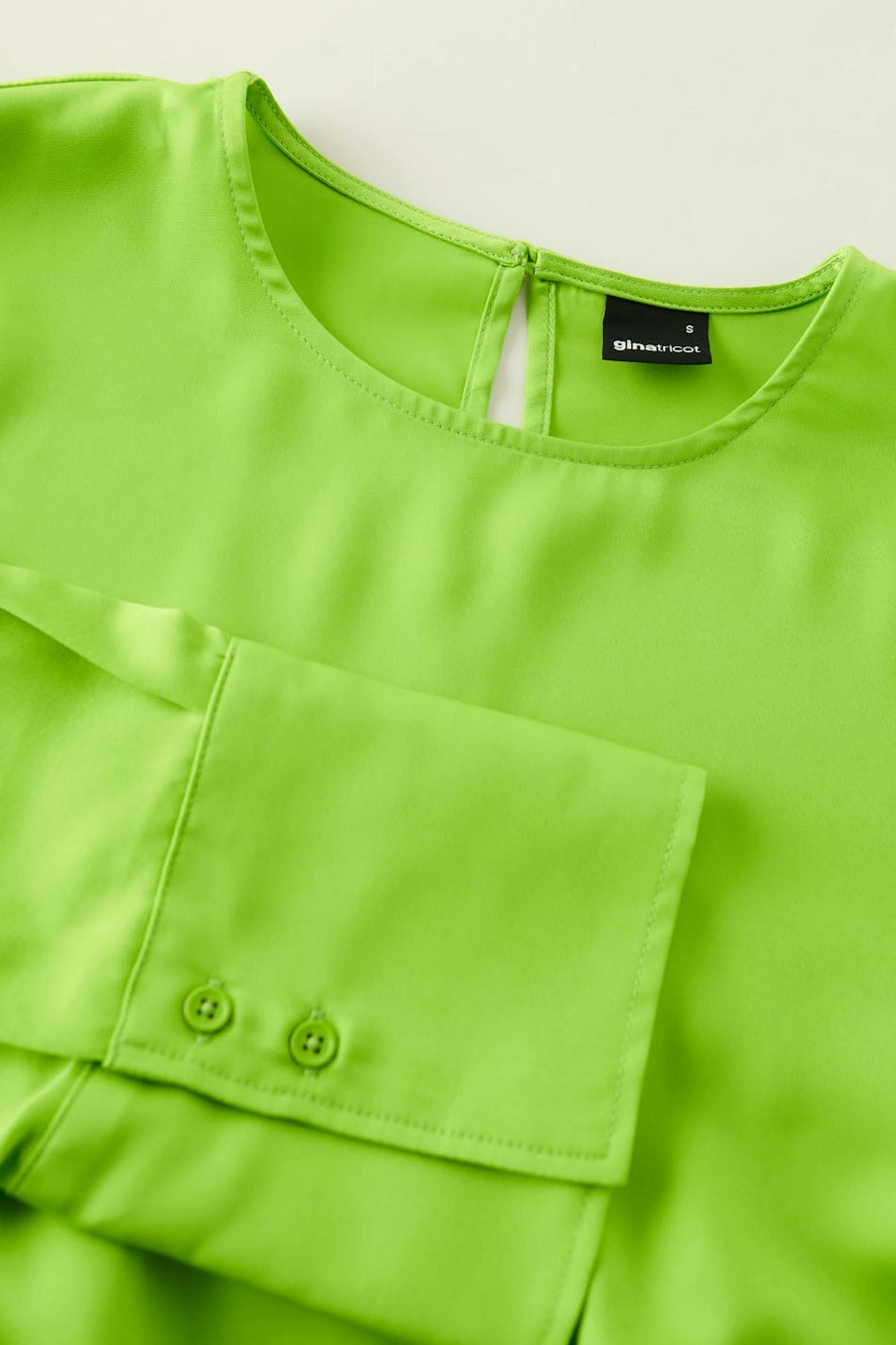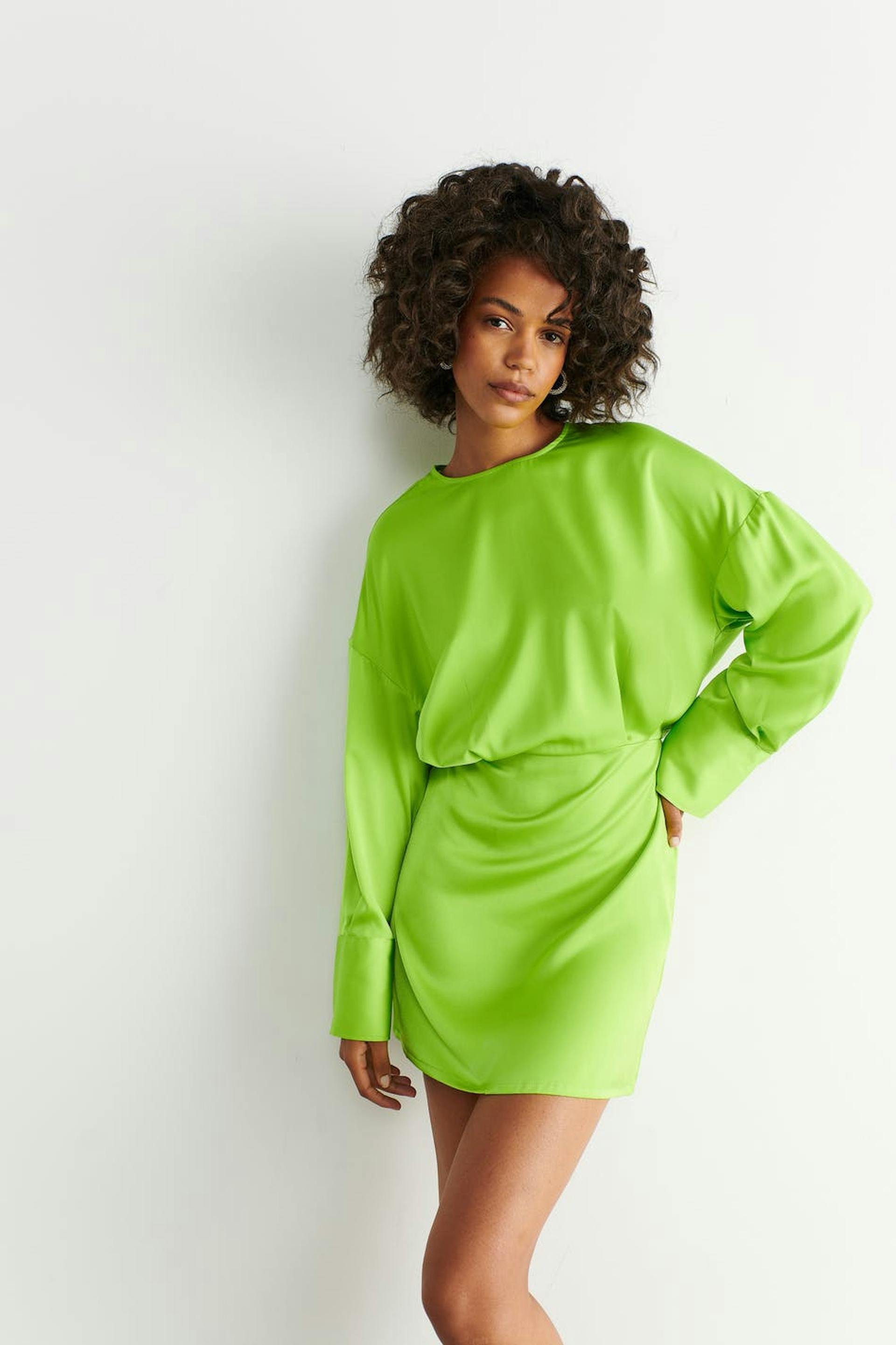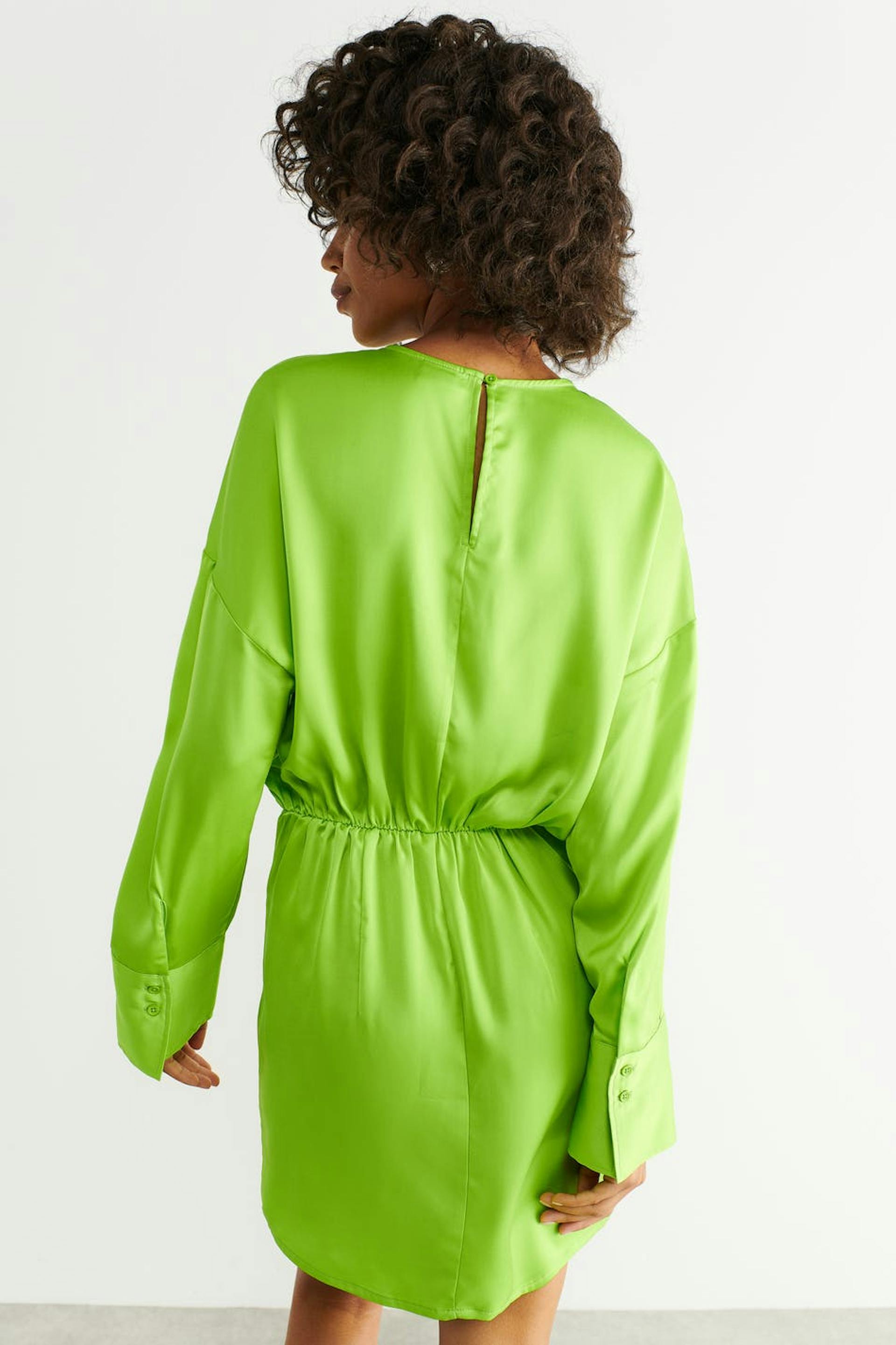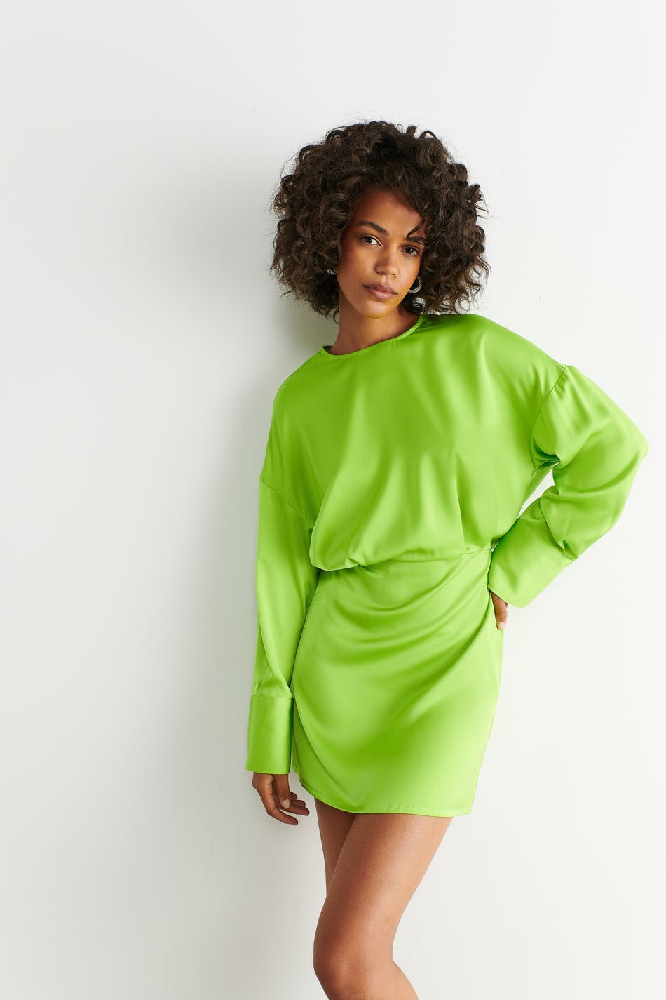 Long-sleeved satin dress with pleat details at the front. The satin dress is green and has dropped shoulders. It has loose-fitting style at the top, fitted skirt, elastic at the back, cuffs and keyhole opening with button in the back.