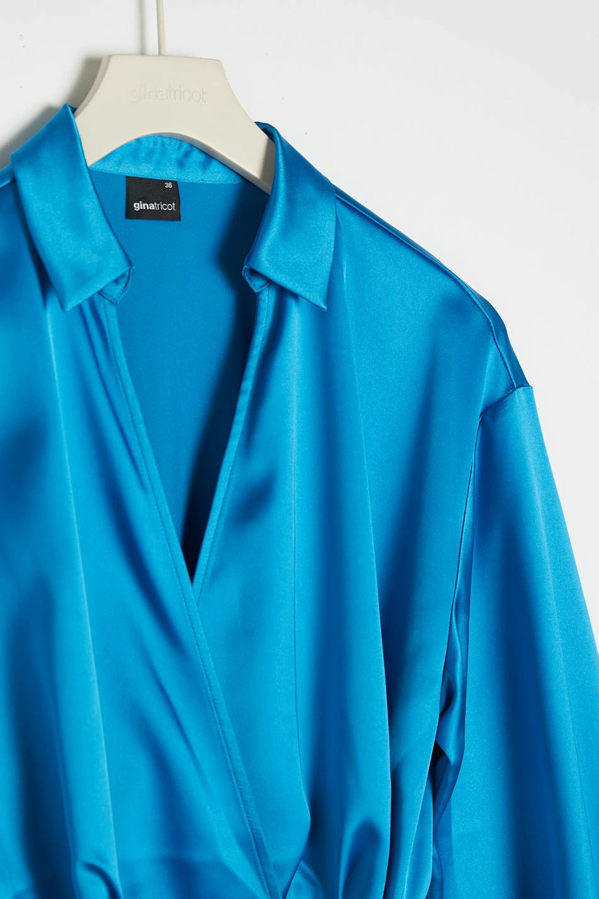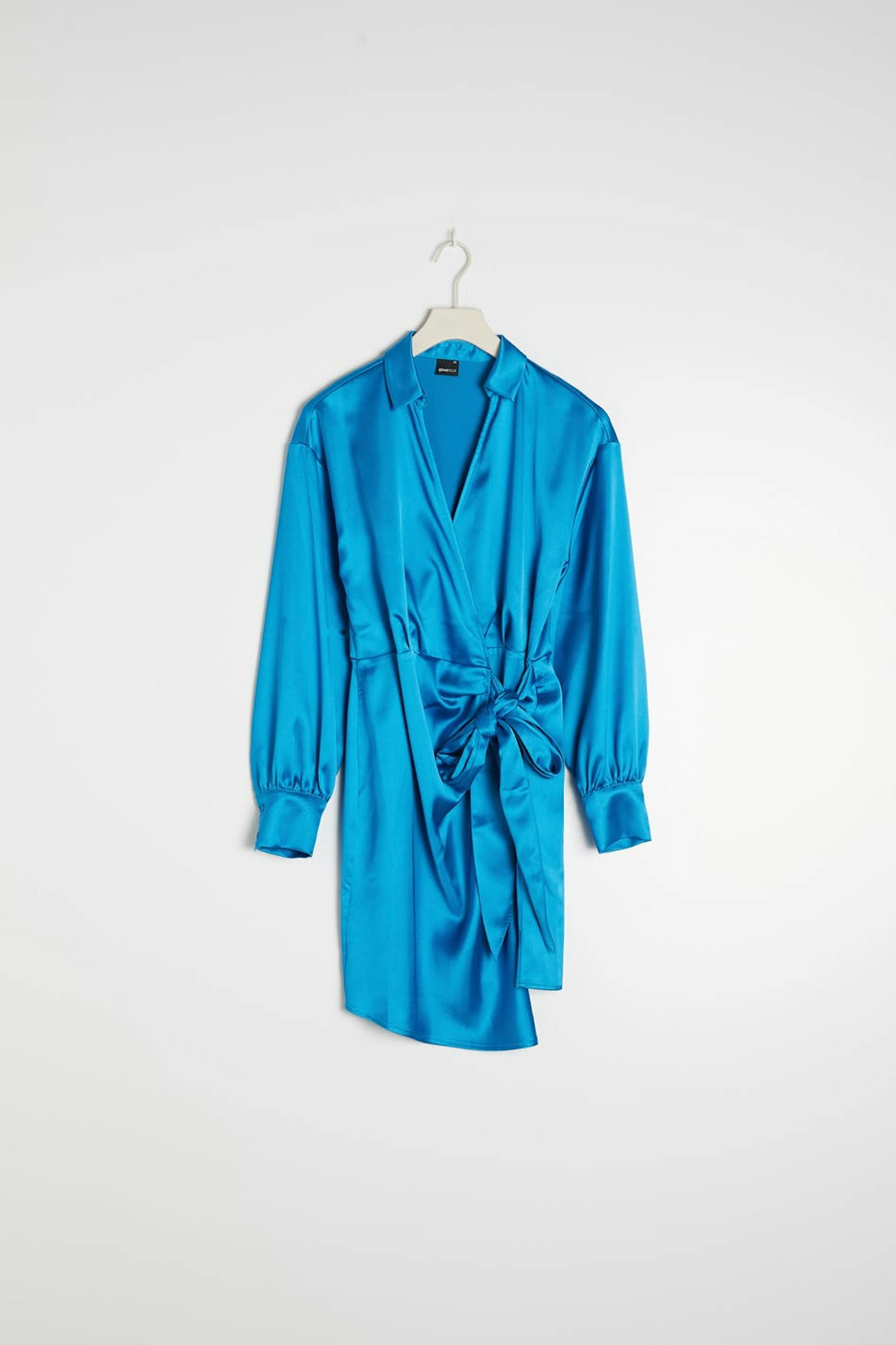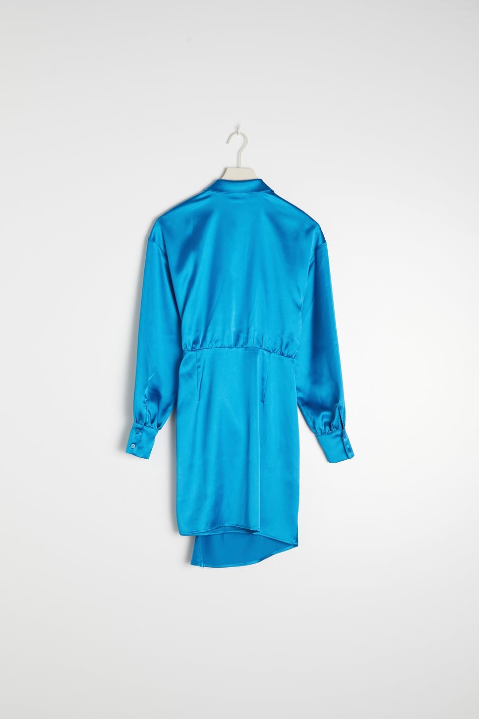 Long-sleeved wrap front dress in satin with self-tie at the waist. The dress is blue and has v-neck. It has loose-fitting style at the top, fitted skirt, cuffs on the sleeve ends and shirt collar.