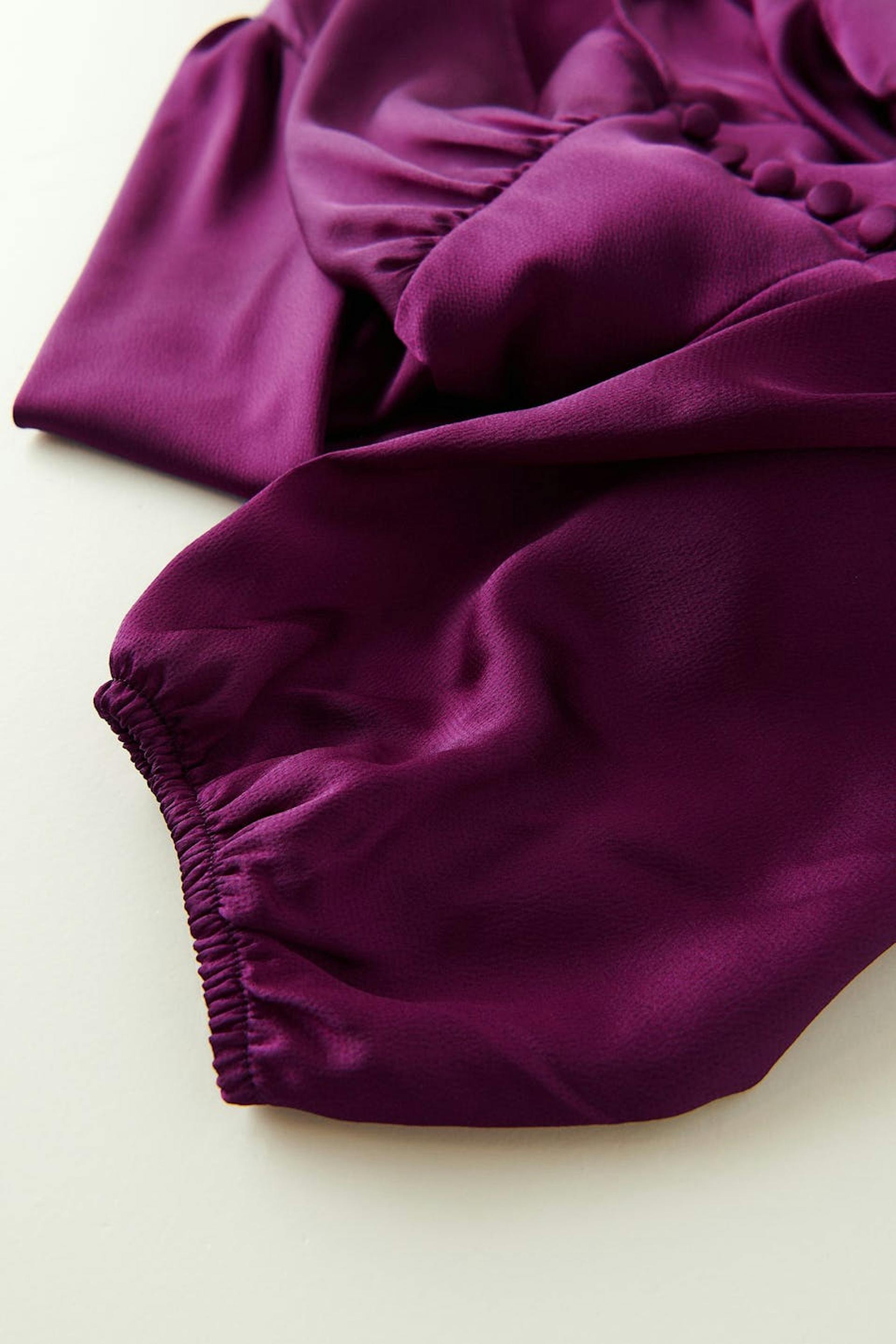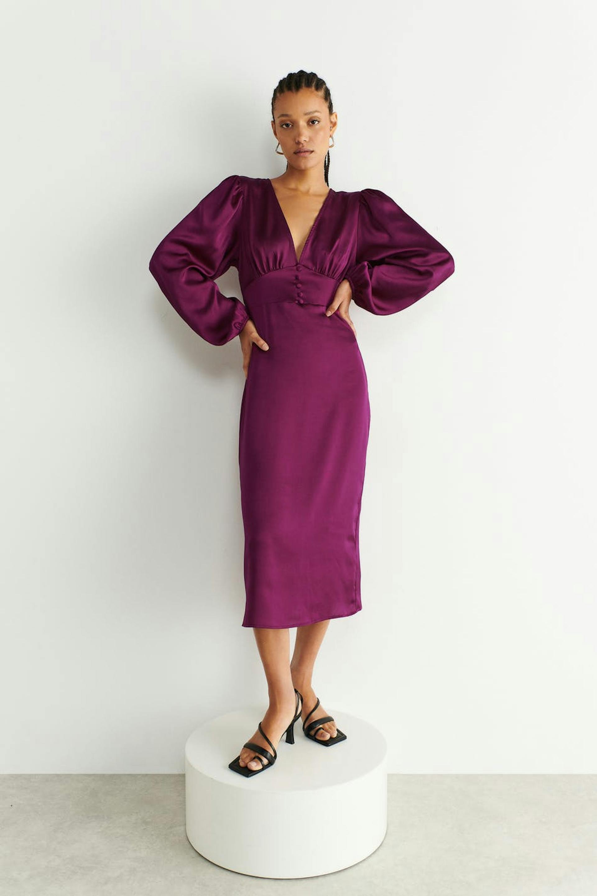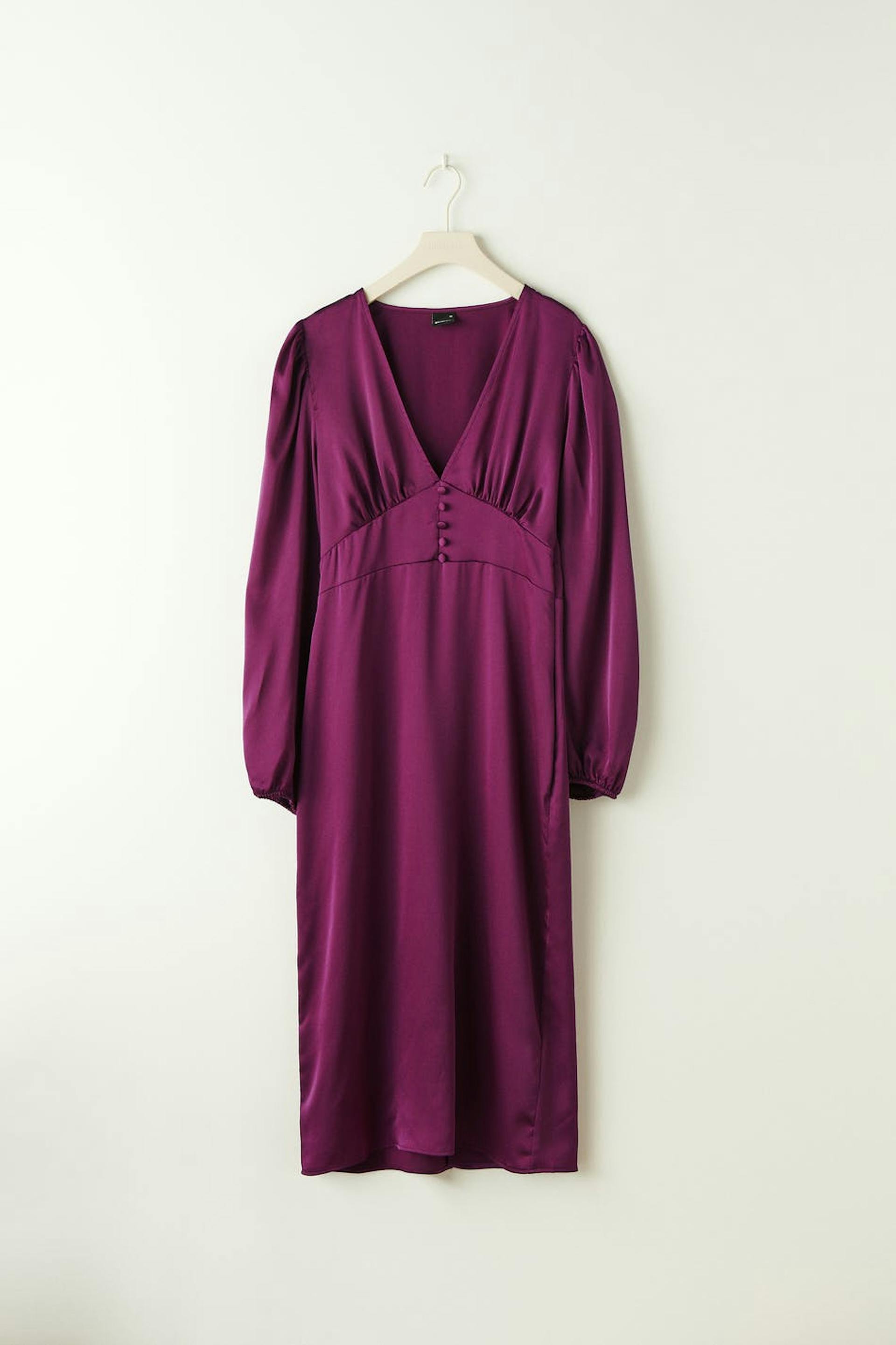 Long-sleeved midi dress with slit at the back. The dress is purple and has voluminous sleeves. It has zip in the side seam, plunge neckline, decorative buttons at the front and gathering below the bust.