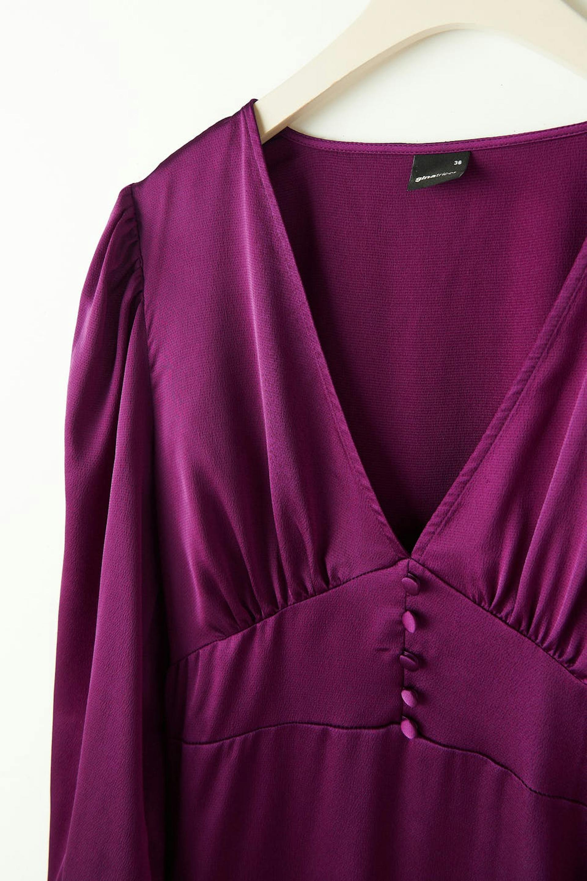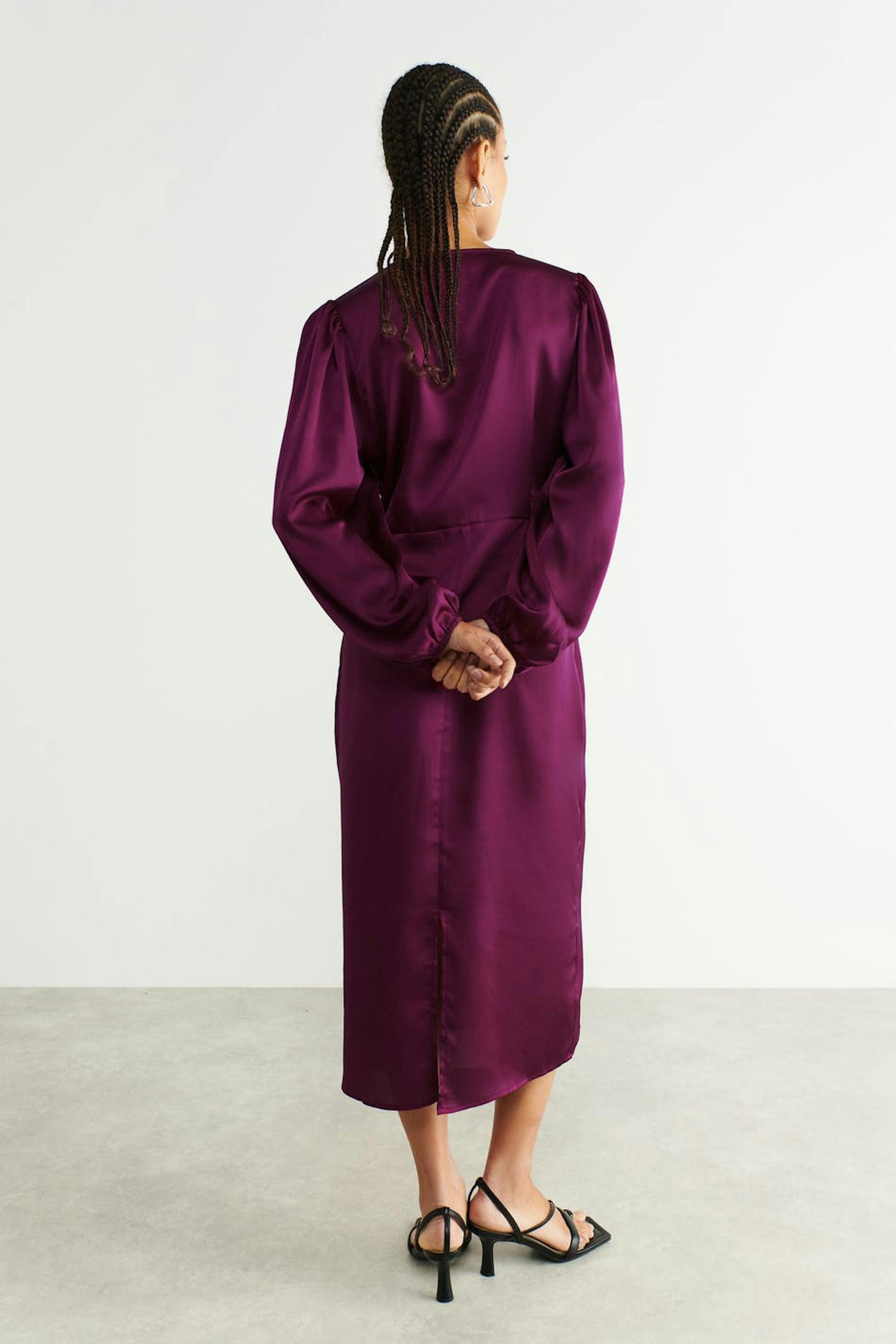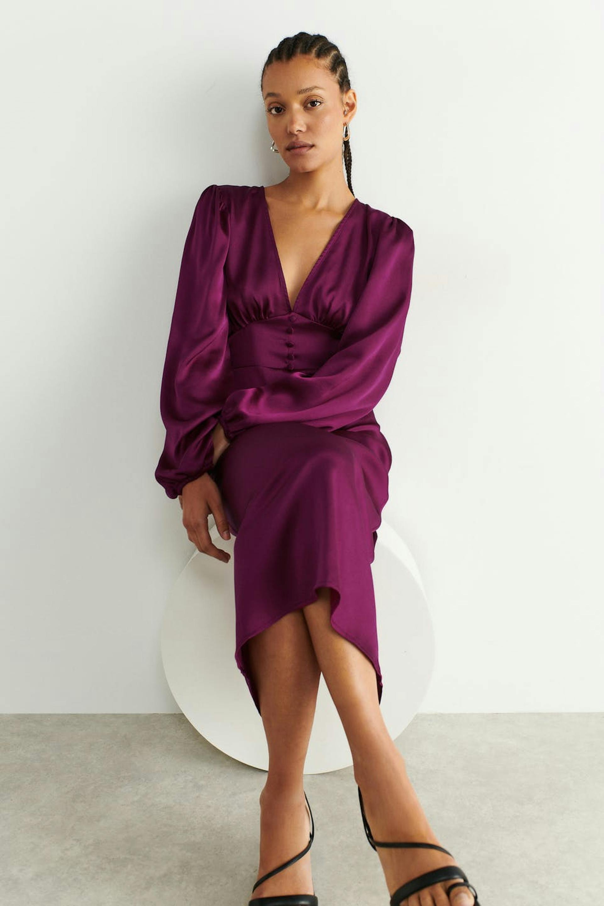 Long-sleeved midi dress with slit at the back. The dress is purple and has voluminous sleeves. It has zip in the side seam, plunge neckline, decorative buttons at the front and gathering below the bust.