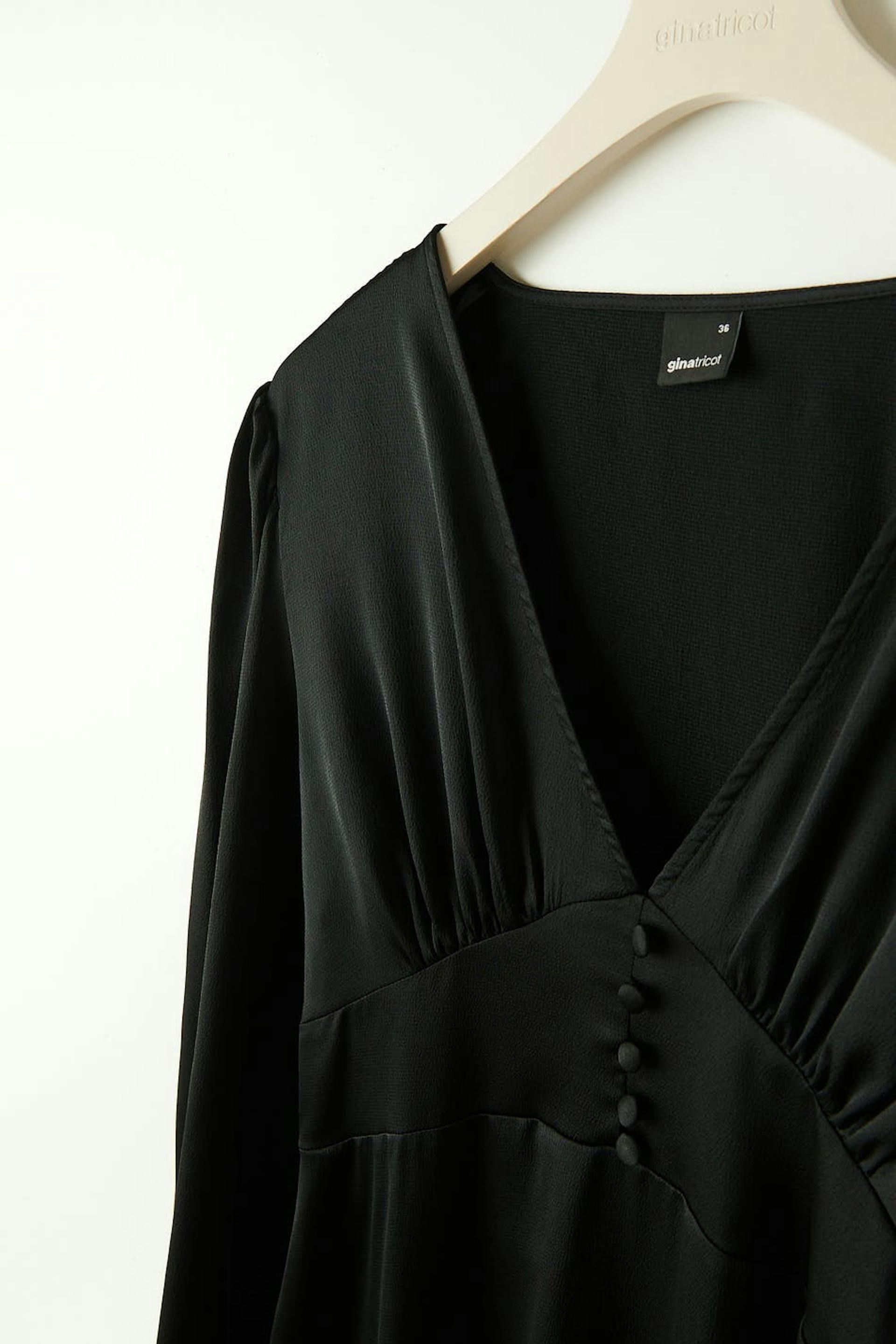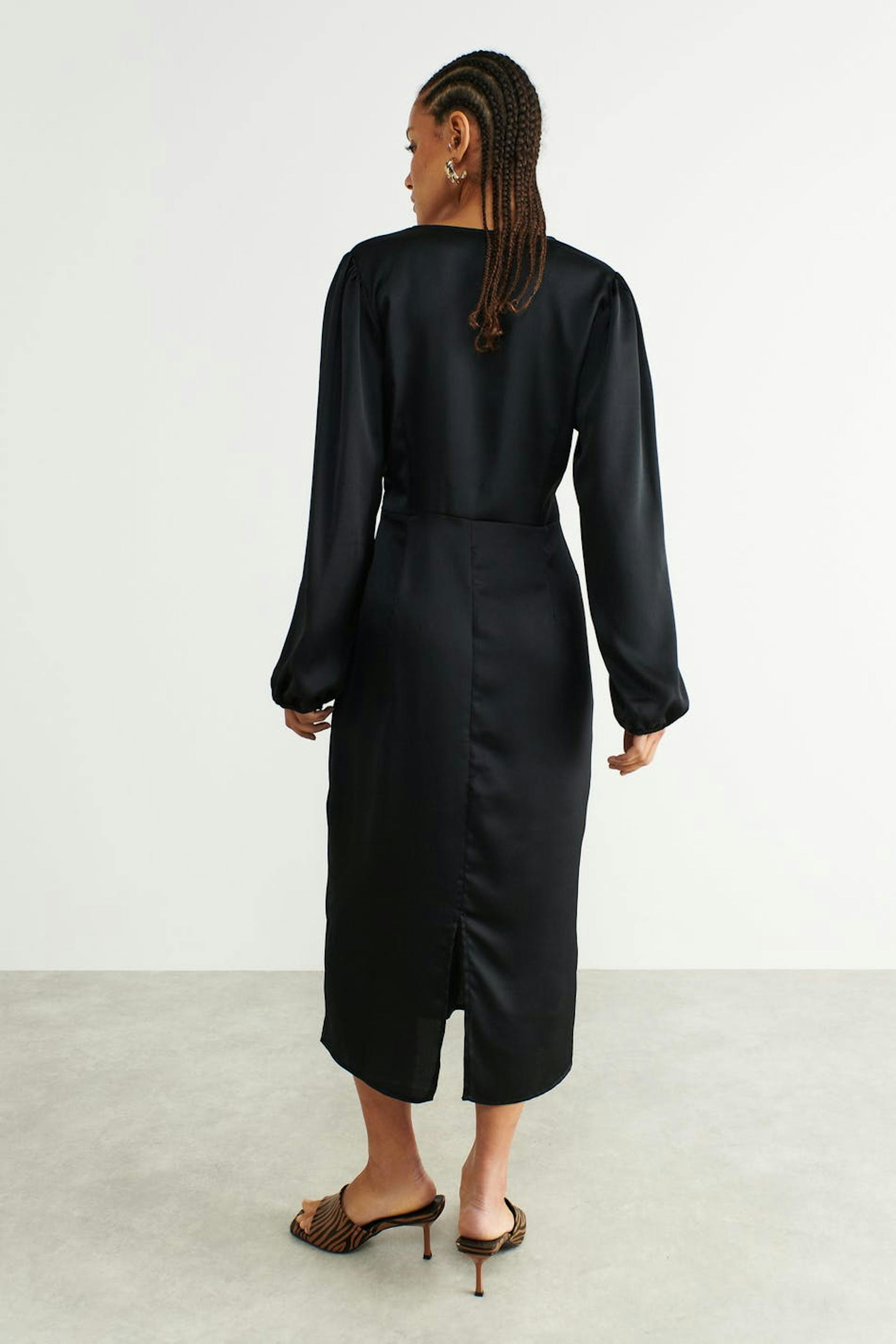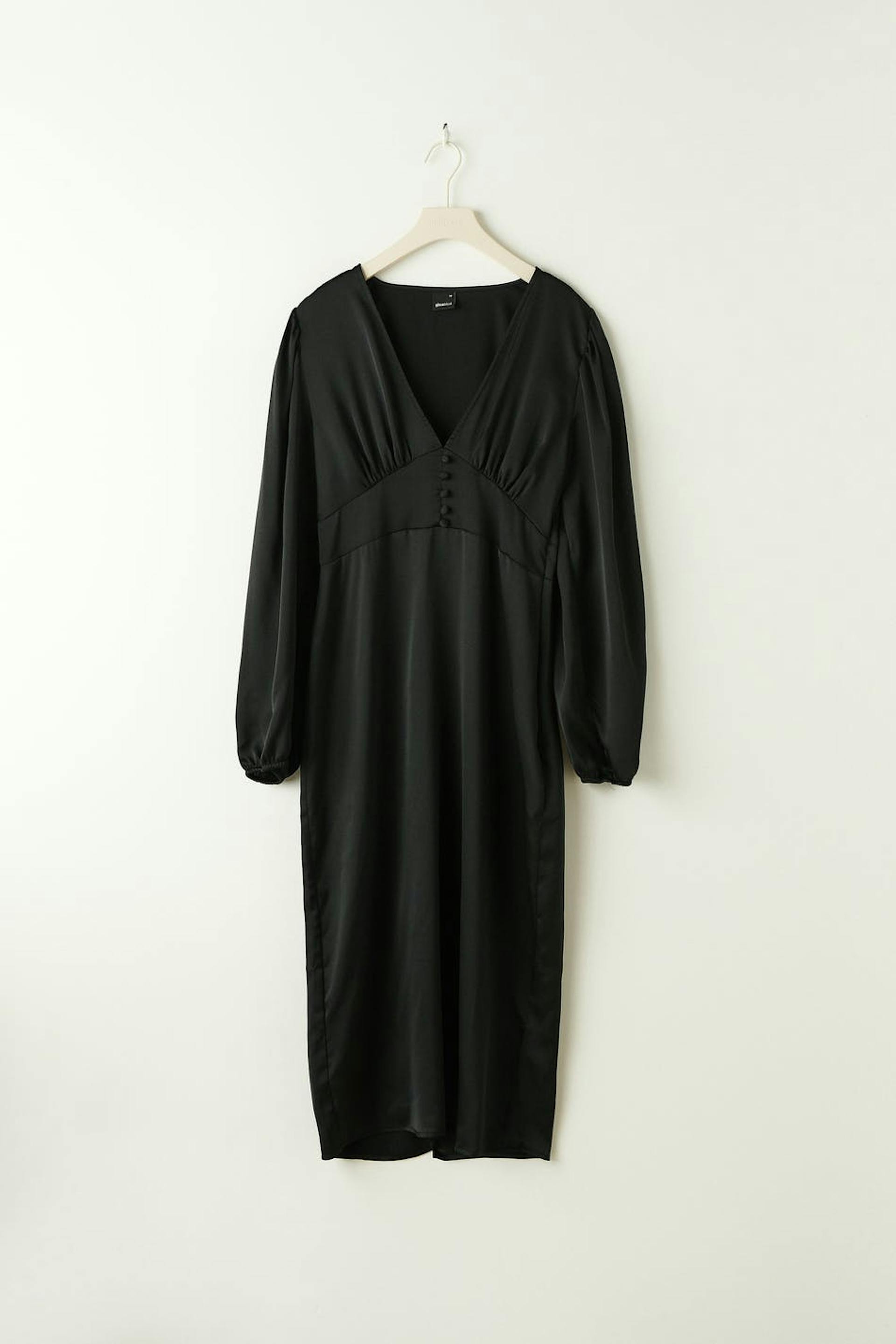 Long-sleeved midi dress with slit at the back. The dress is black and has voluminous sleeves. It has zip in the side seam, plunge neckline, decorative buttons at the front and gathering below the bust.