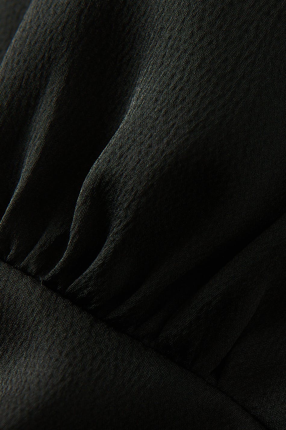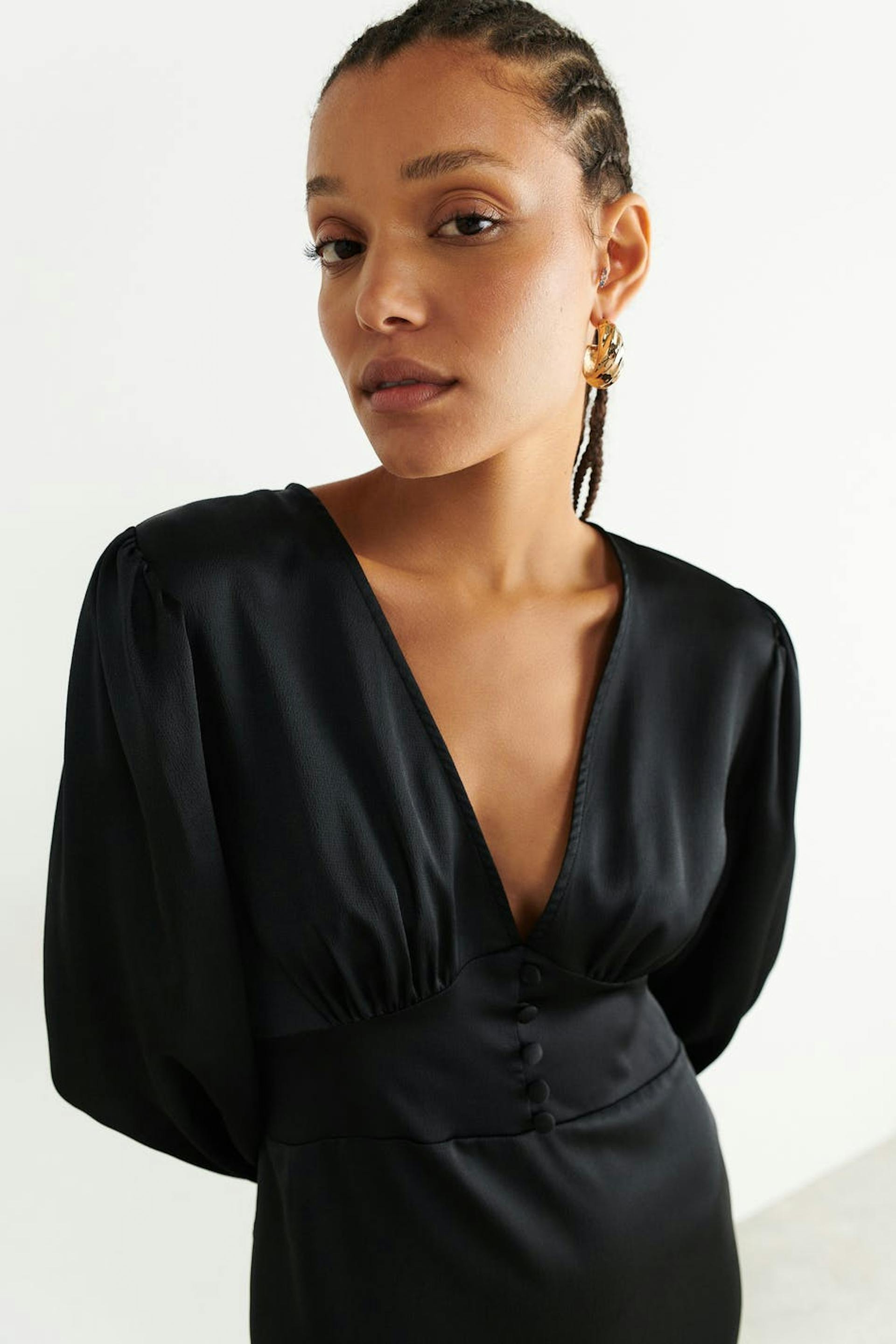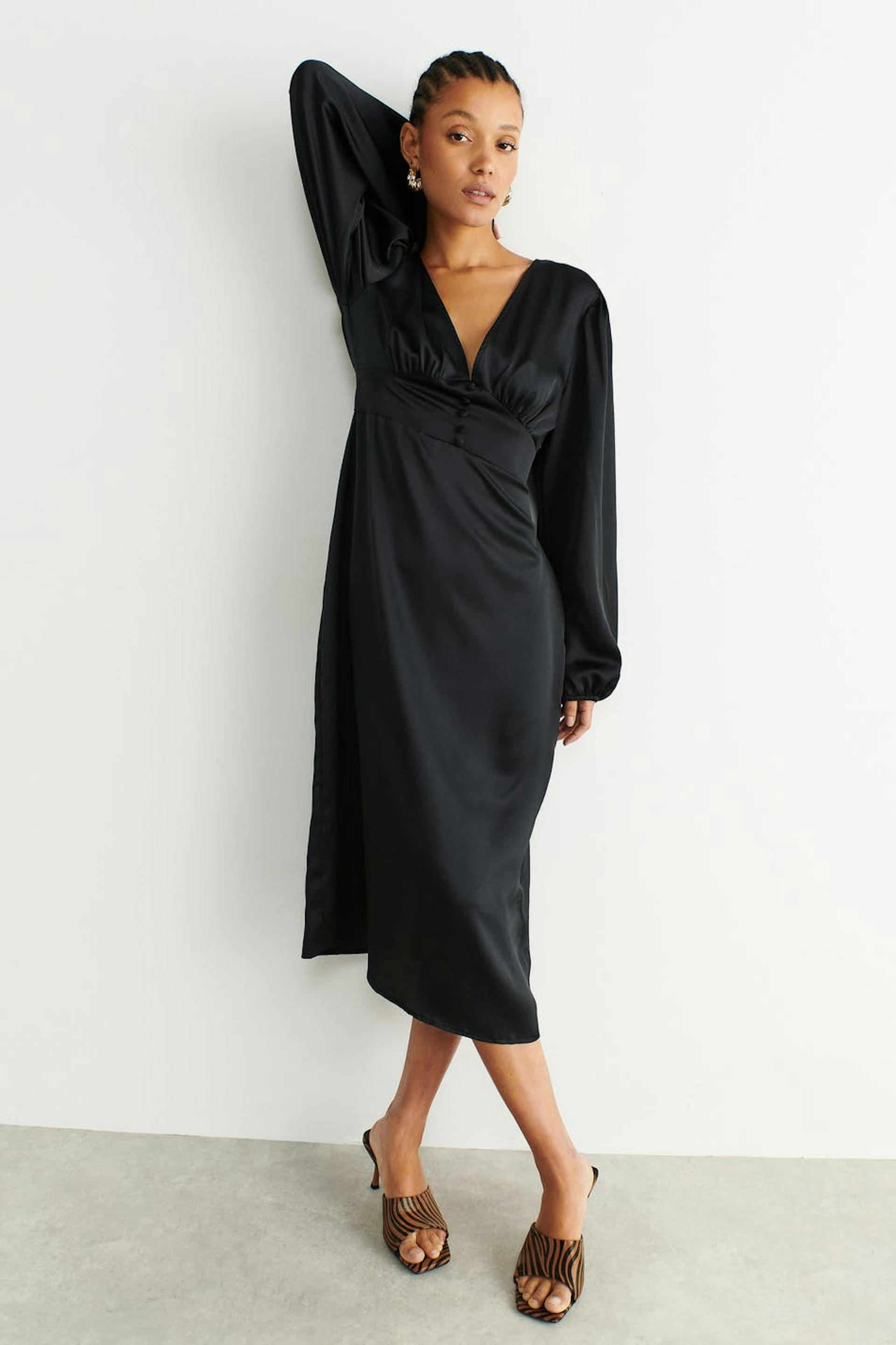 Long-sleeved midi dress with slit at the back. The dress is black and has voluminous sleeves. It has zip in the side seam, plunge neckline, decorative buttons at the front and gathering below the bust.