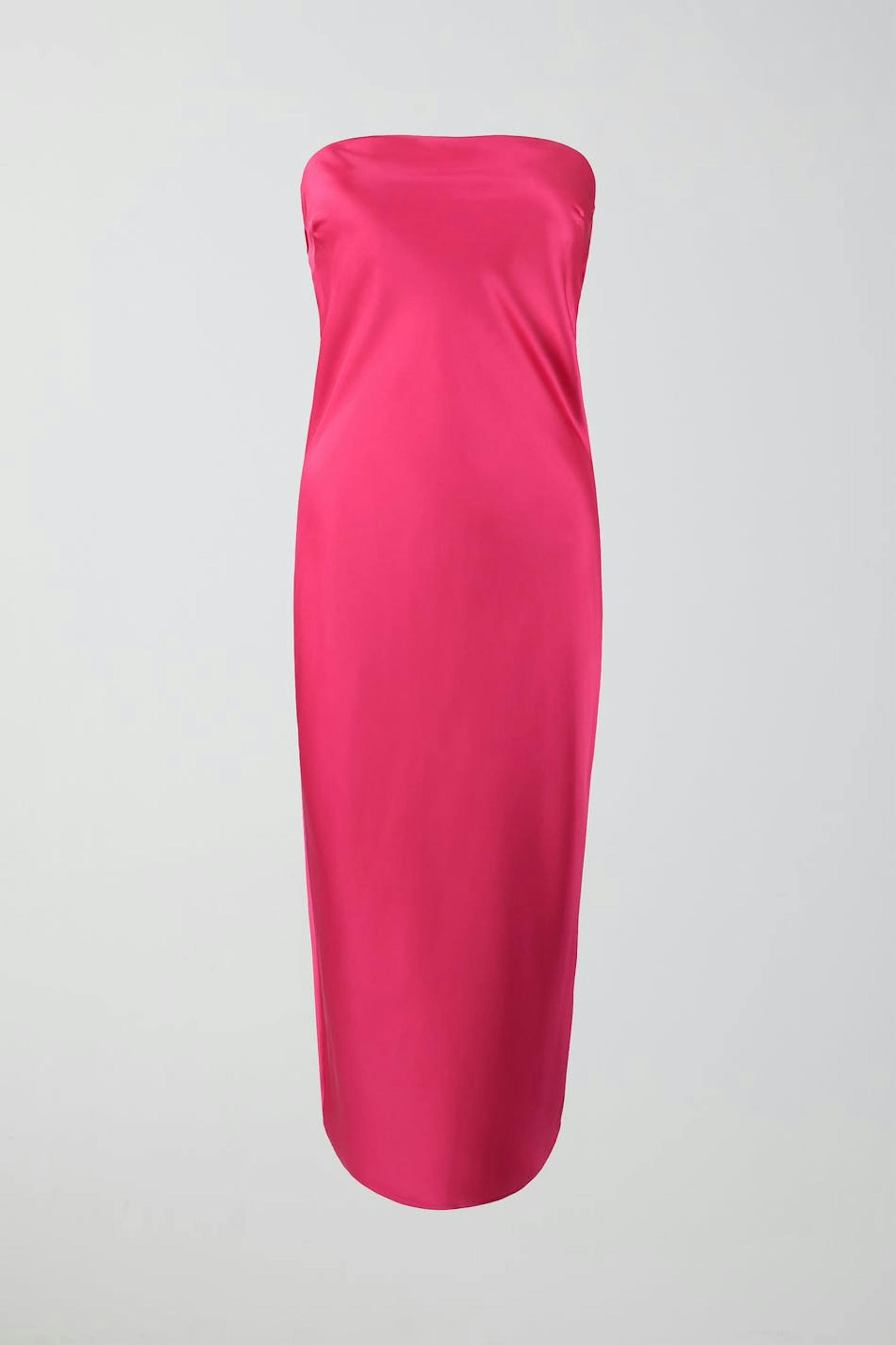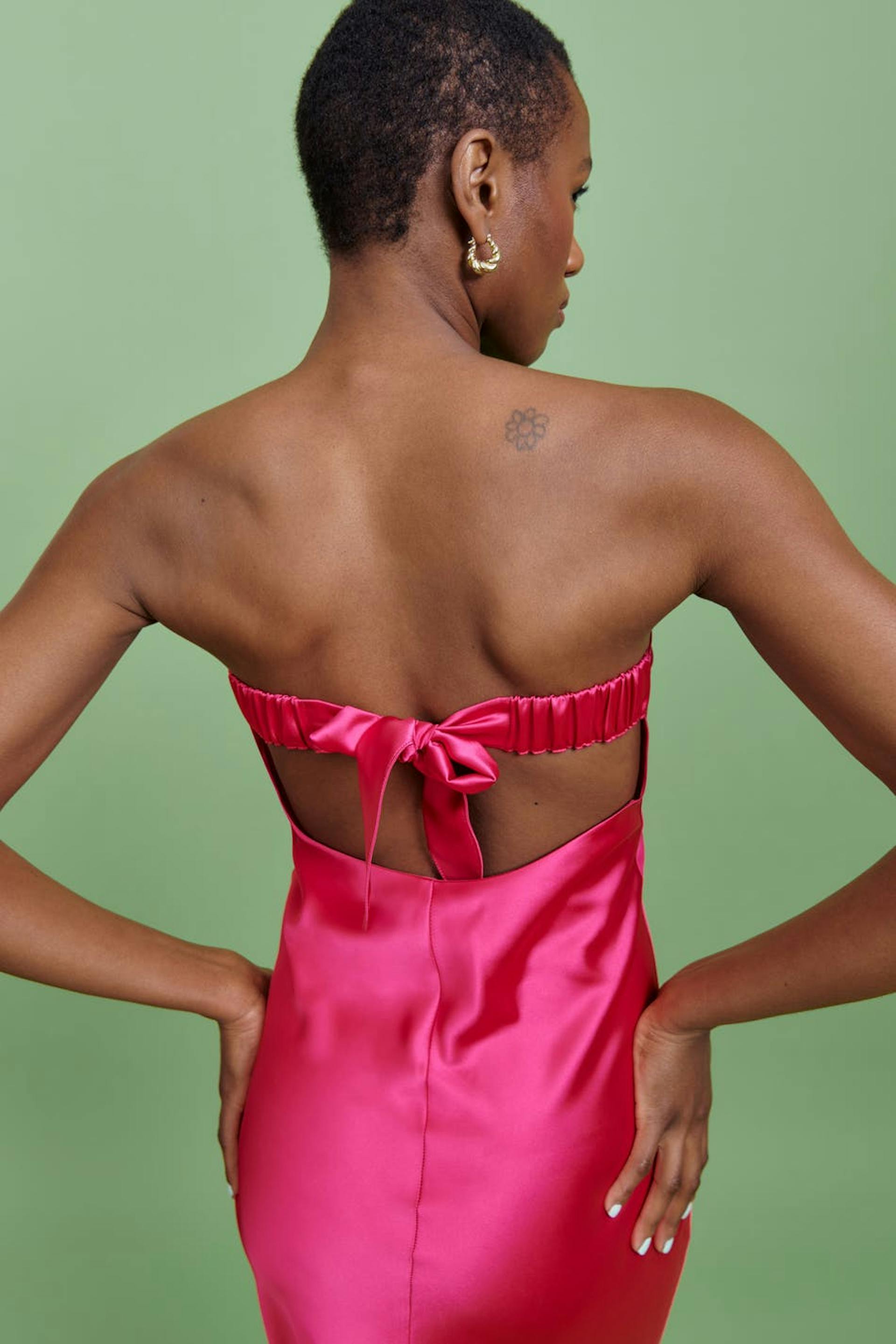 Tube dress in satin with slit at the back. The dress is pink and has fitted fit. It has gathered elastic strap in the back with bow detail.