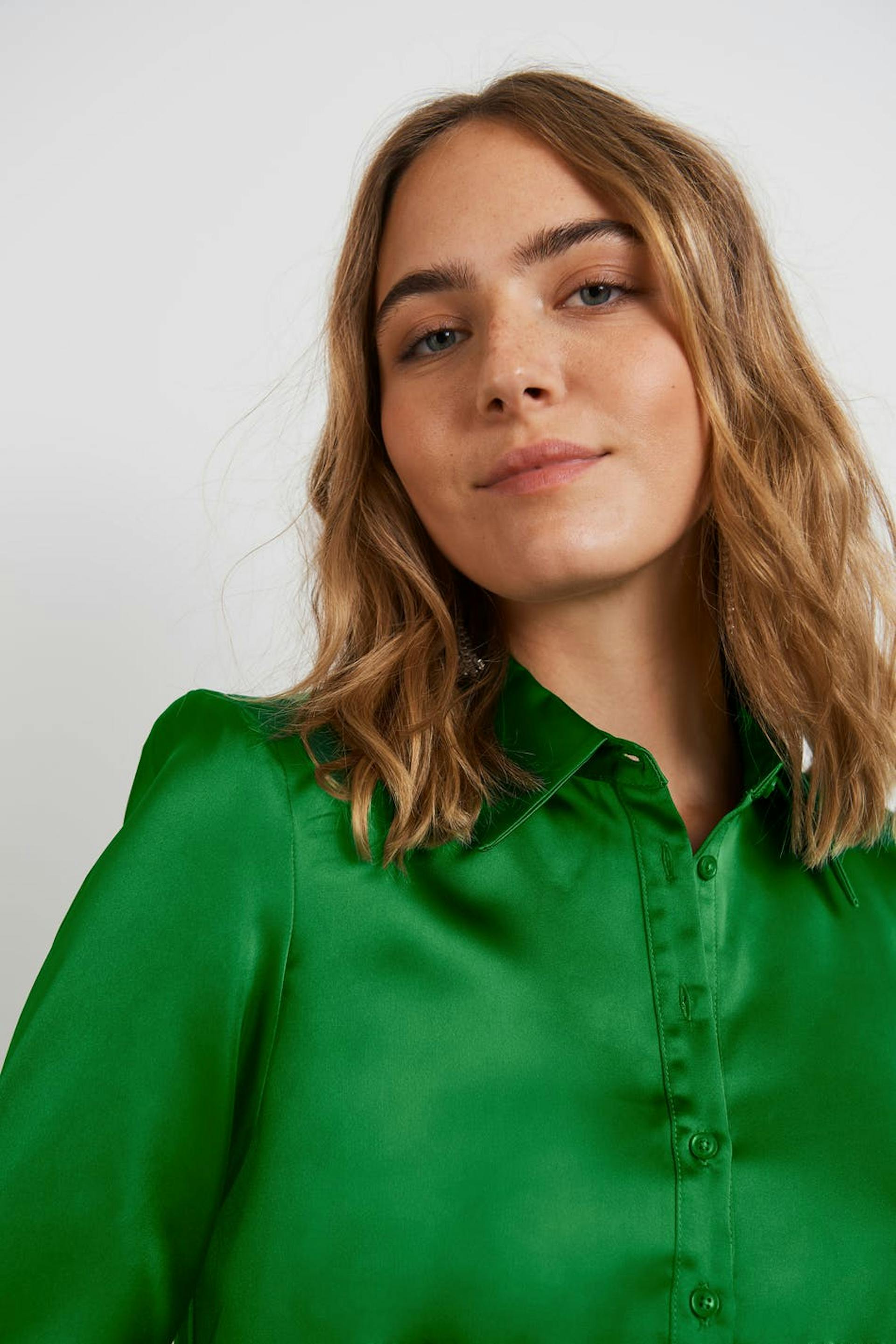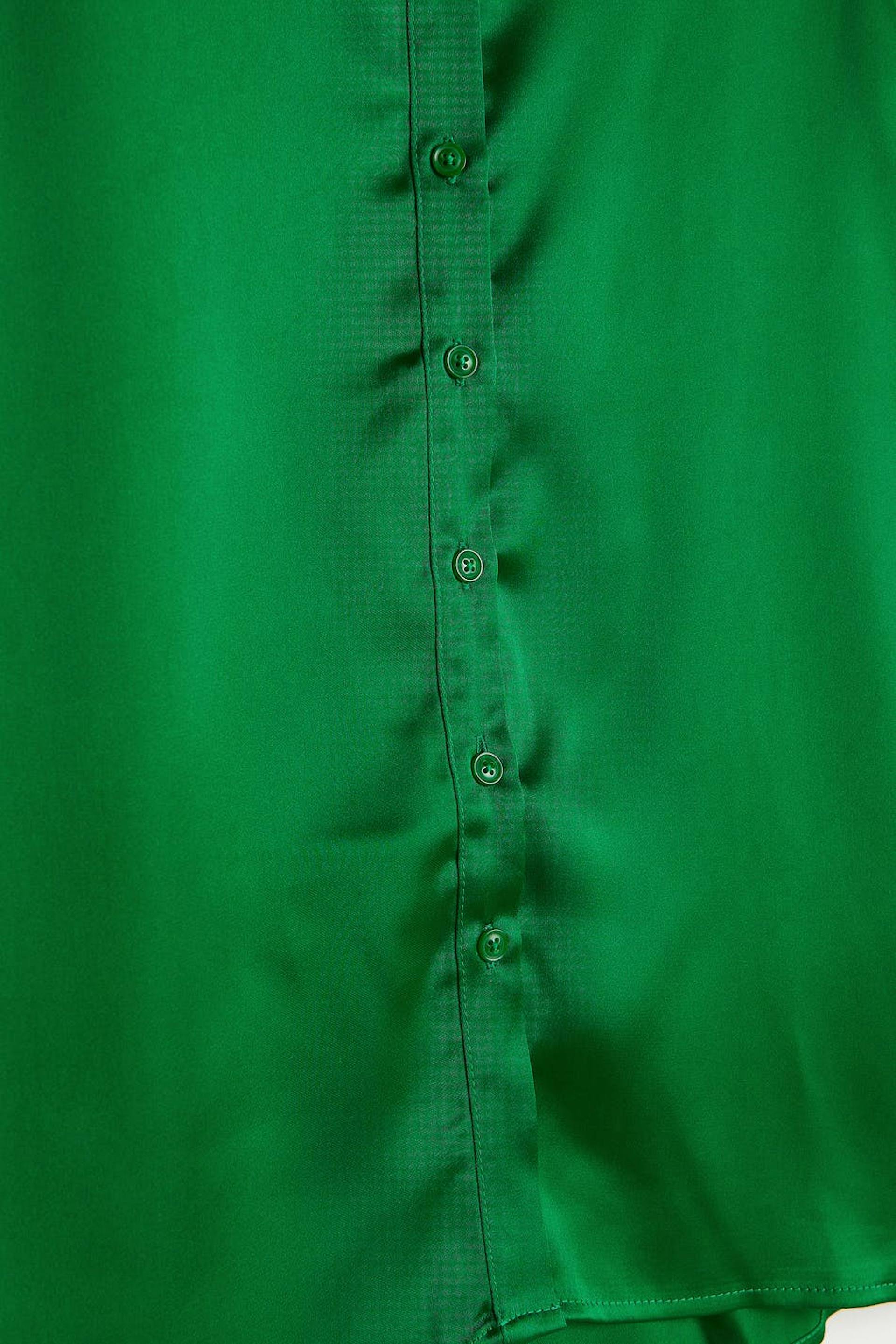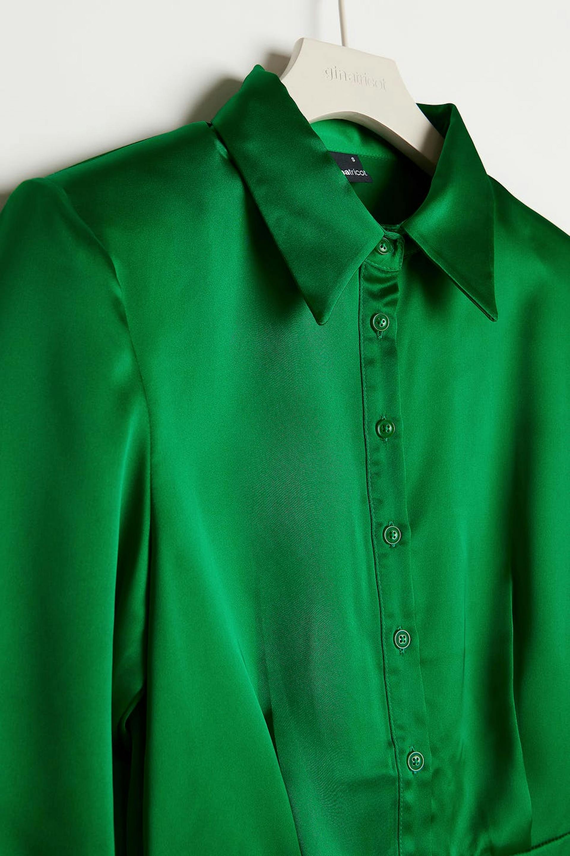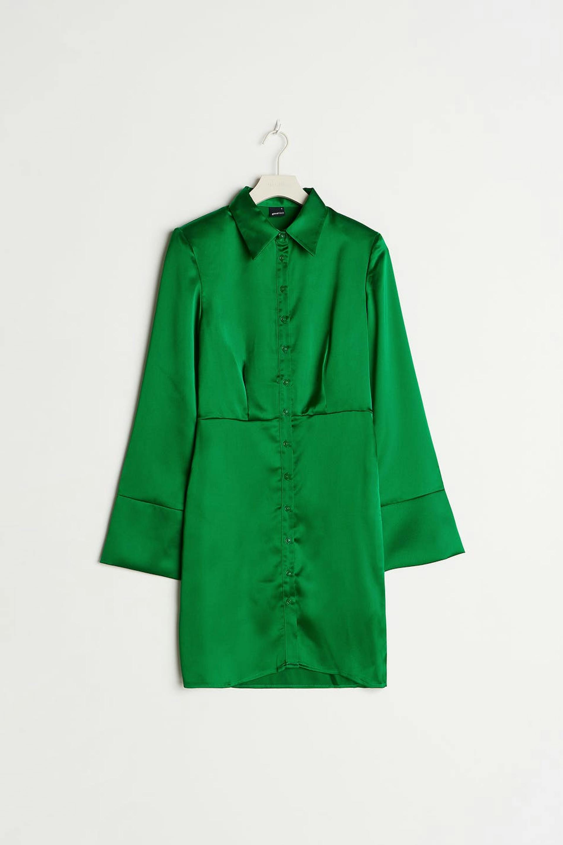 Short shirt dress with long puff sleeves. The dress is perfect for the party and green and has button placket at the front. It is made of satin.