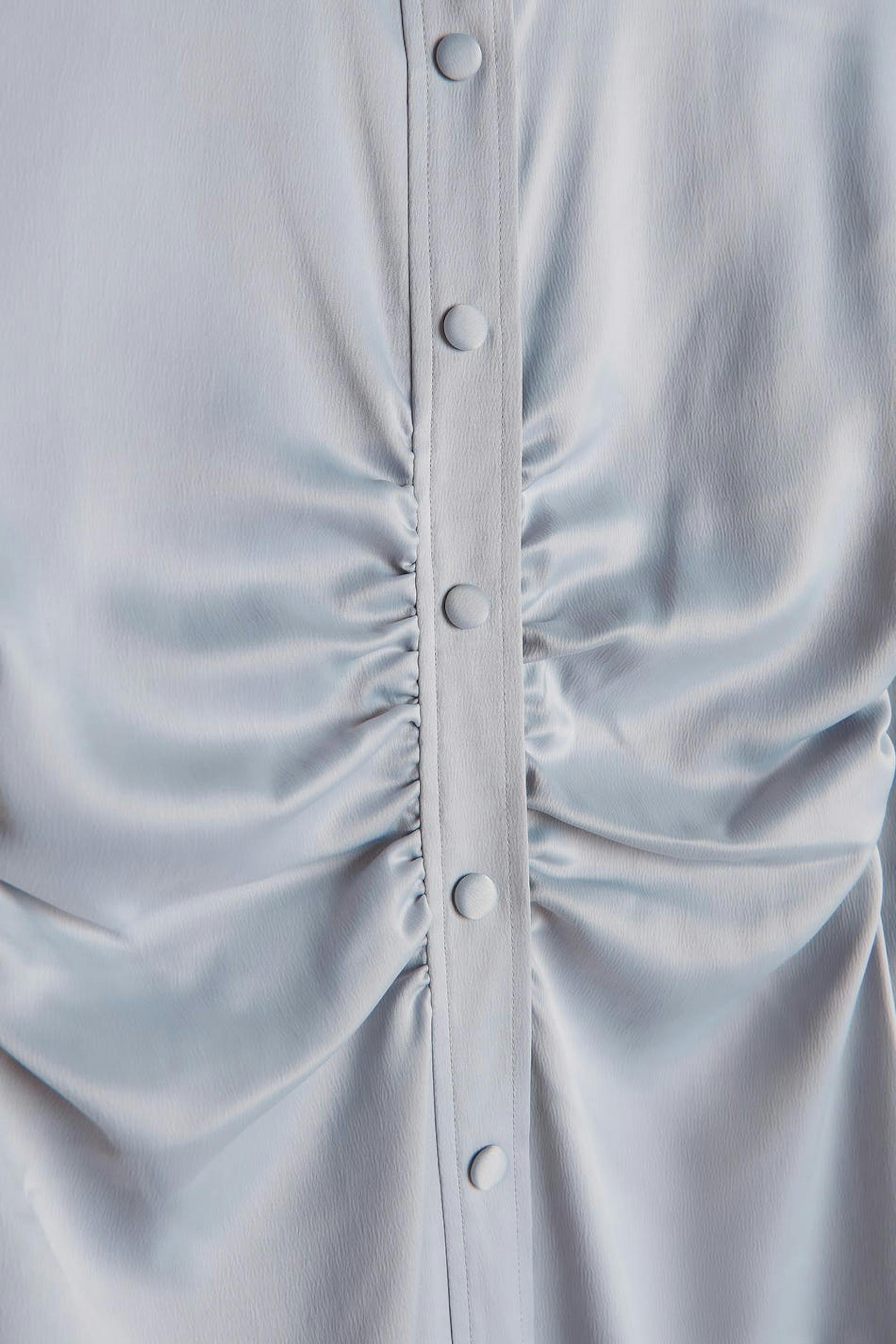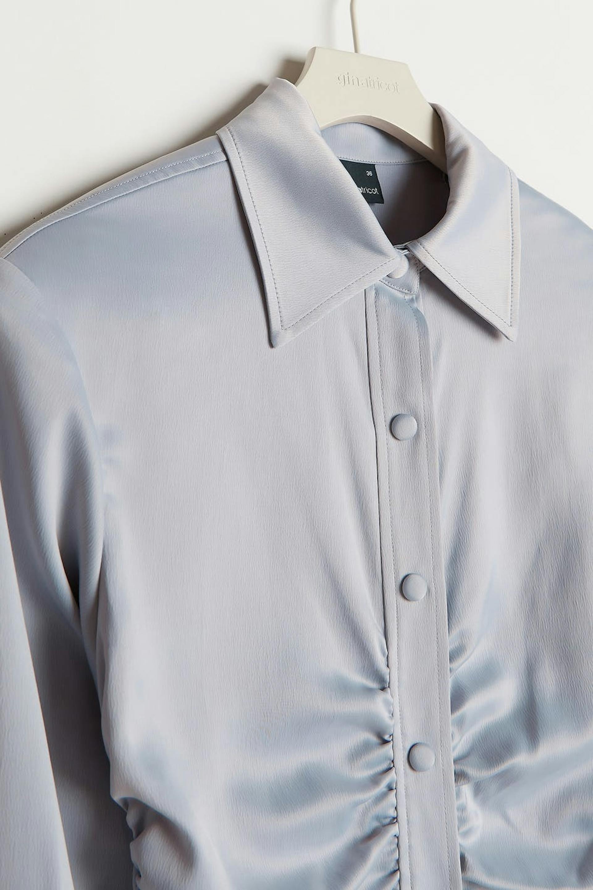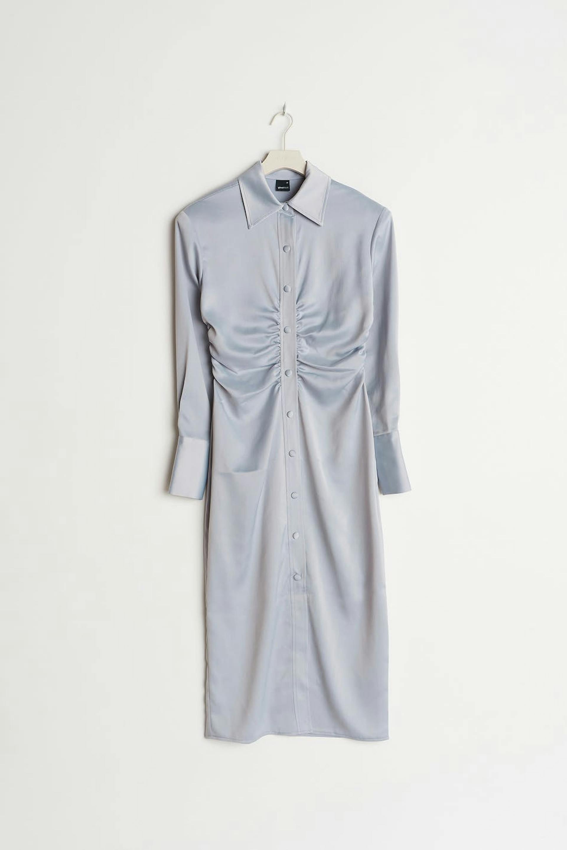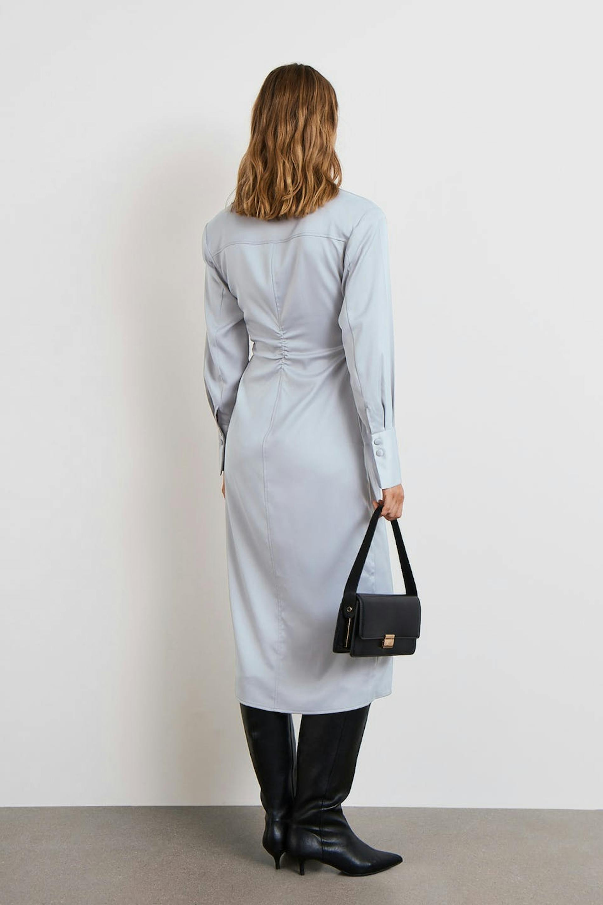 Satin shirt dress with gathered details. The dress is perfect for the party, silver coloured and long-sleeved. It has a pointy collar, button closure in front, midi length and cuffs with button placket.