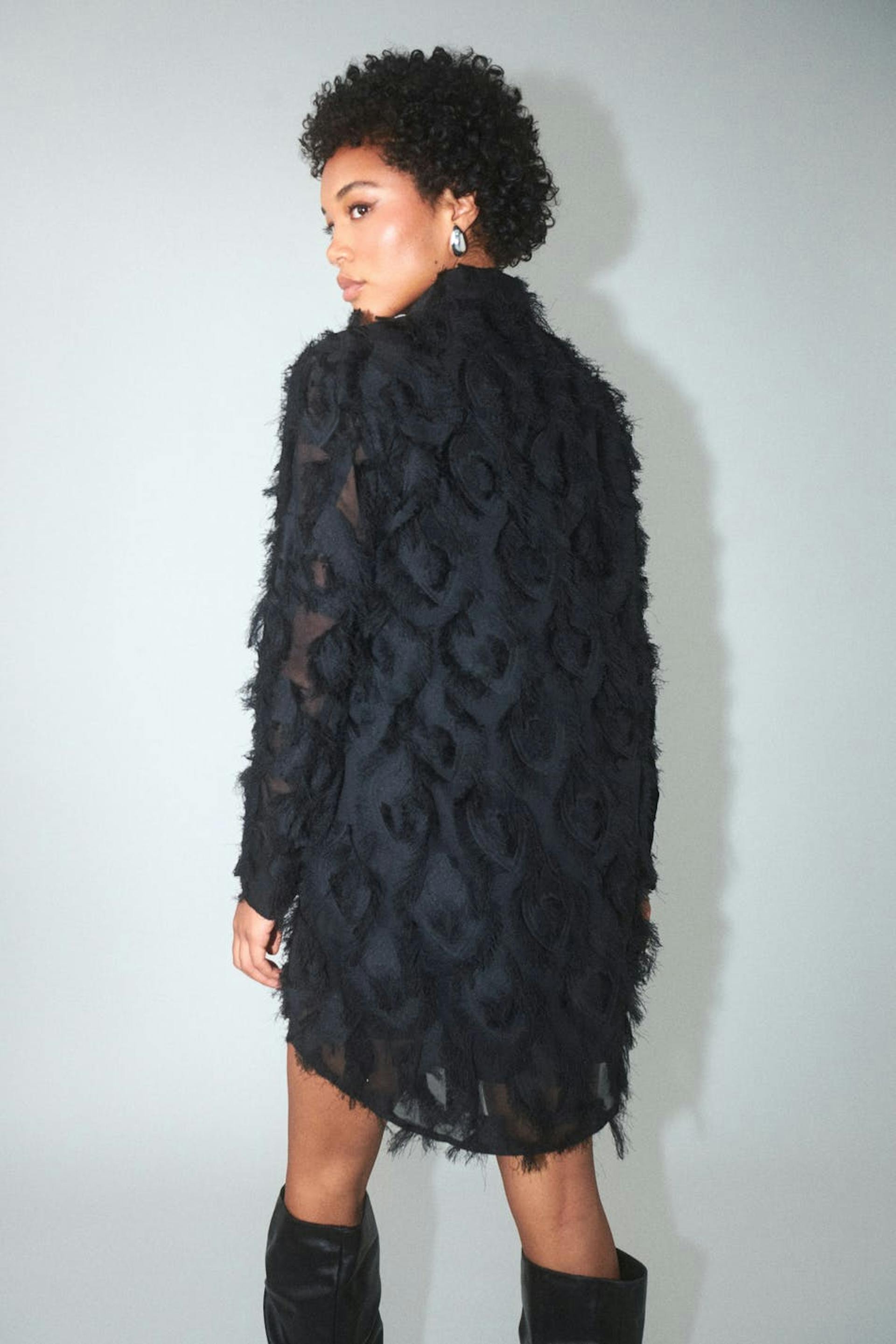 Oversized shirt dress with fluffy quality. The dress is black and has loose-fitting style. It has buttoning at the front and long sleeve with button and cuff.