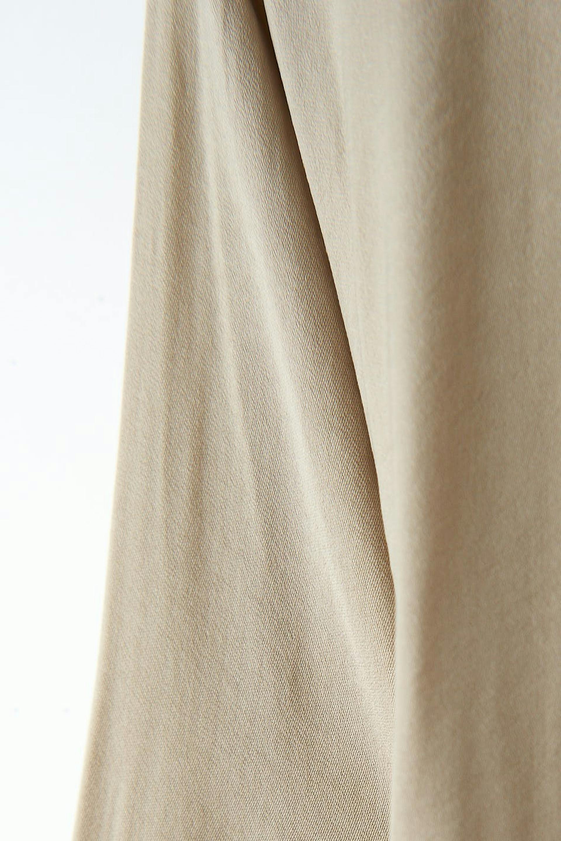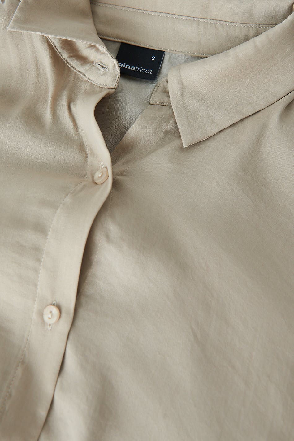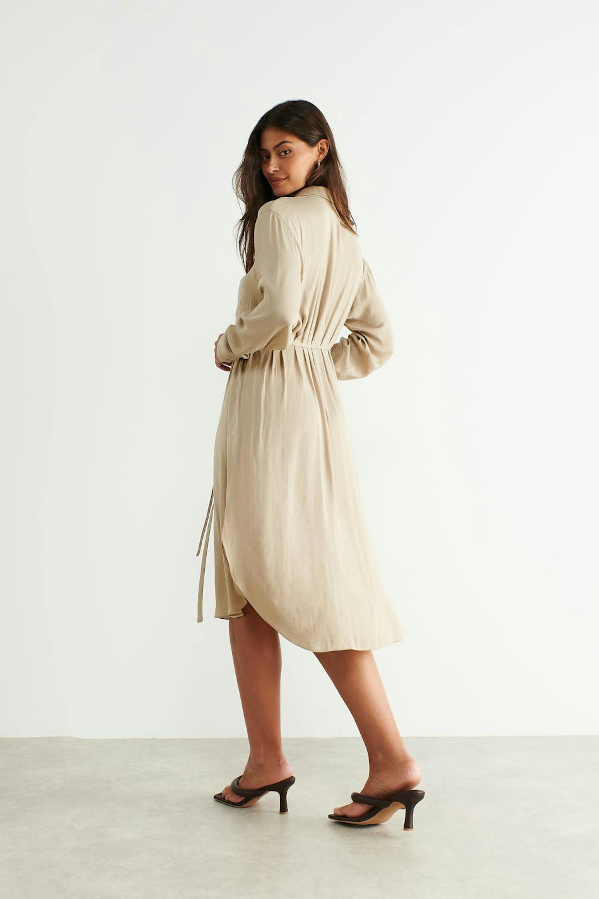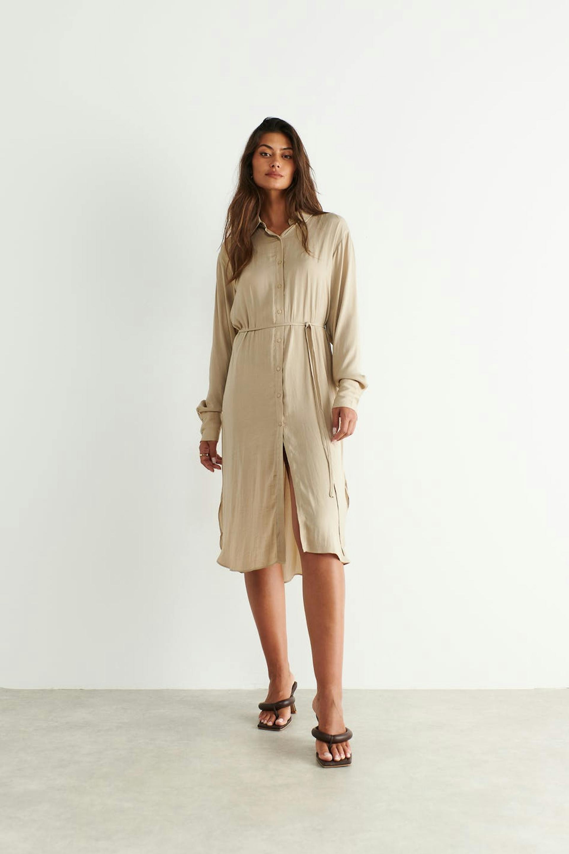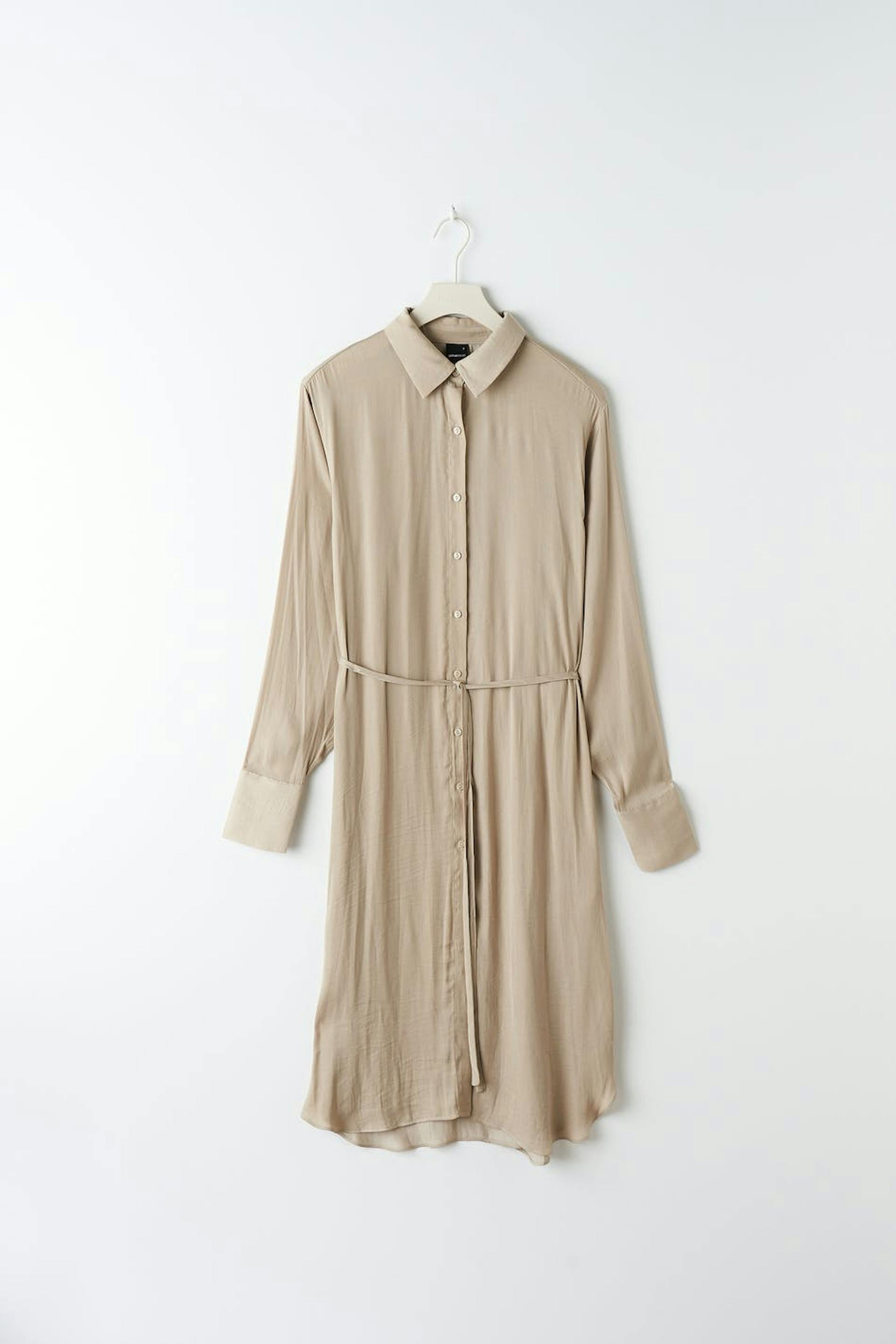 Long-sleeved shirt dress in satin with an oversize fit. The dress is beige and has button placket in front.