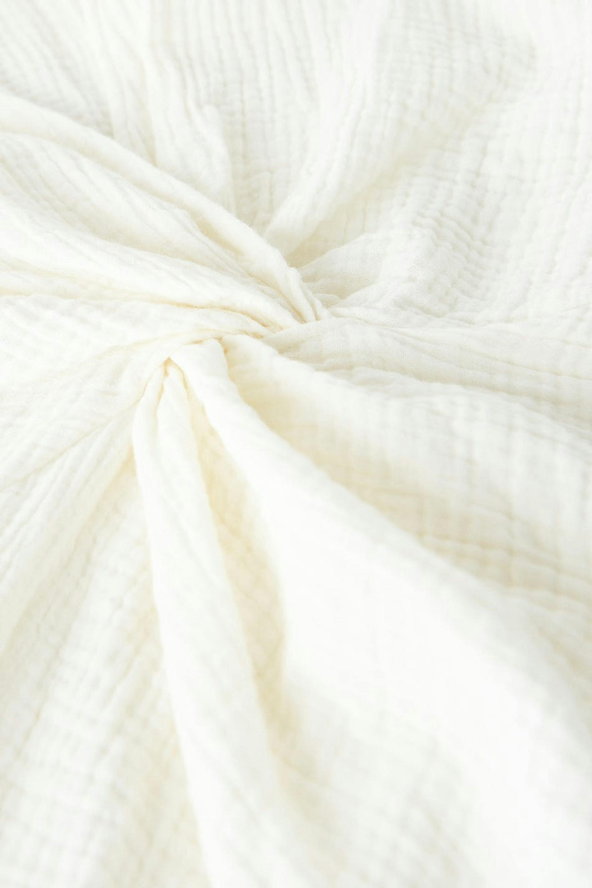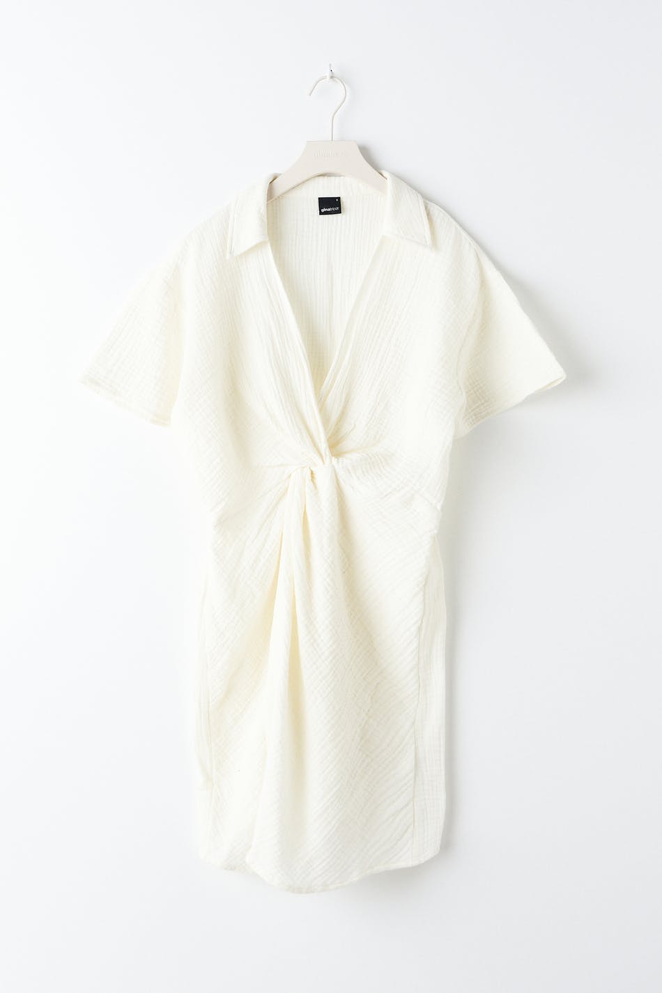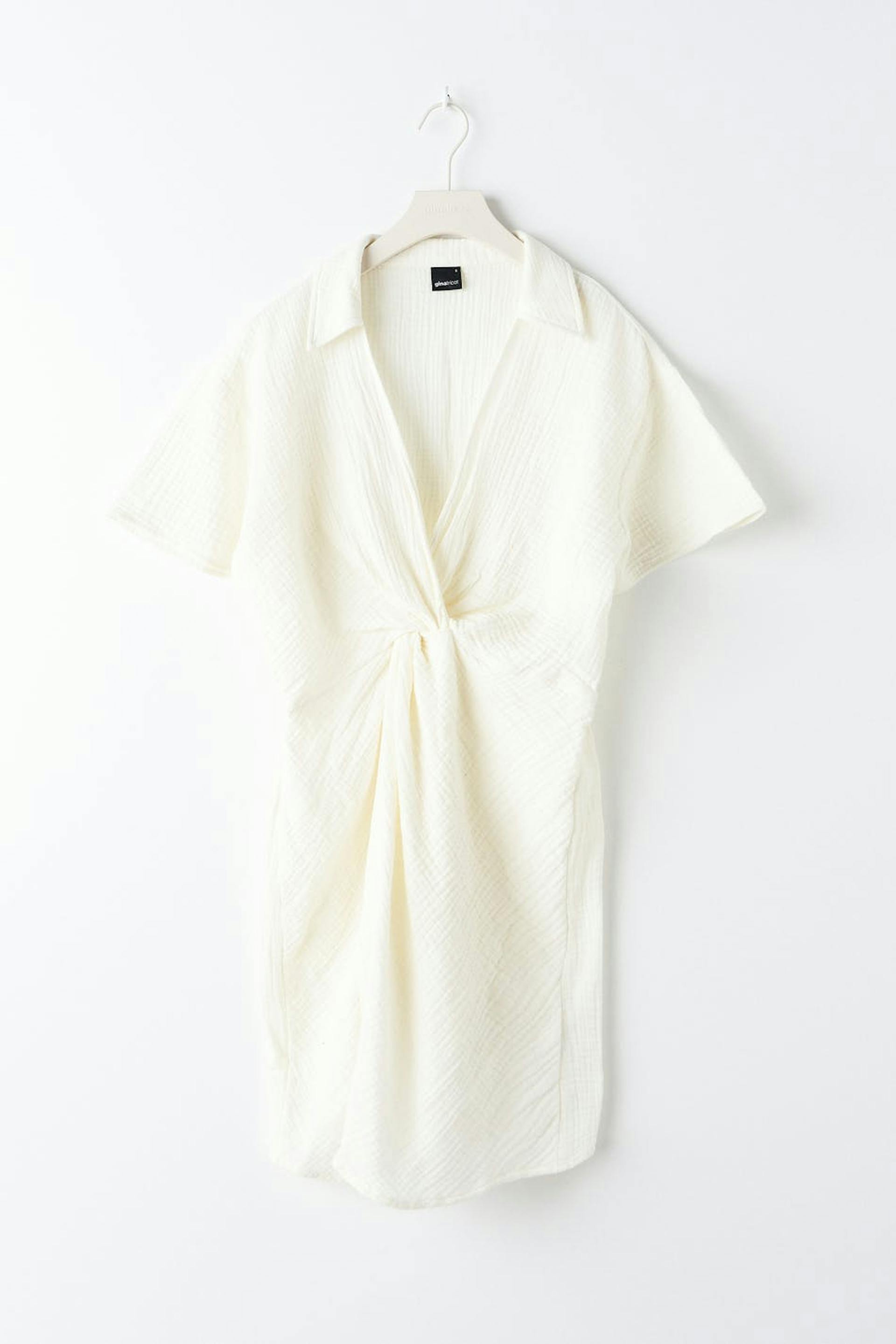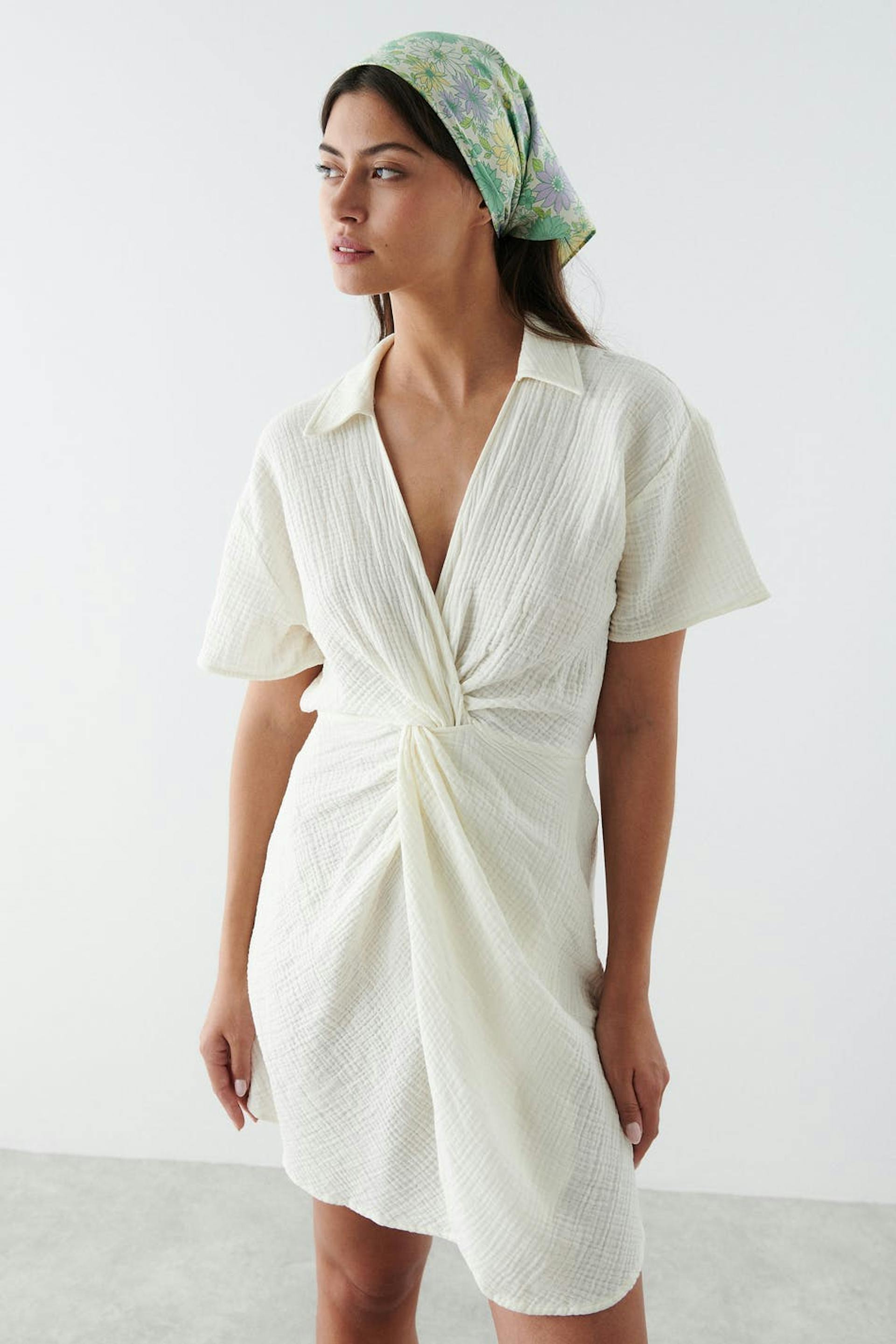 Short dress with a twisted knot detail at the front. The dress is white and has short sleeves. It has a collar, a v neckline and a soft cotton quality.