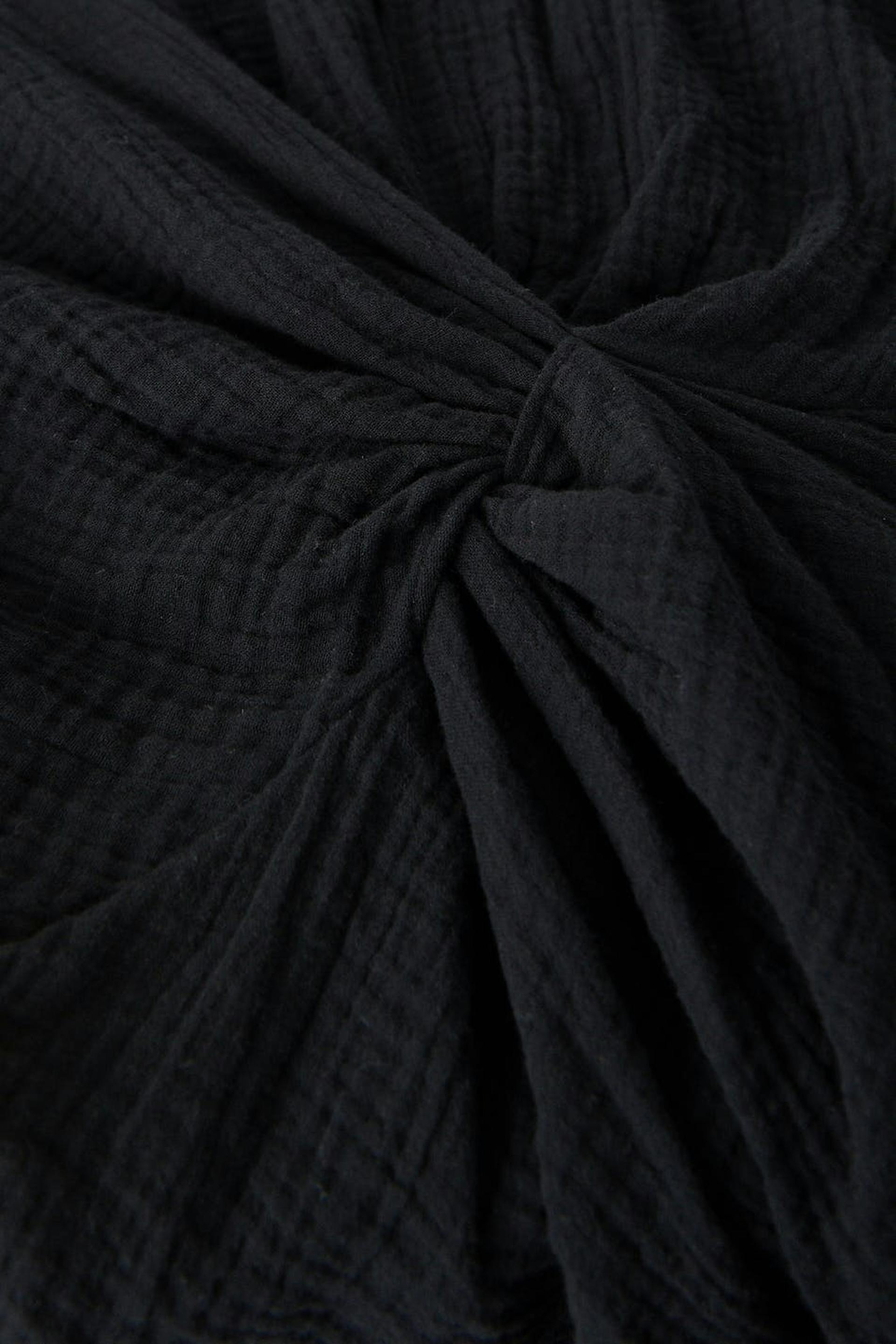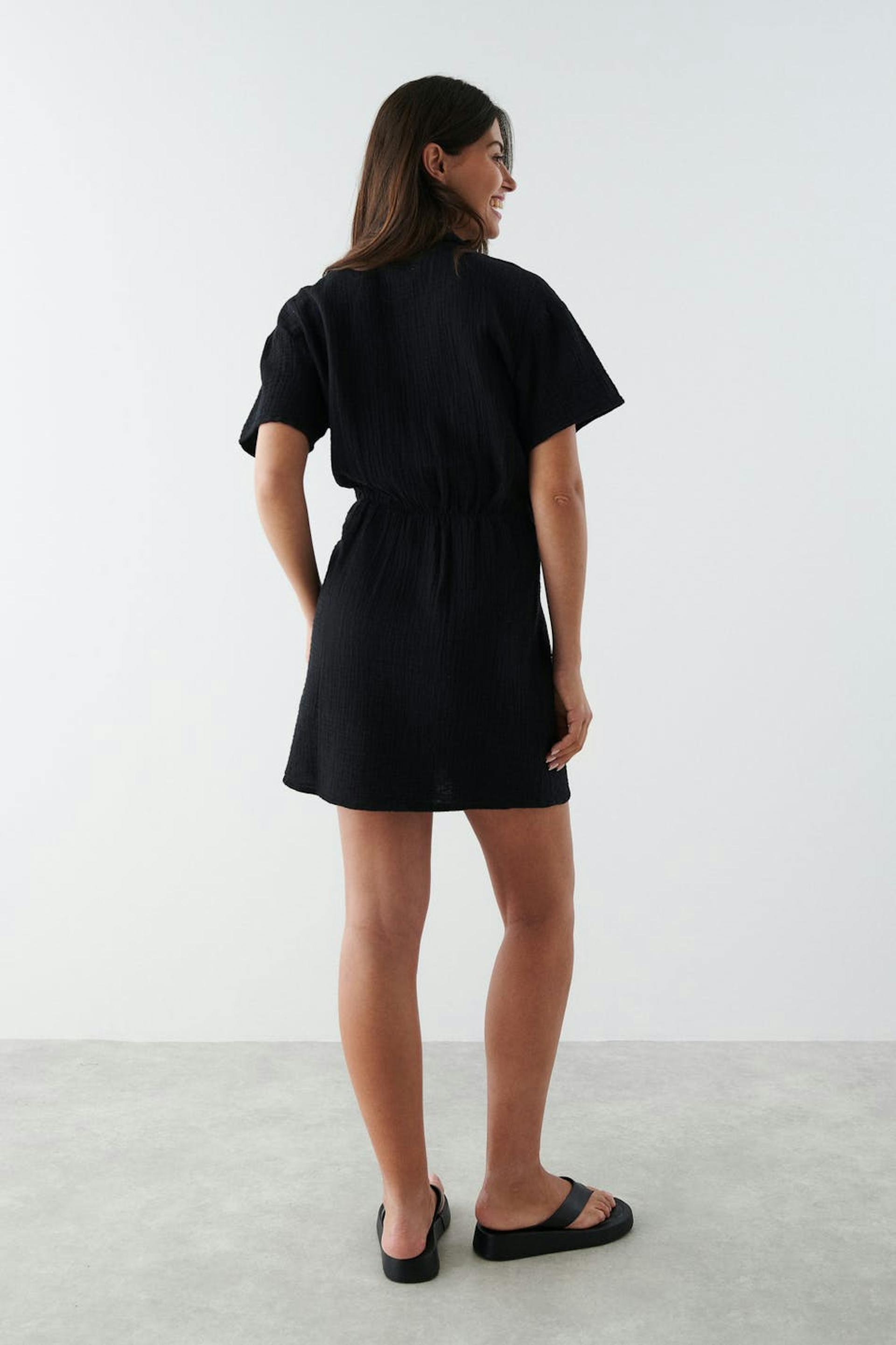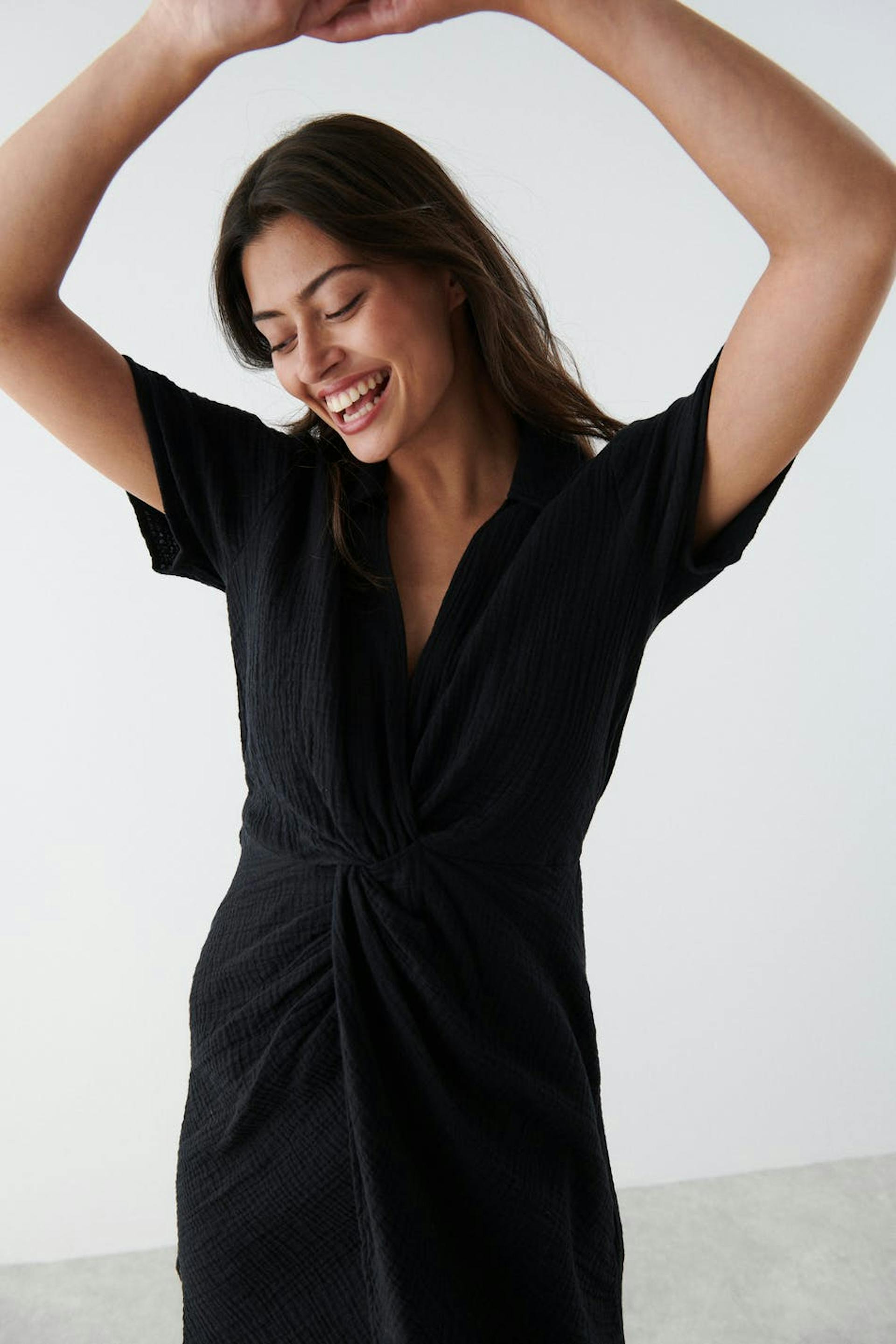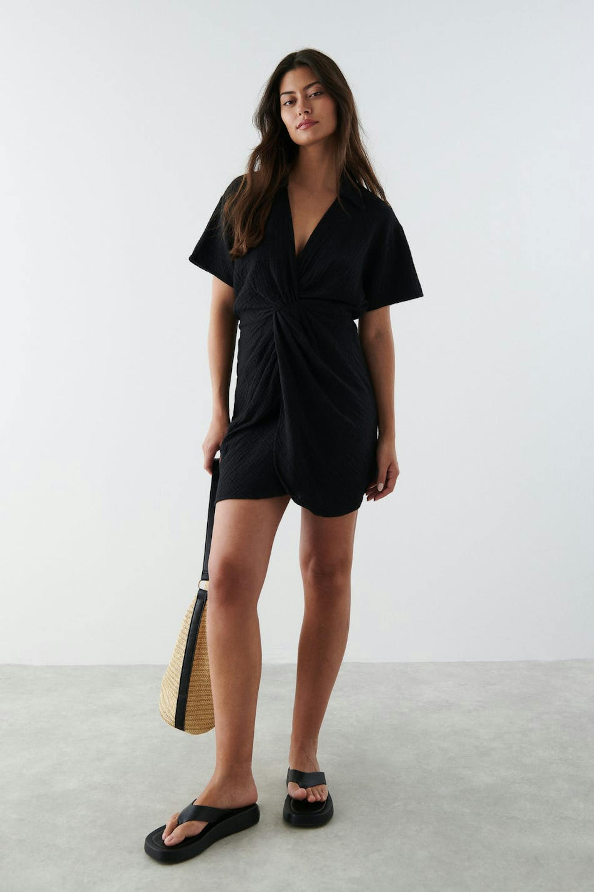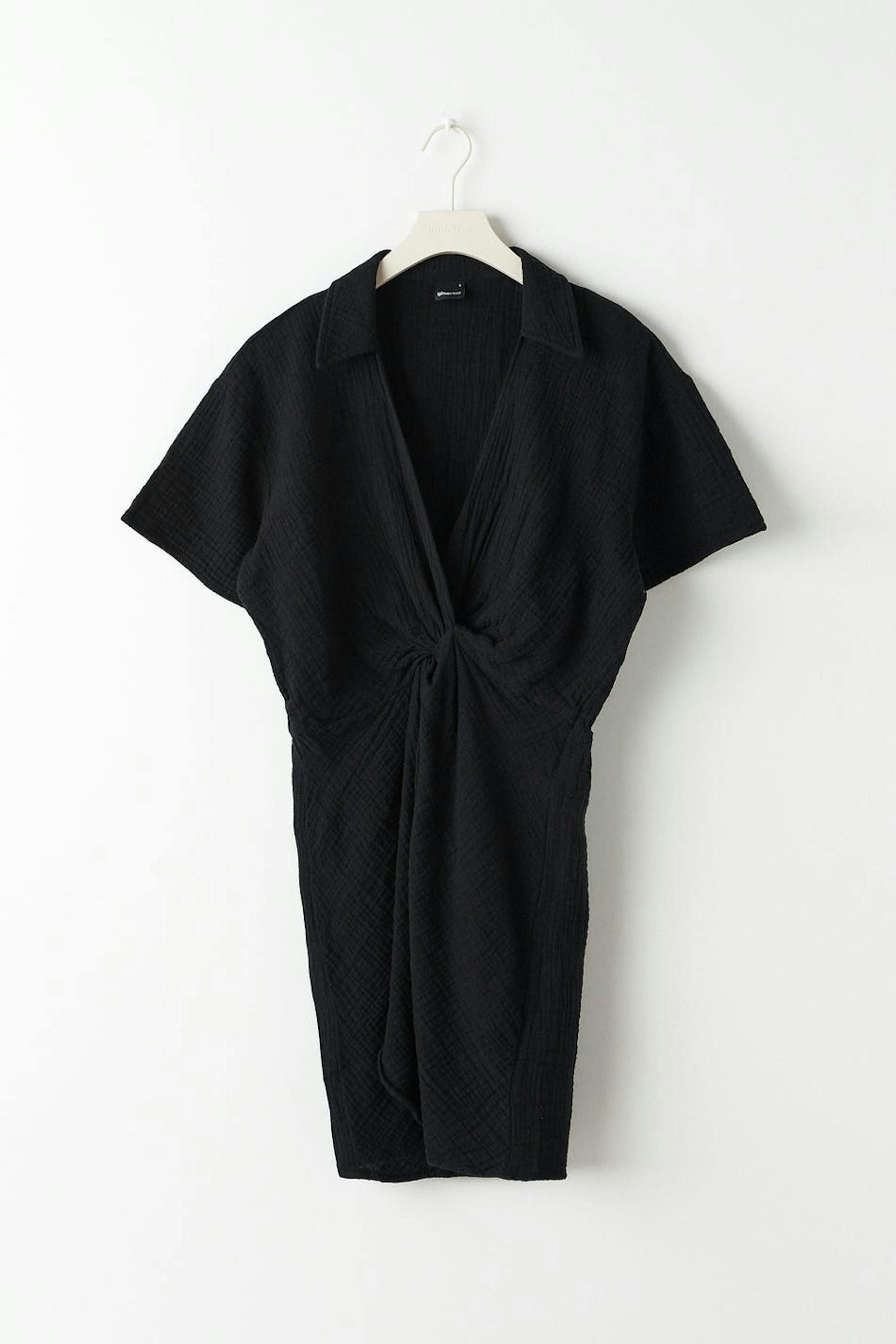 Short dress with a twisted knot detail at the front. The dress is black and has short sleeves. It has a collar, a v neckline and a soft cotton quality.