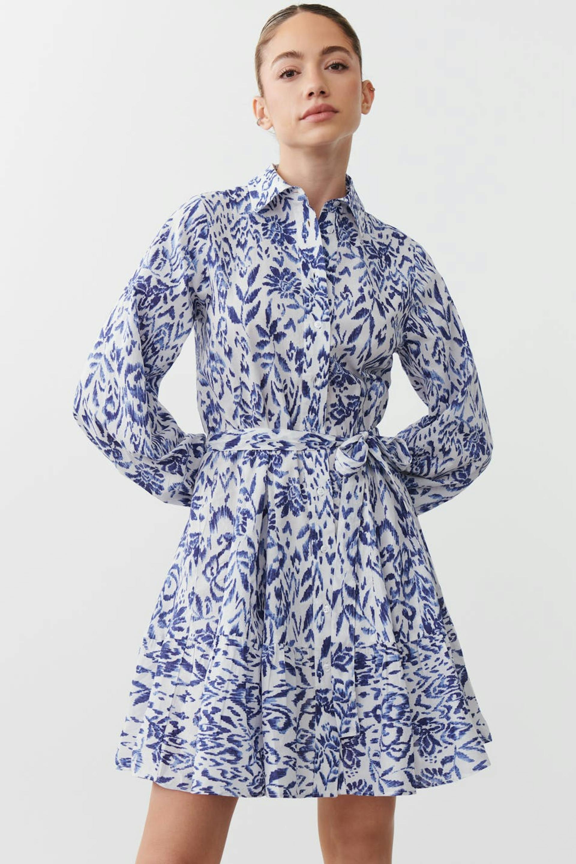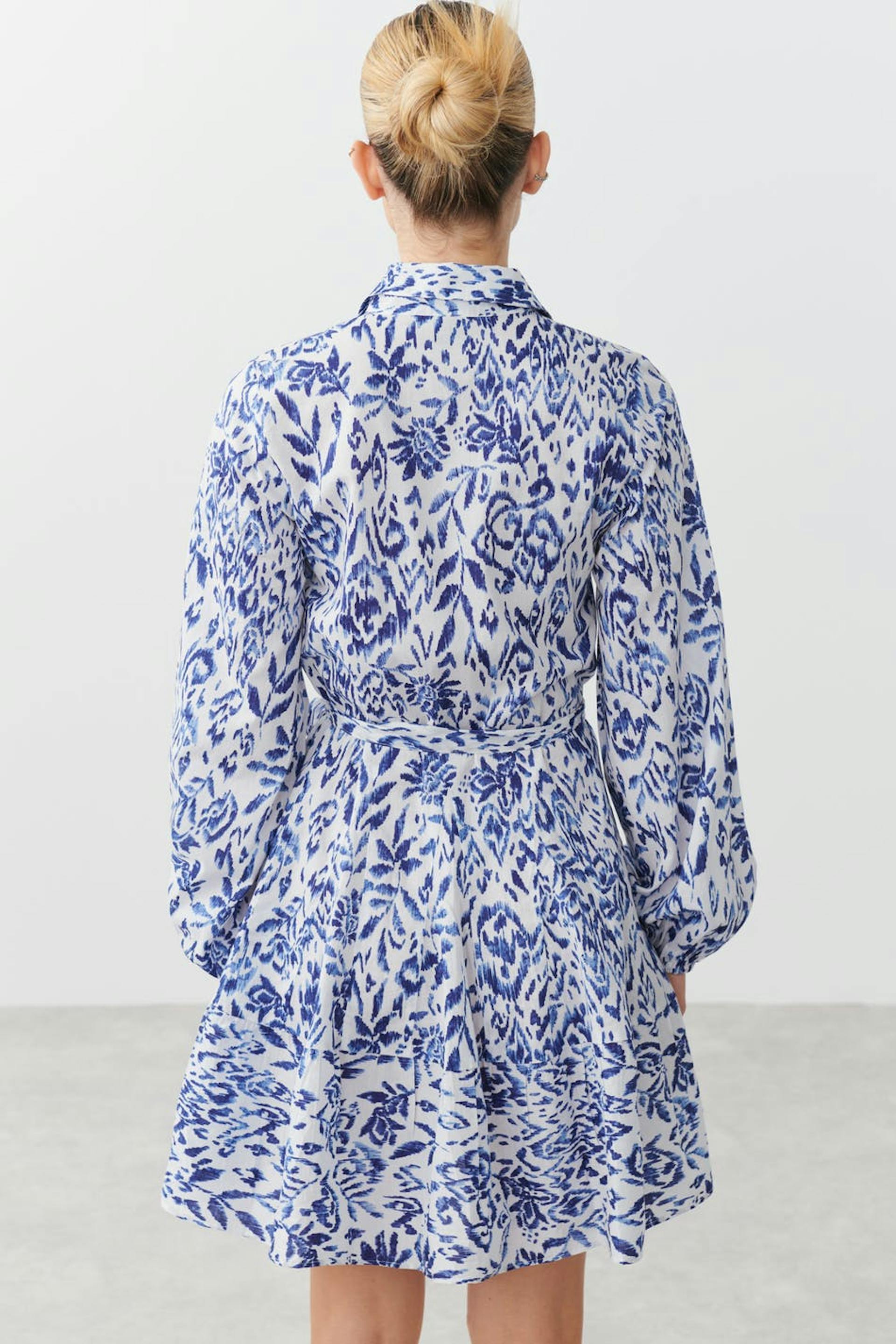 Patterned shirt dress with tie belt at the waist. The dress is blue, white and long-sleeved. It has flounces at the bottom, collar, buttoning at the front, fitted waist and elasticized cuffs.
