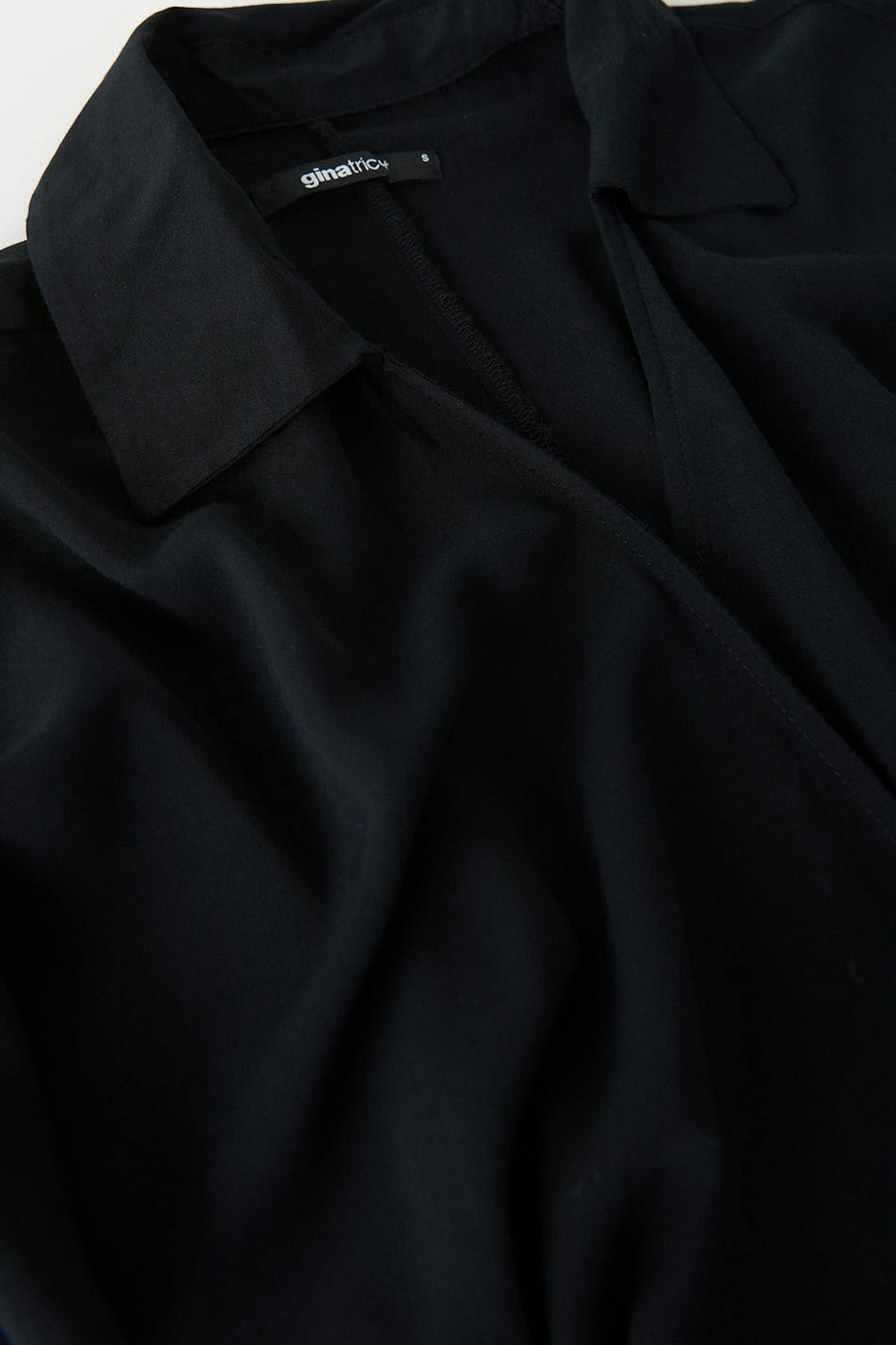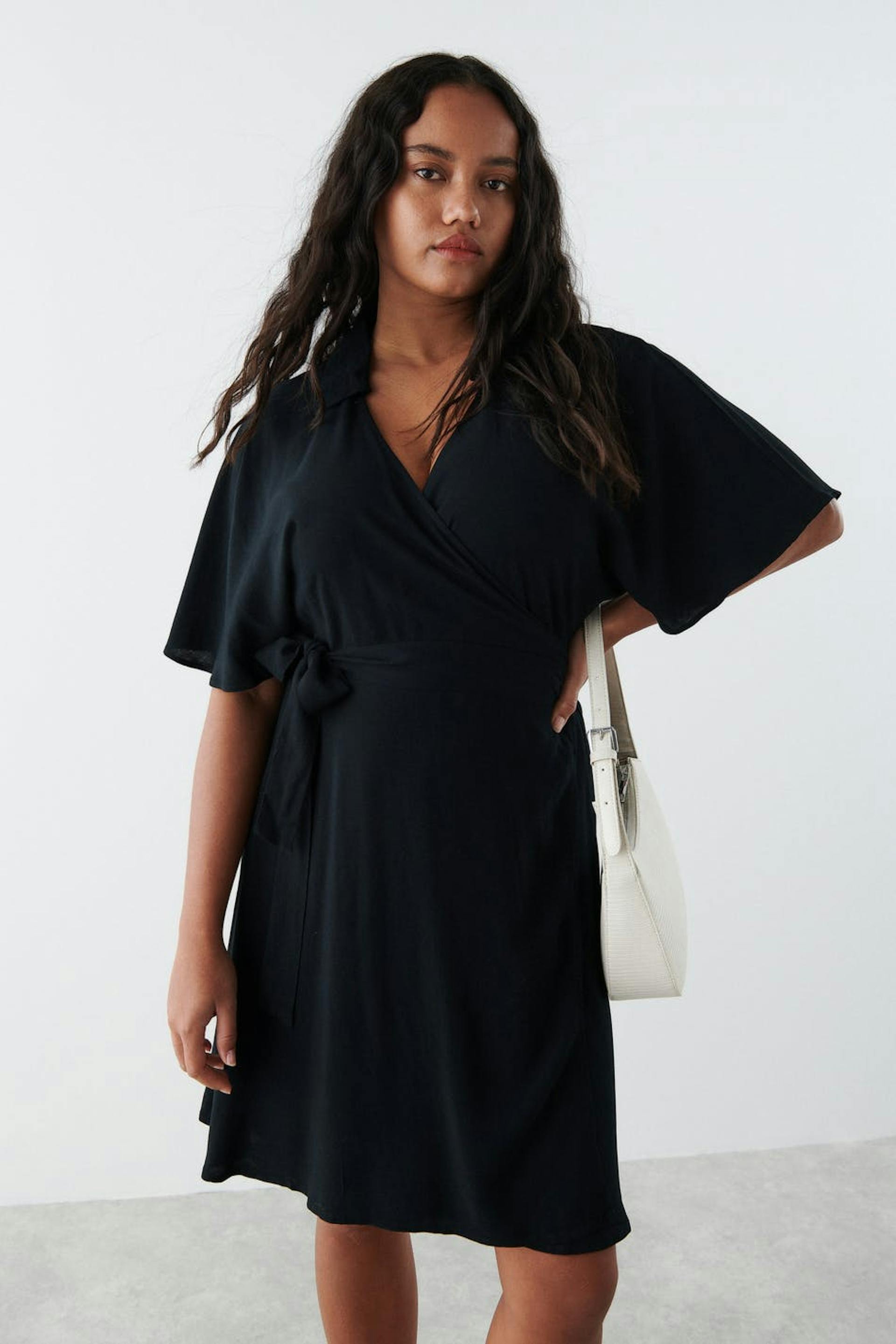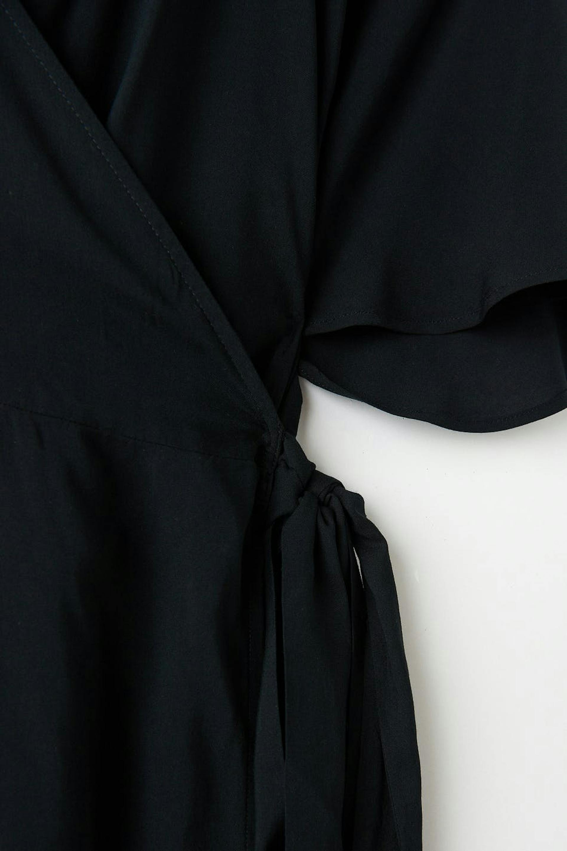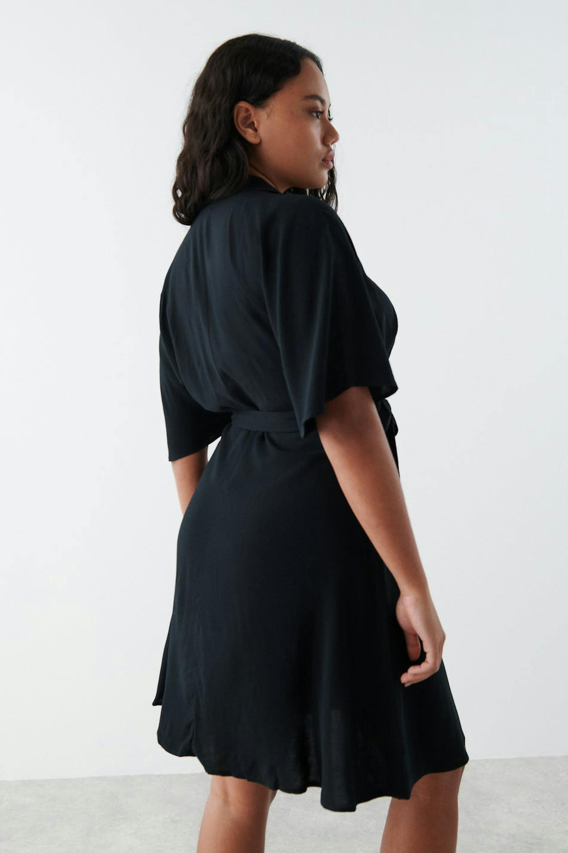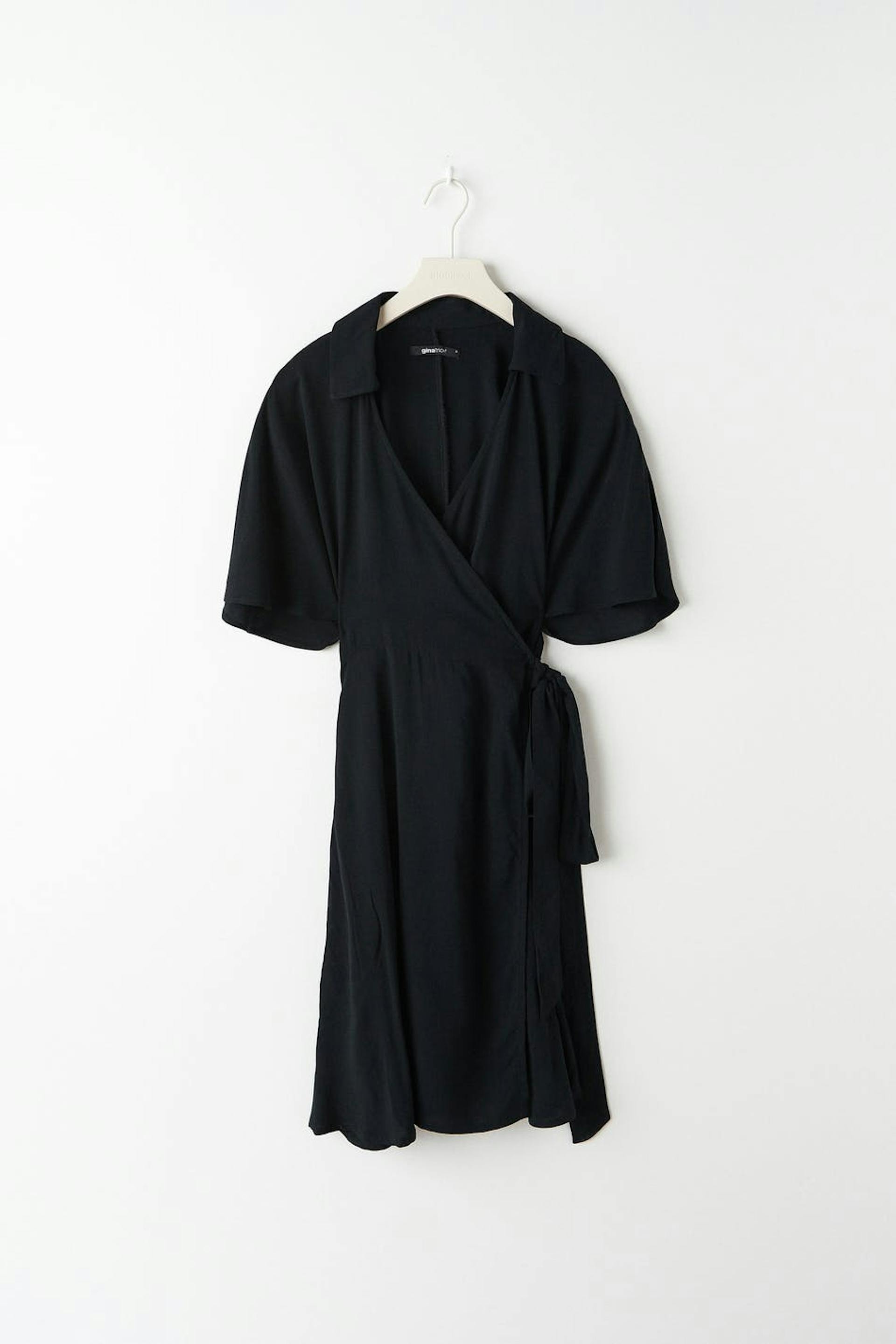 Short wrap front dress with self-tie at the side. The dress is black and short-sleeved and has v-neck cut.