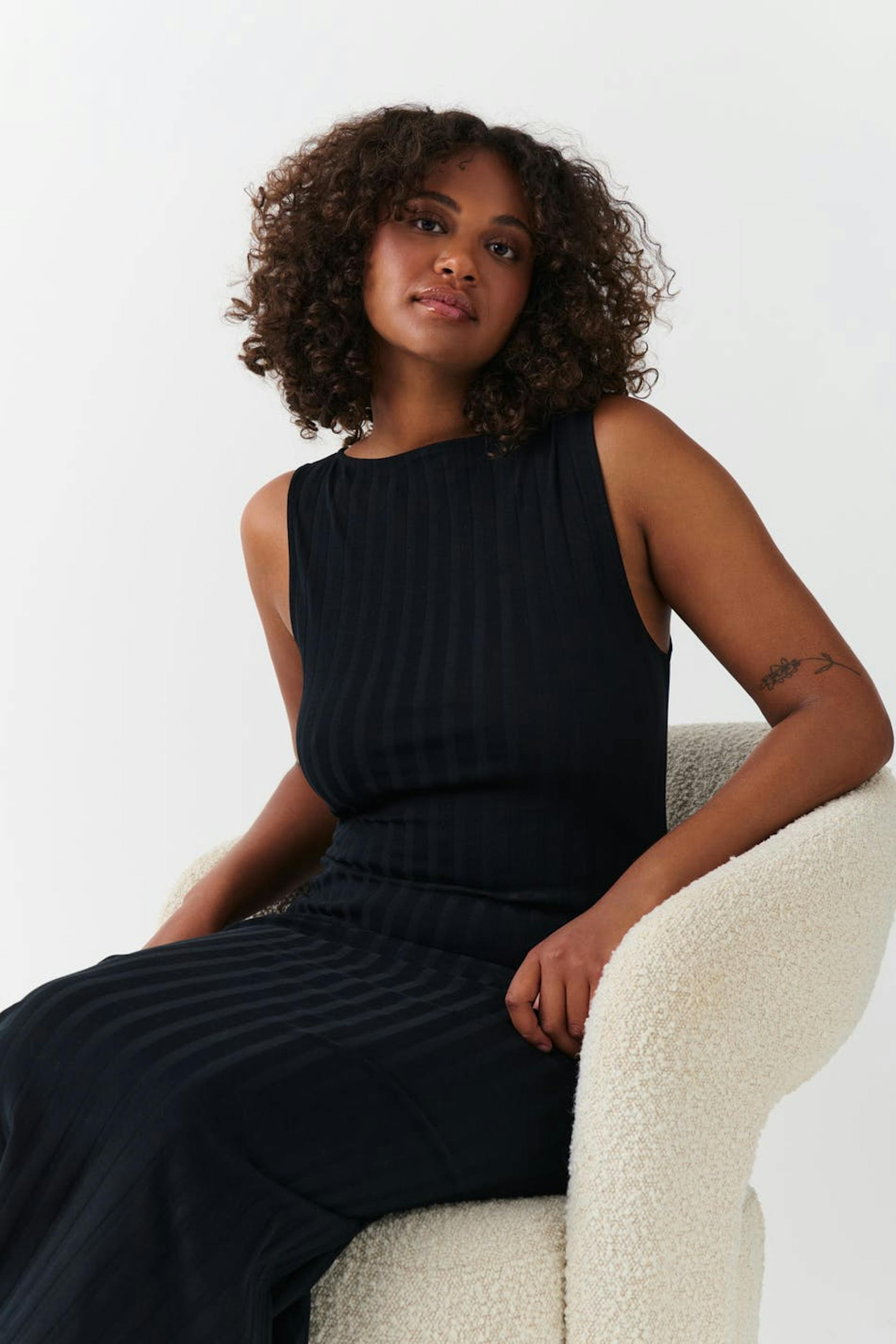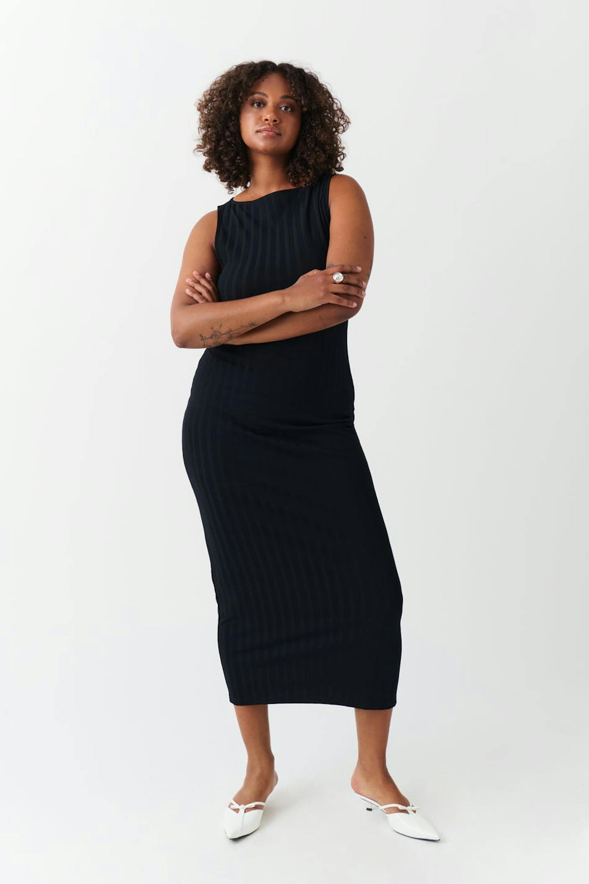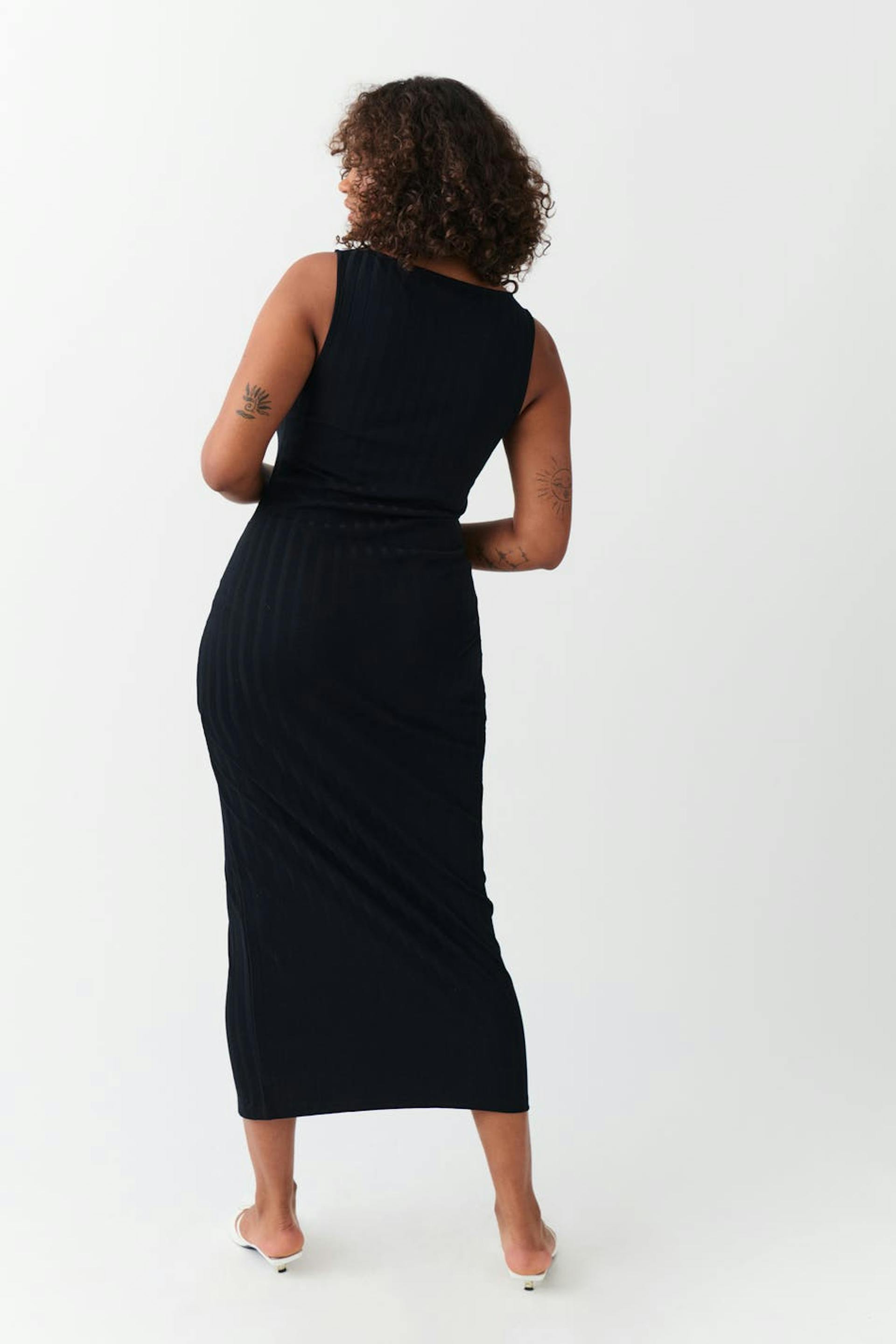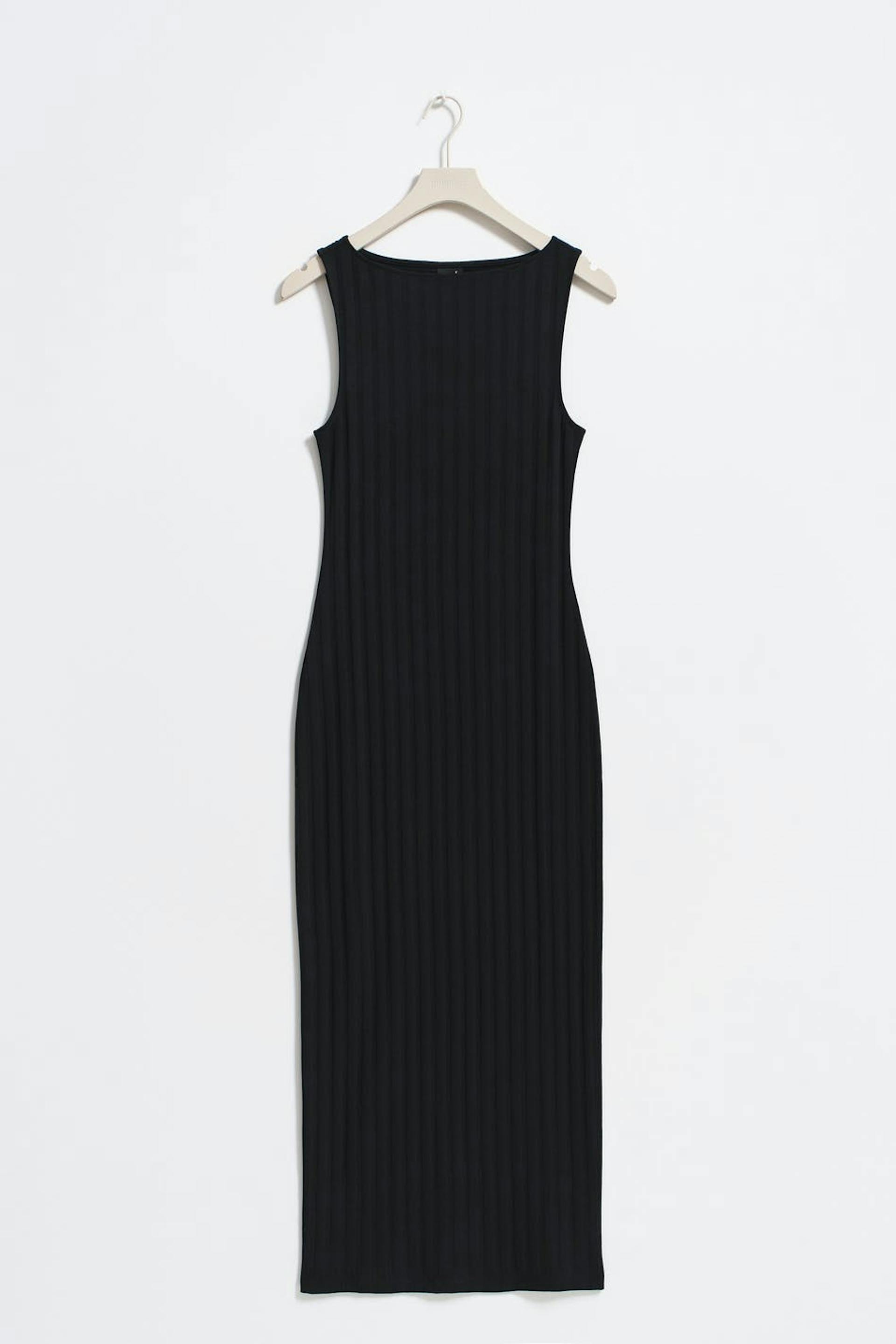 Sleeveless dress with a regular fit. The dress is black and has boat neckline. It has figure-hugging fit, ribbed quality and midi length.