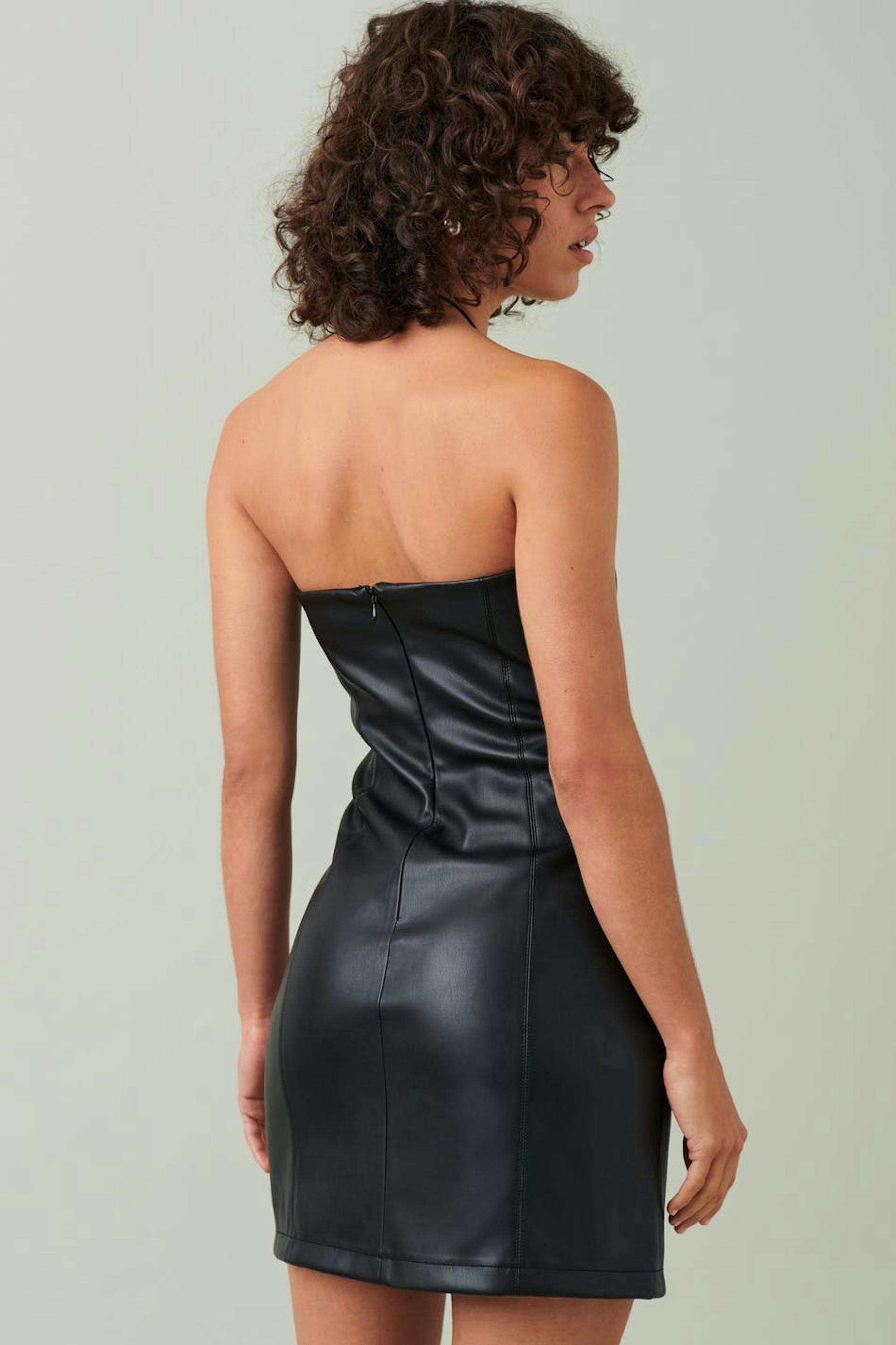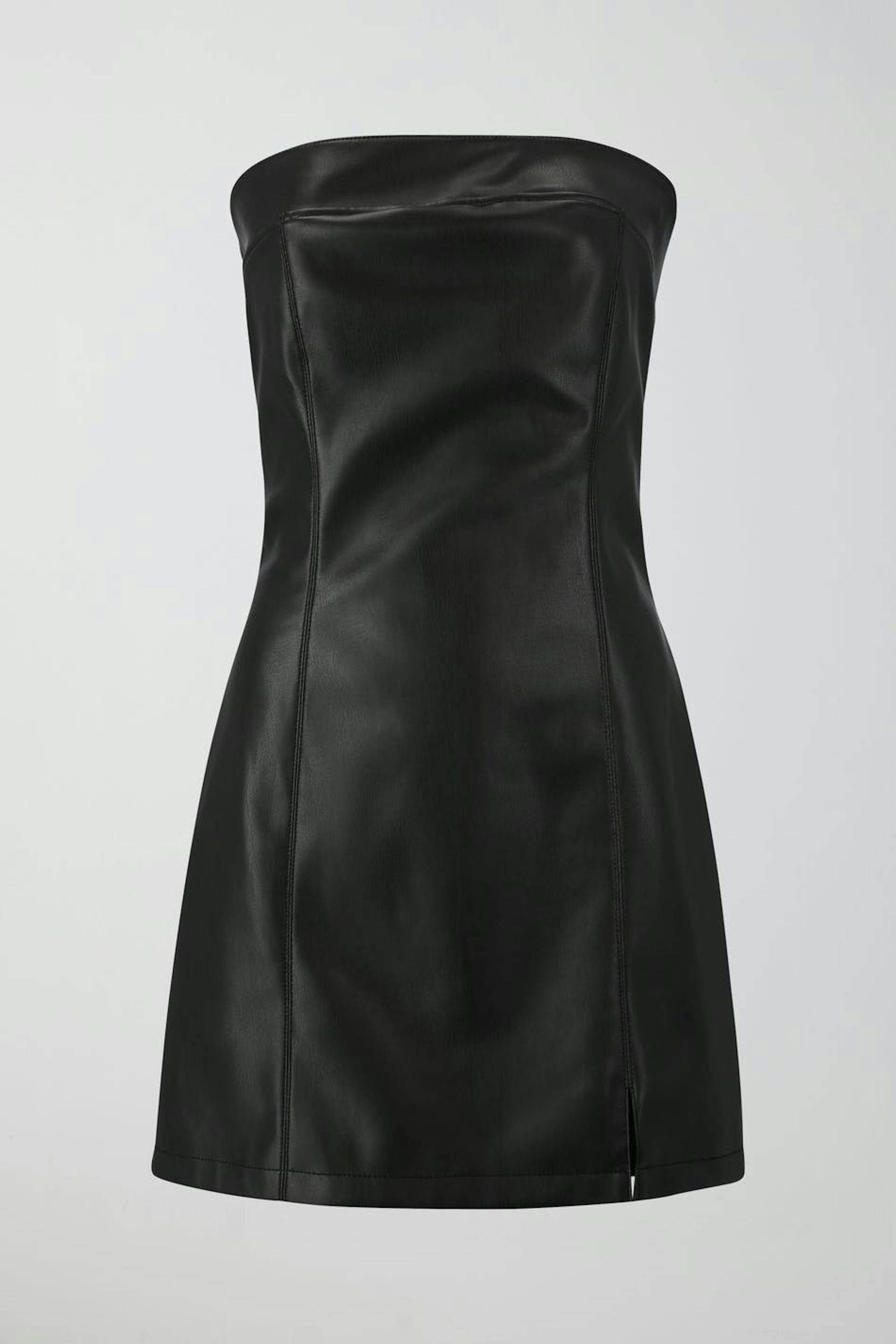 Short tube dress in imitation leather with figure-hugging fit. The dress is black and has zip in the back. It has concealed silicone trim at the top.