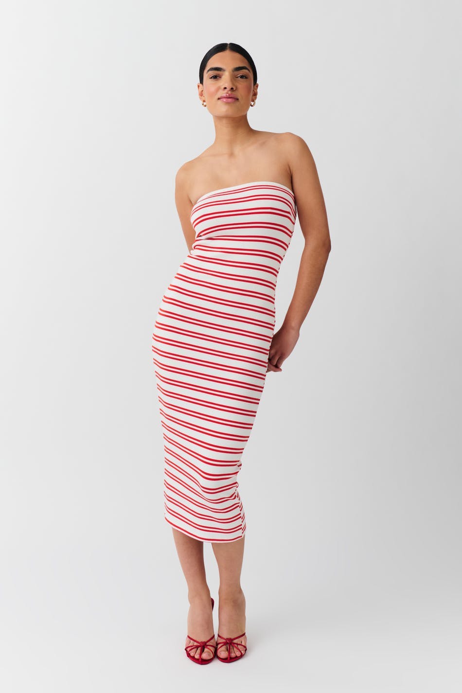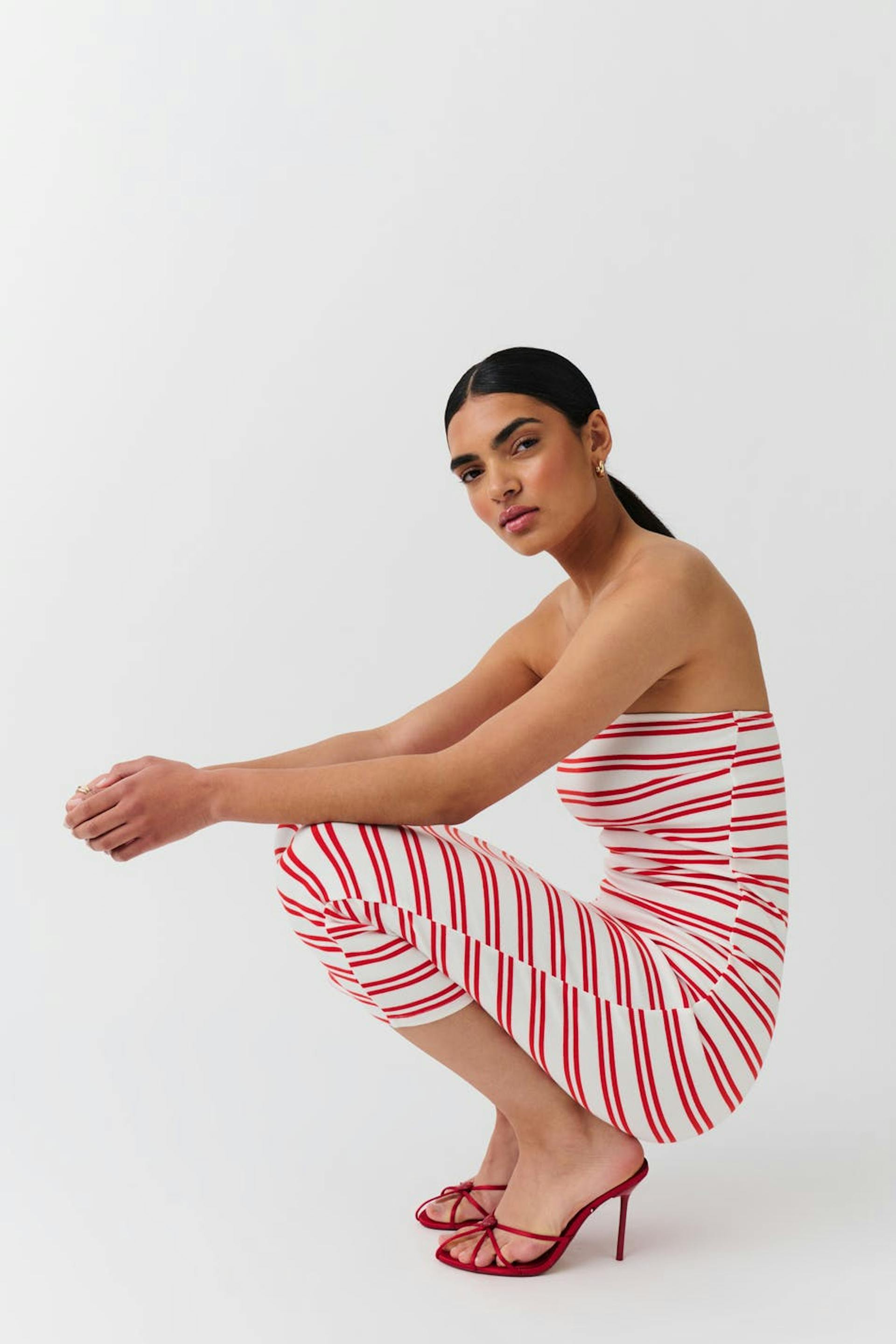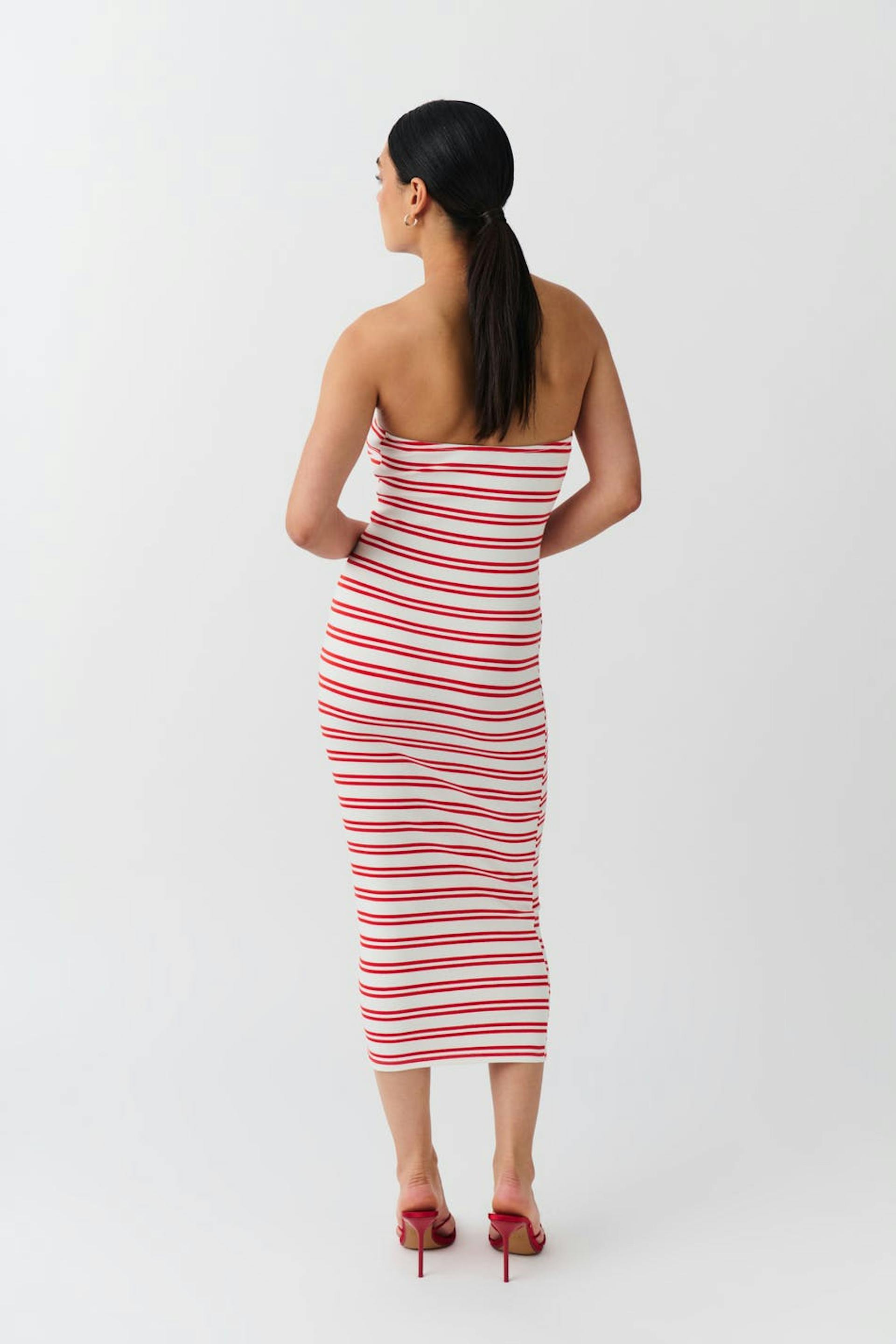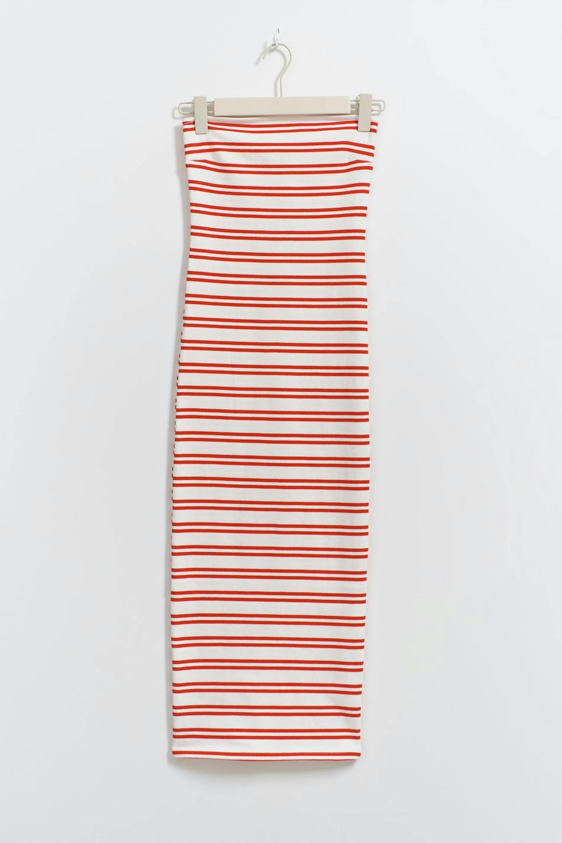 Striped tube dress with an elastic. The dress is red and has an inner silicone trim at the bust.
