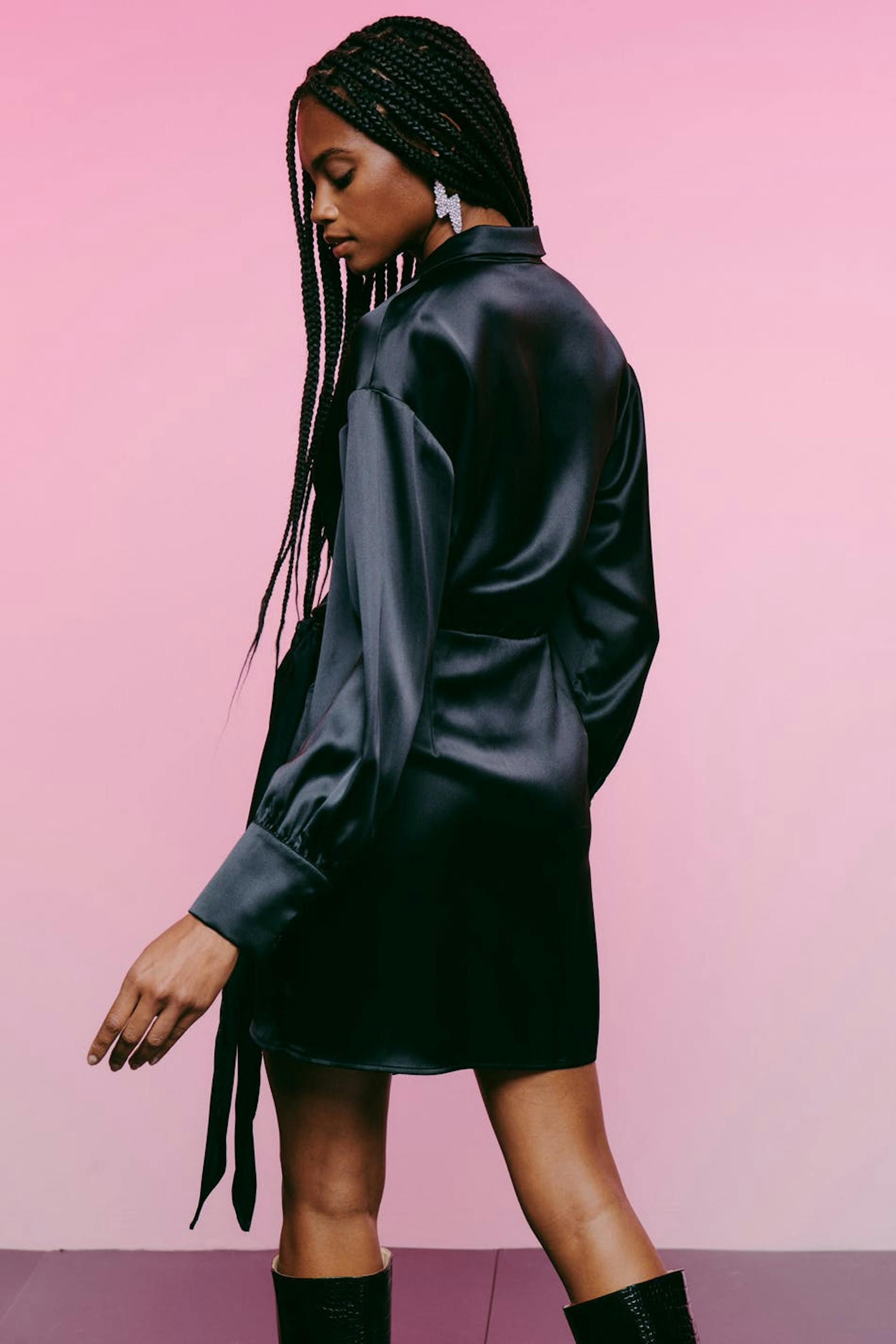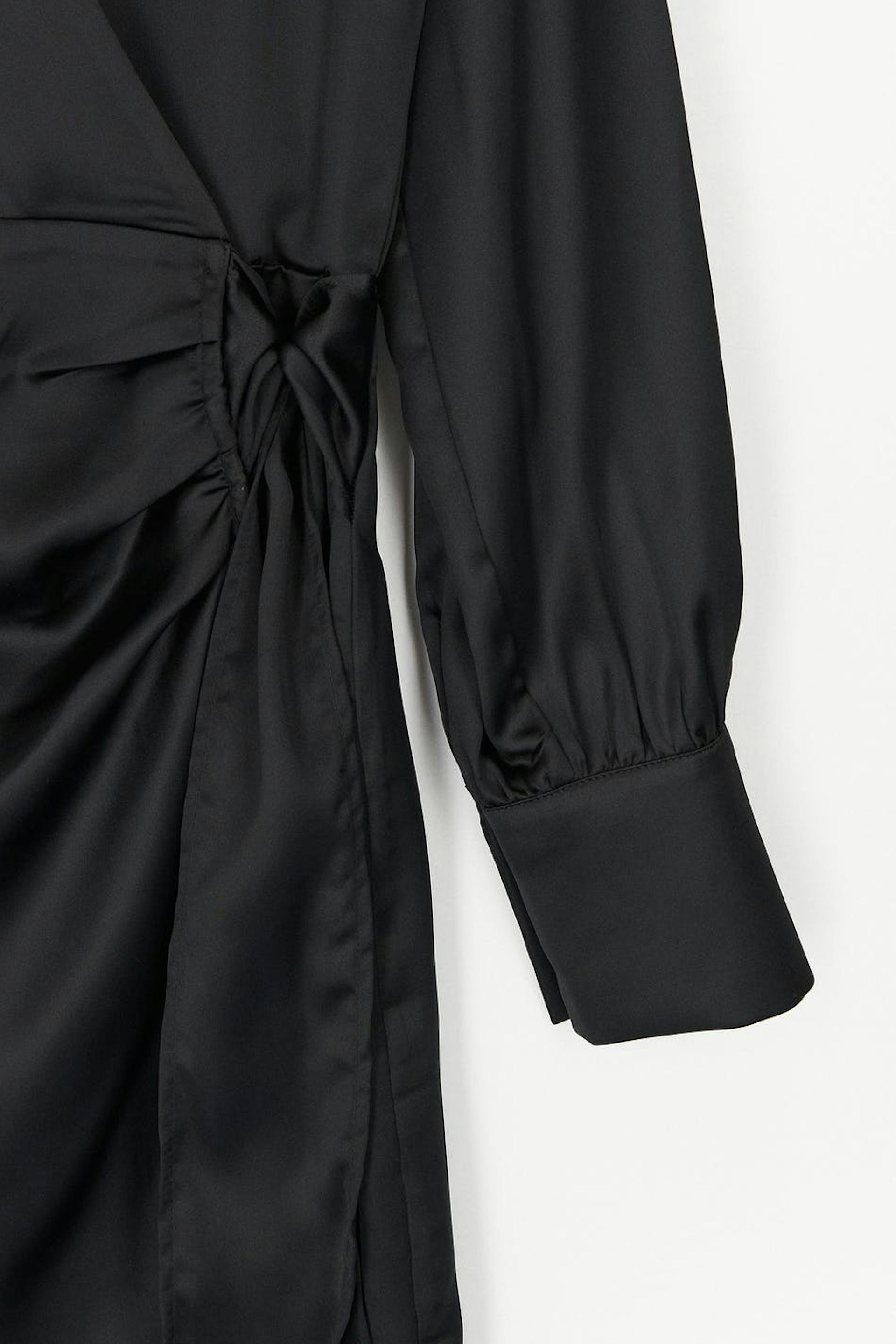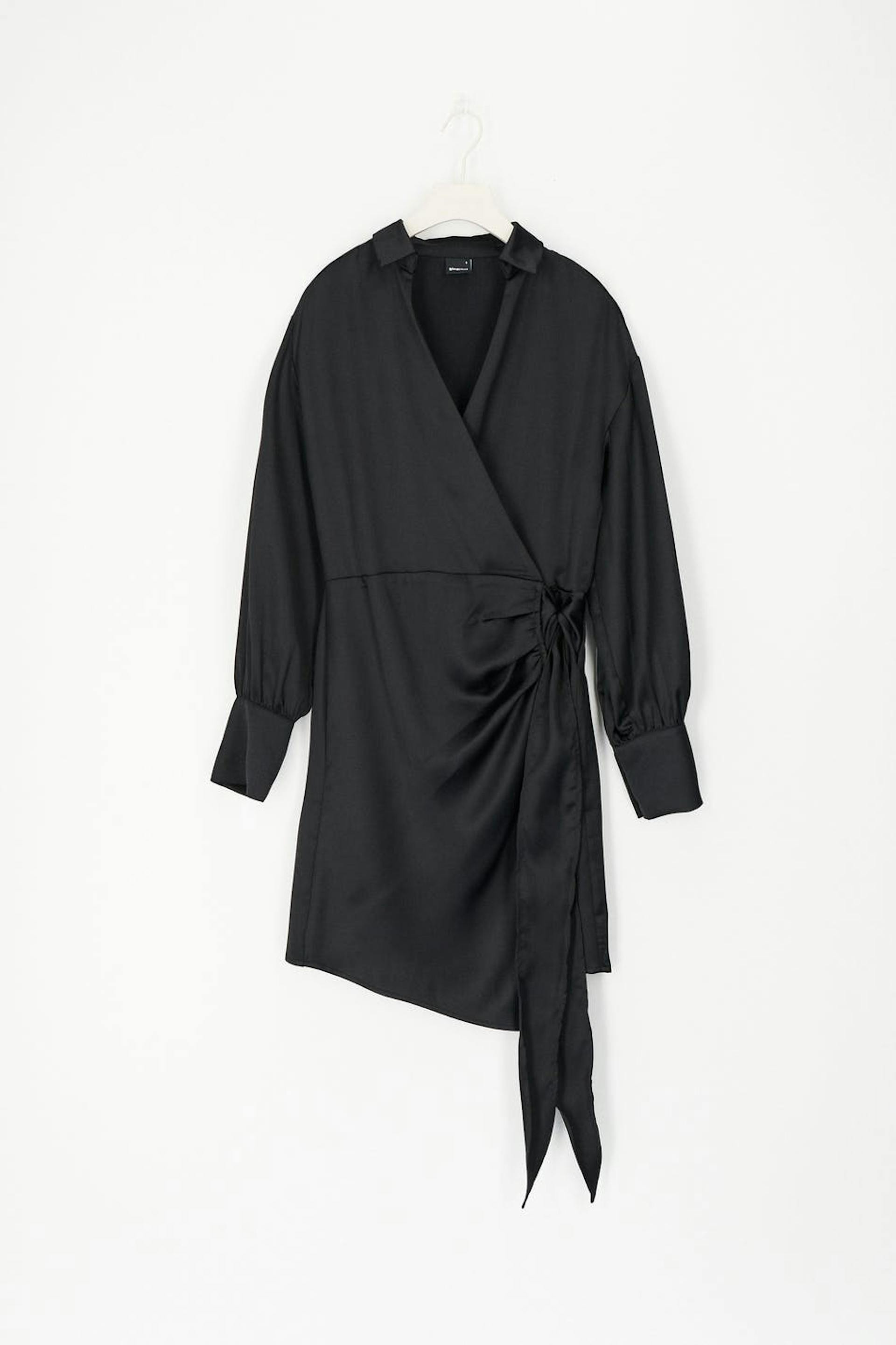 Long-sleeved wrap front dress in satin with self-tie at the waist. The dress is black and has v-neck. It has loose-fitting style at the top, fitted skirt, cuffs on the sleeve ends and shirt collar.