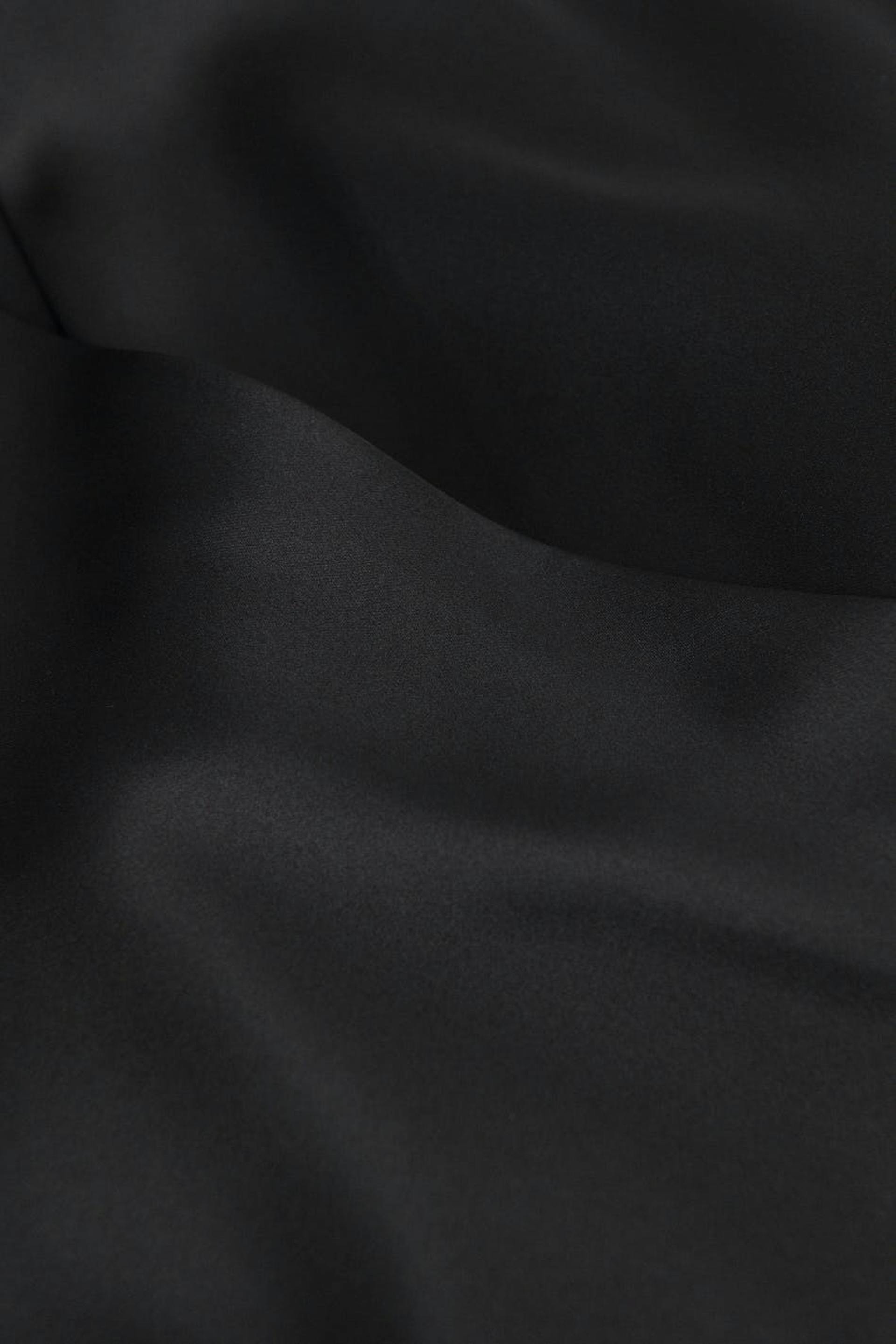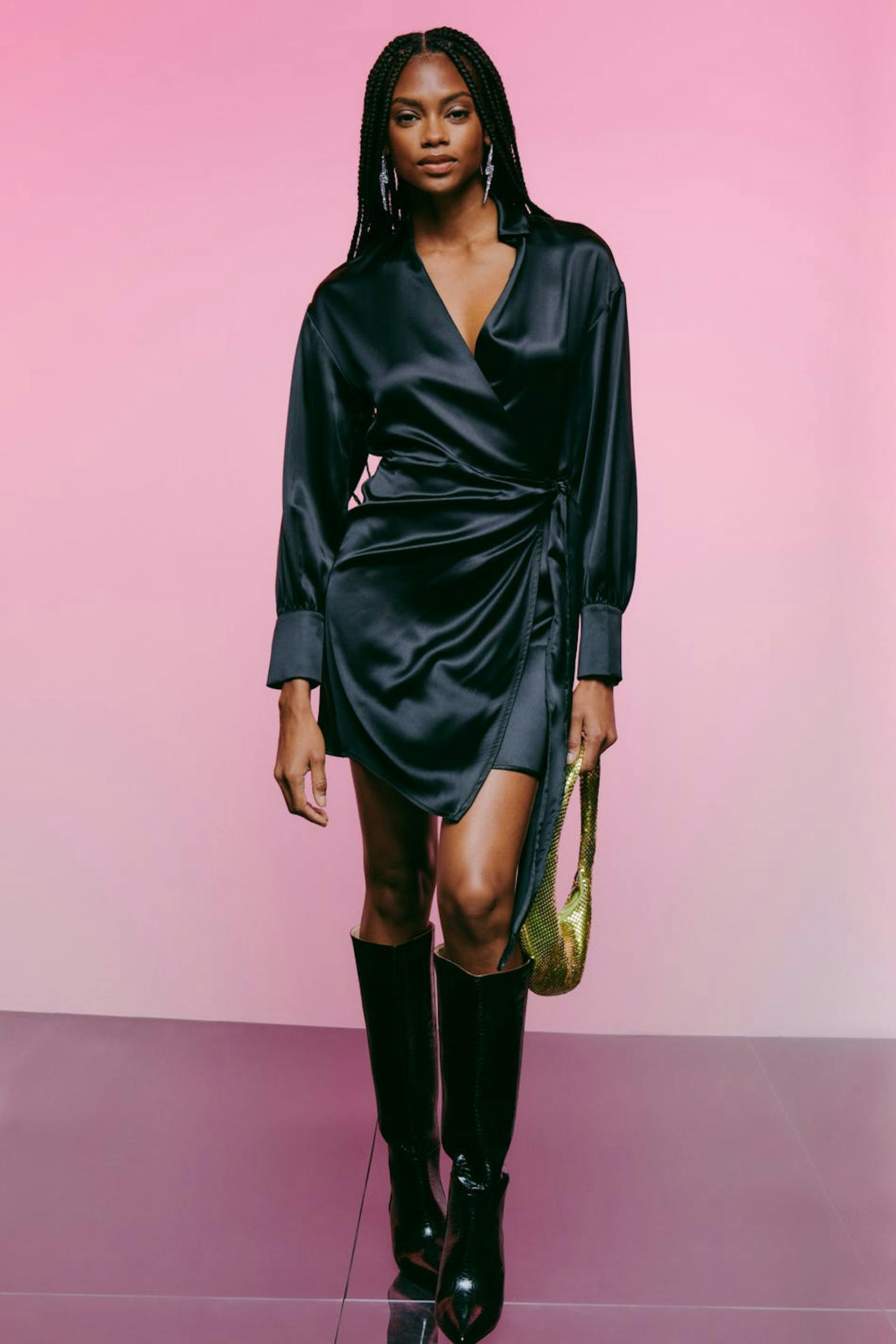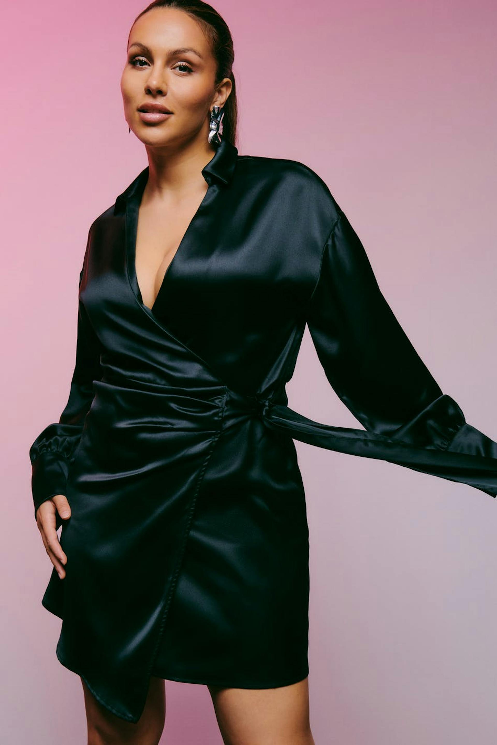Long-sleeved wrap front dress in satin with self-tie at the waist. The dress is black and has v-neck. It has loose-fitting style at the top, fitted skirt, cuffs on the sleeve ends and shirt collar.