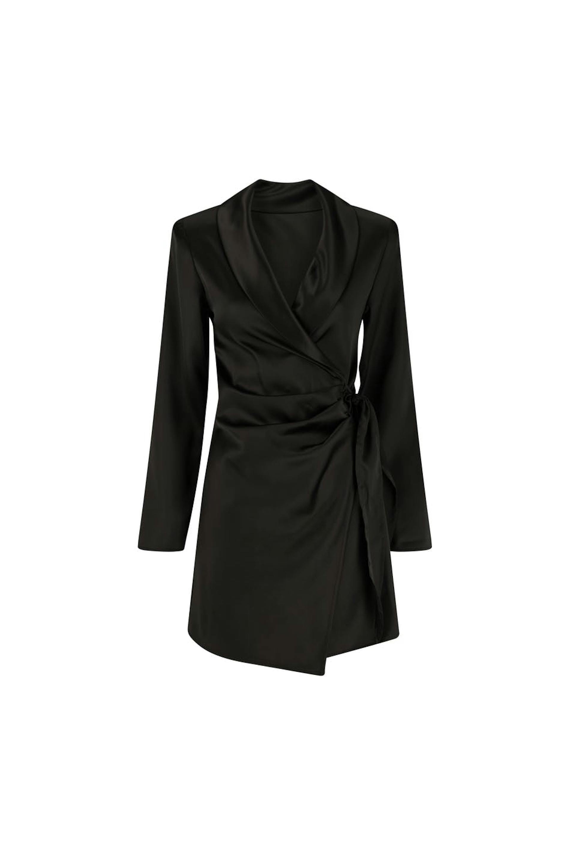 Long-sleeved wrap dress in satin with self-tie at the waist. The dress is perfect for the party, black and short. It has collar, v-neck and shoulder pads.