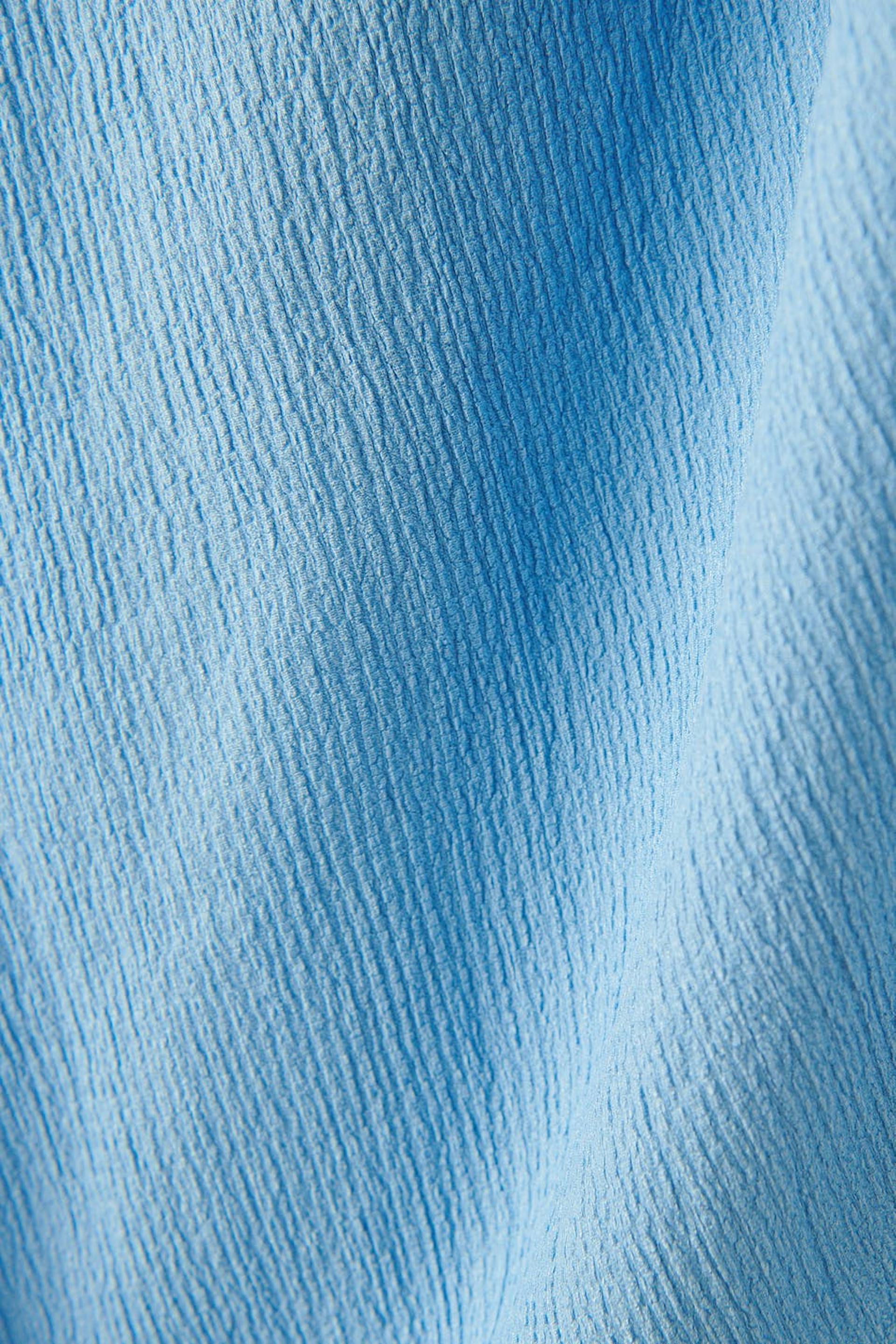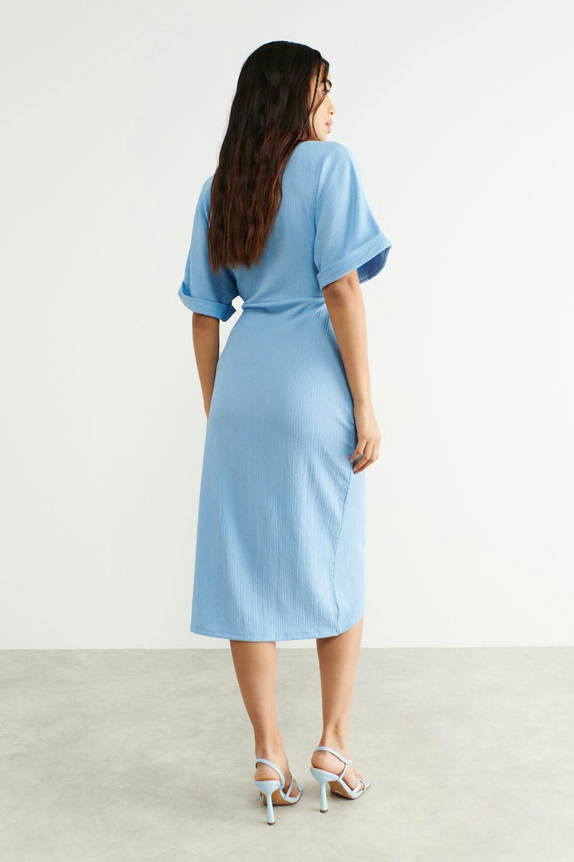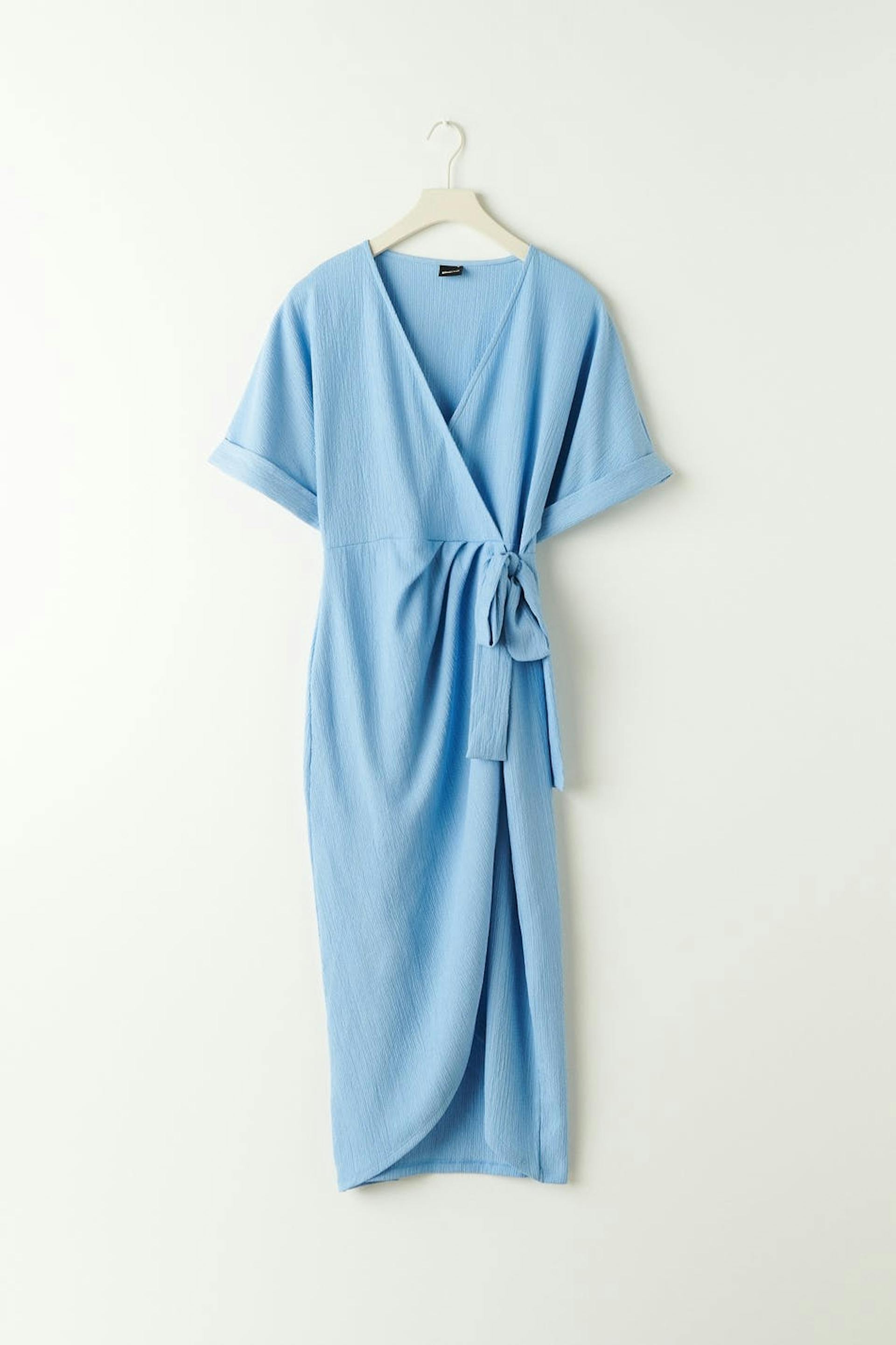 Short-sleeved wrap dress with tie bands at the side. The dress is blue and has a structured material. It has v neckline and wide sleeves with folded sleeve ends.