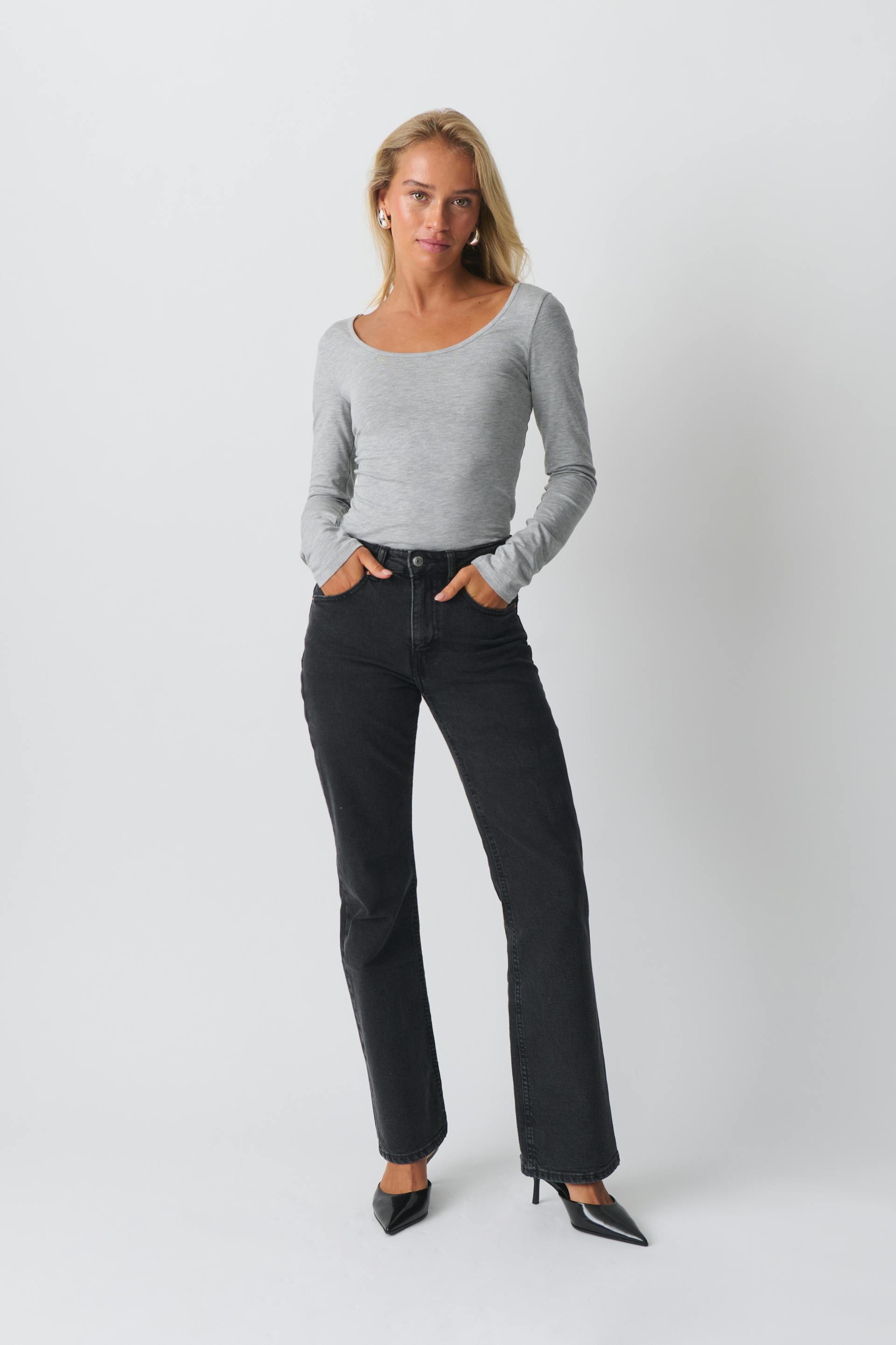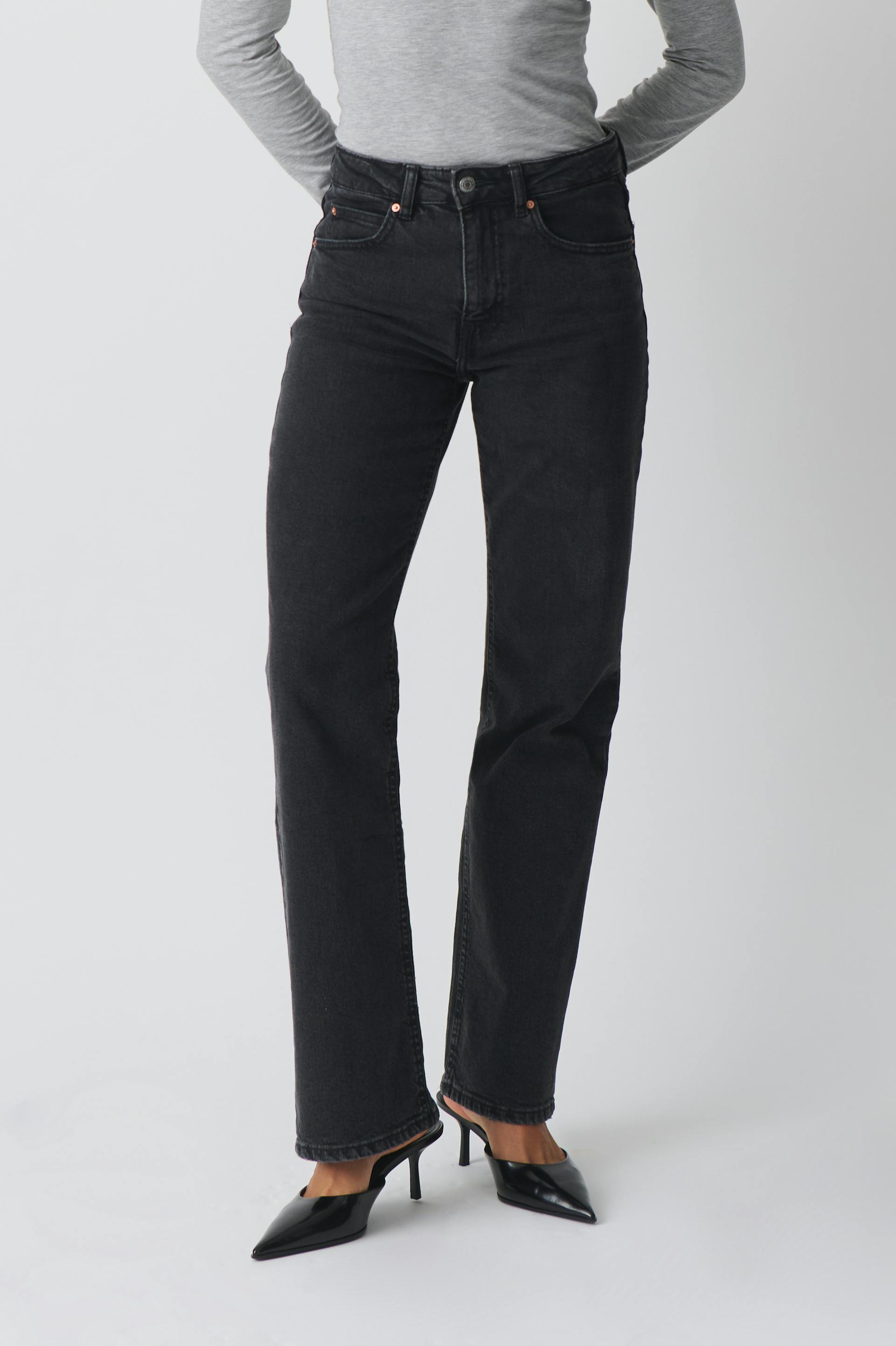 Jeans with straight legs from the knees down. The jeans are black-grey and have stretchy quality. They have regular fit, mid waist, zip fly and pockets at the front and back. Use our size guide to find your size.