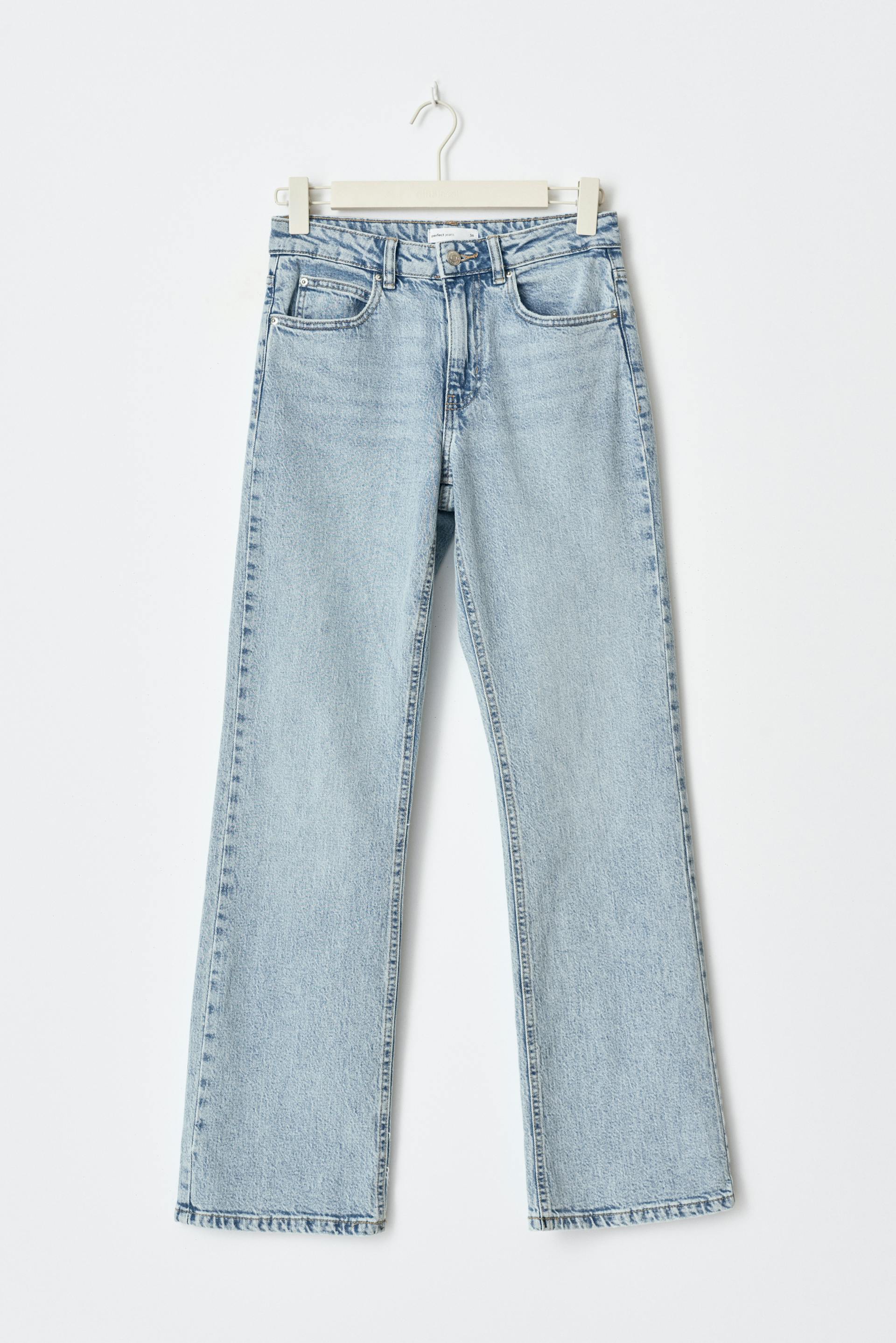 Petite jeans with stretch. The jeans are light-blue and have flared legs. They have regular fit, pockets at the front and back, mid waist, zip fly and shorter leg length. Perfect for those who are 160 cm (5 ft 3 in.) or shorter.