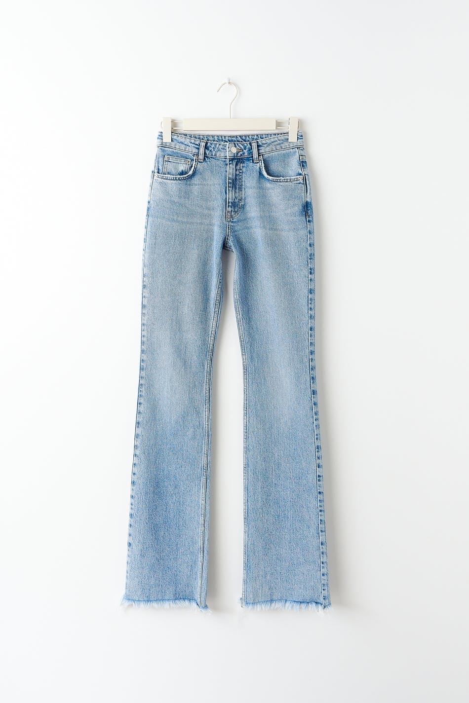 Boot cut jeans with mid waist. The jeans are blue and have a slim fit in low stretch denim. They have flared legs with normal length and zip fly. Use our size guide to find your size.