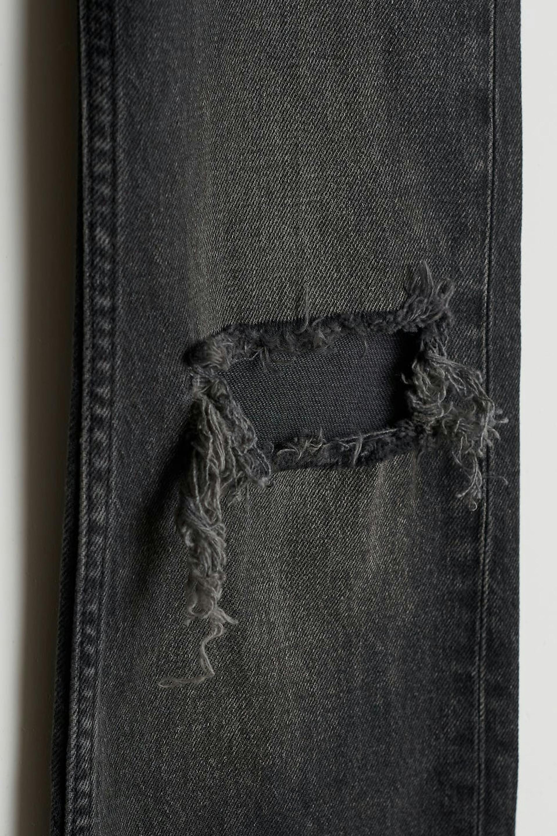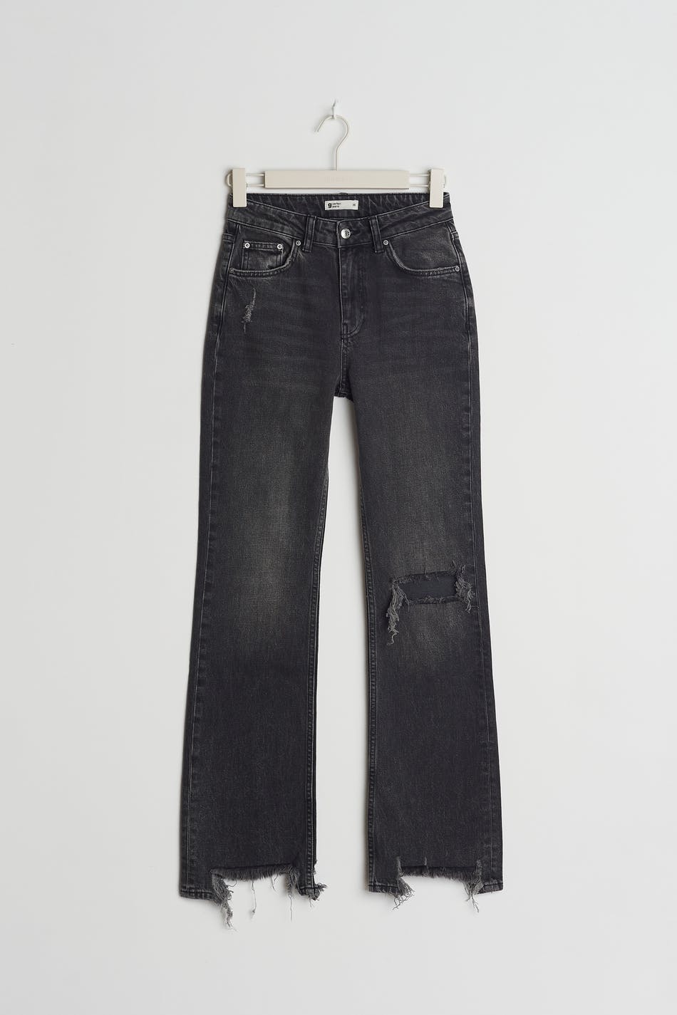 Petite boot cut jeans with ripped knee. The jeans is black-grey and has mid waist. It has a slim fit in low stretch denim, fly with zip and flared trouser legs with shorter leg length. Perfect for those who are 160 cm (5 ft 3 in.) or shorter. Use our size guide to find your size.
