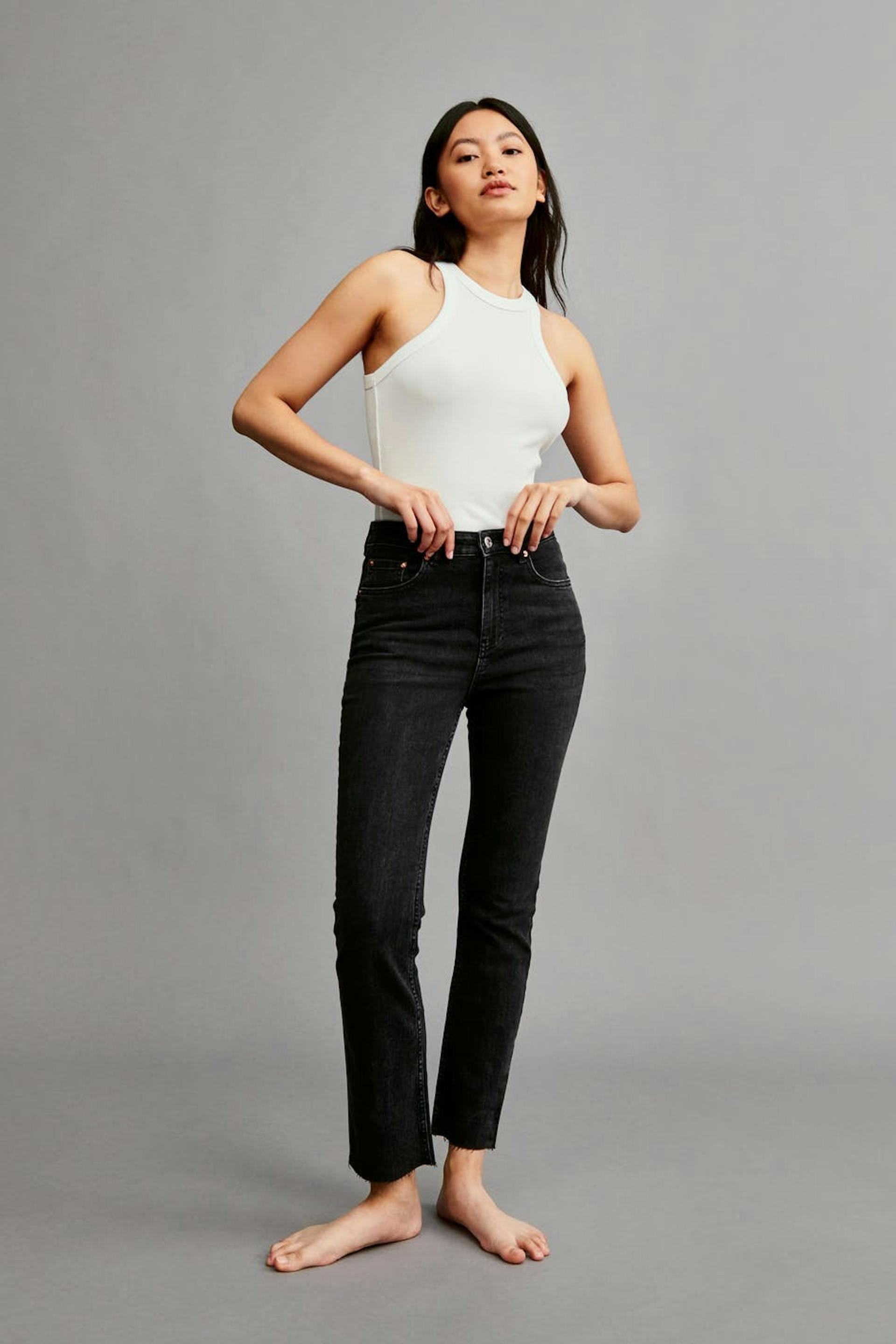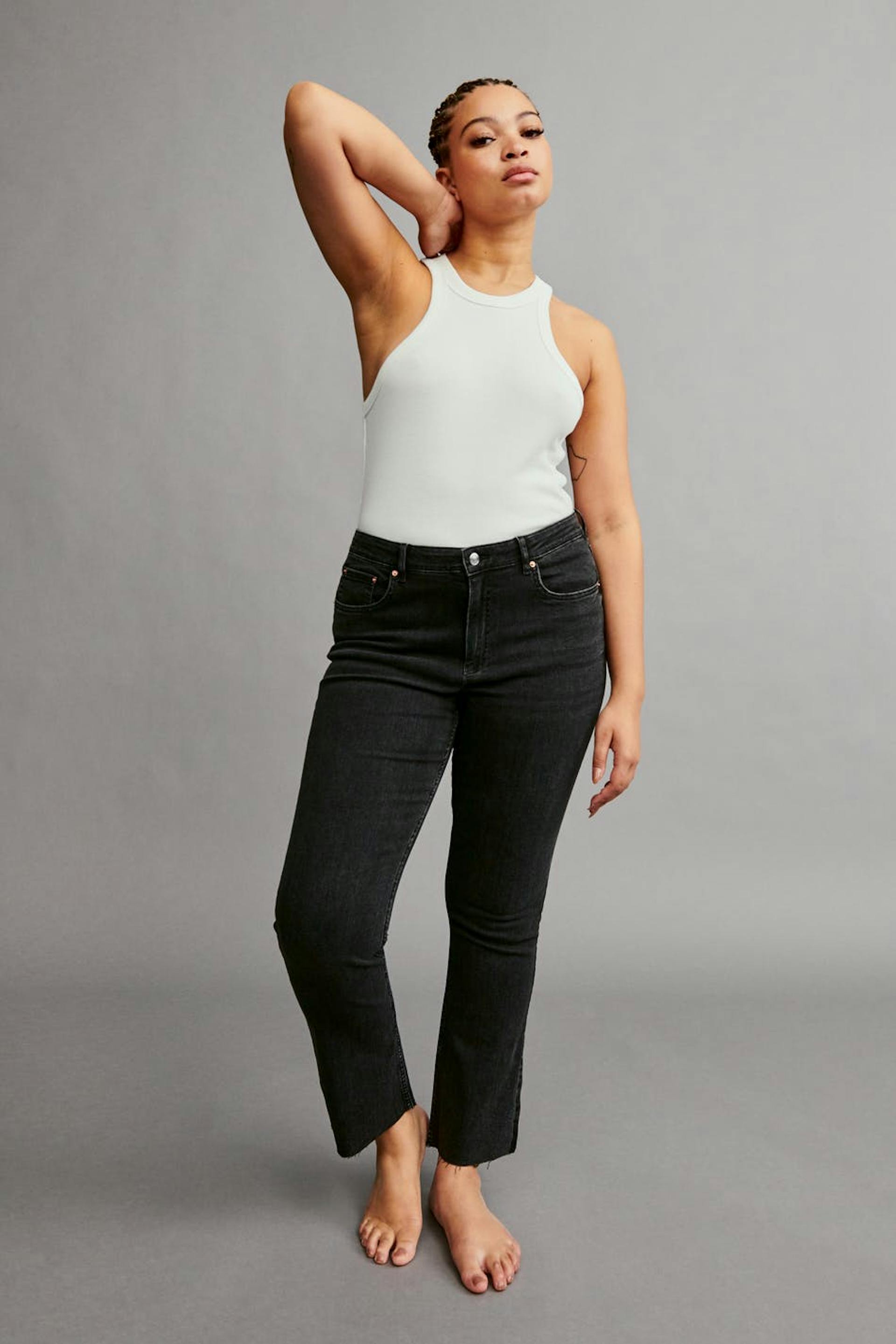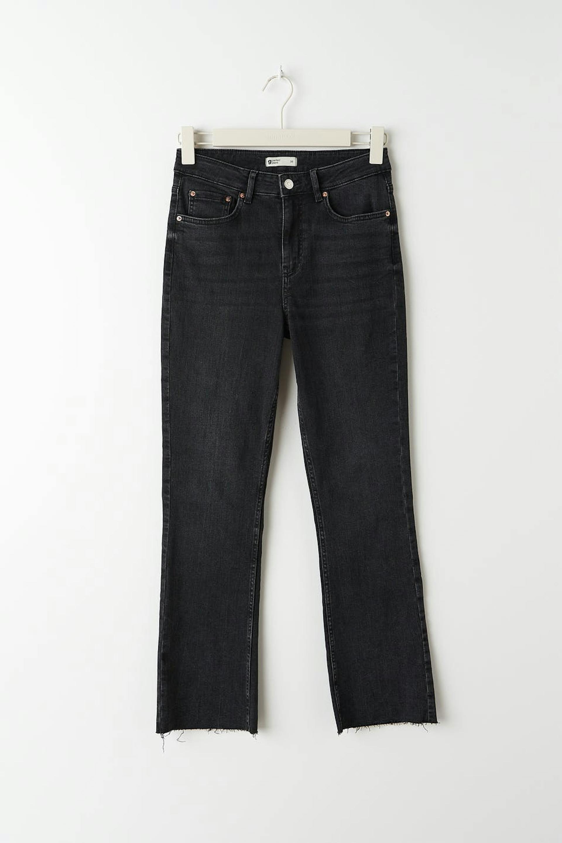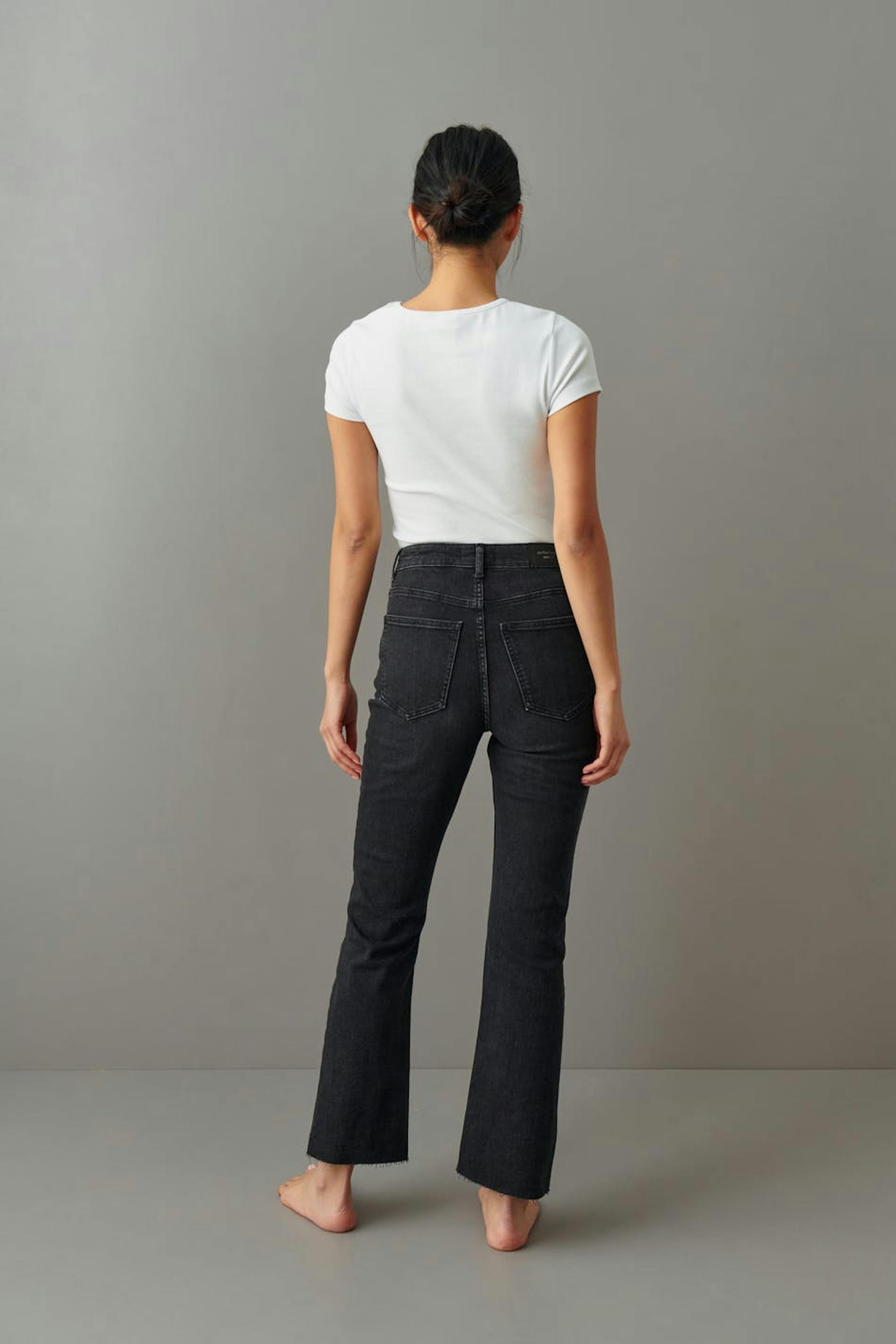 Flare jeans with mid waist. The jeans are black-grey and have a fitted fit in stretch denim. They have zip fly and cropped, slightly flared legs with raw edges at the end of the legs. Use our size guide to find your size.