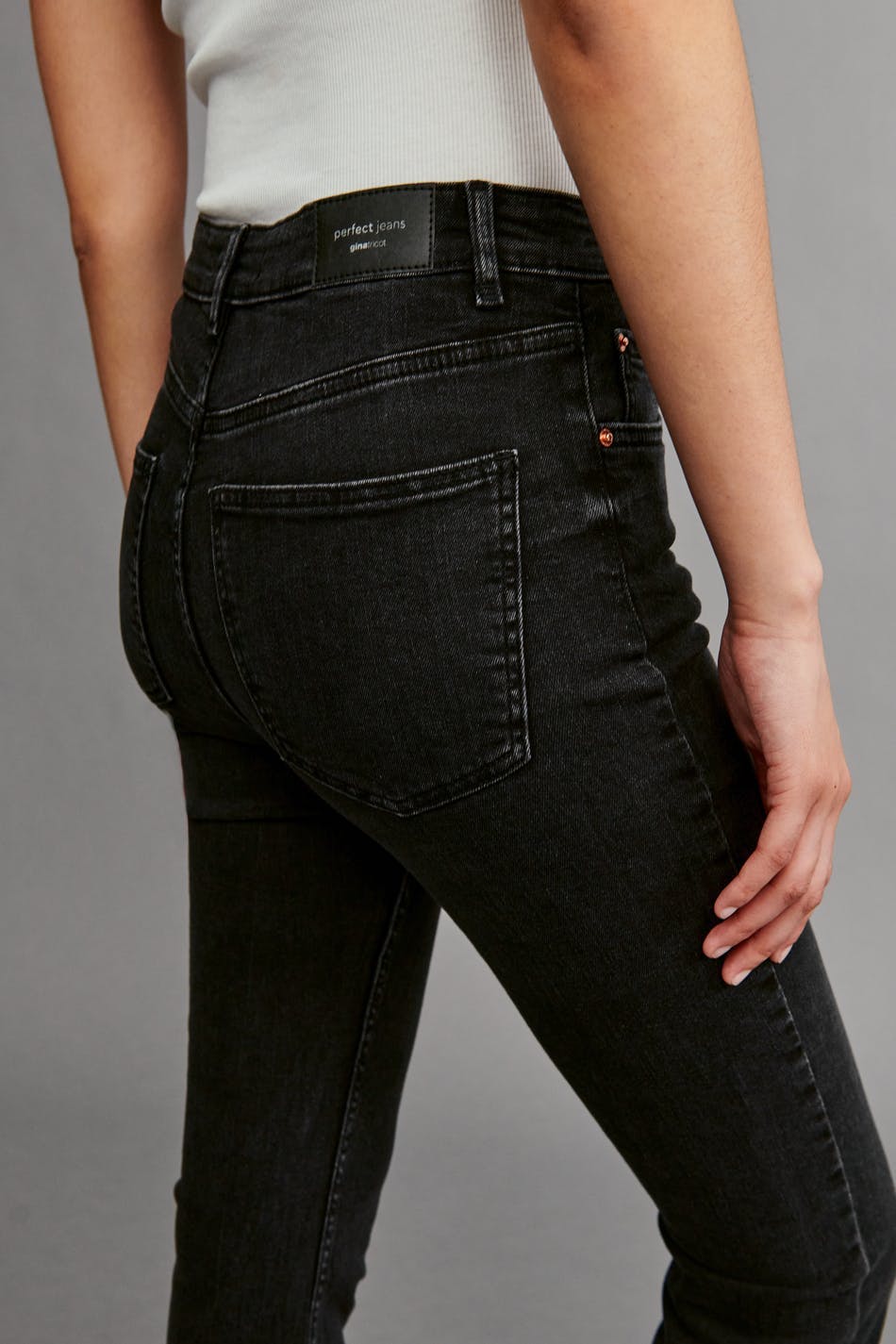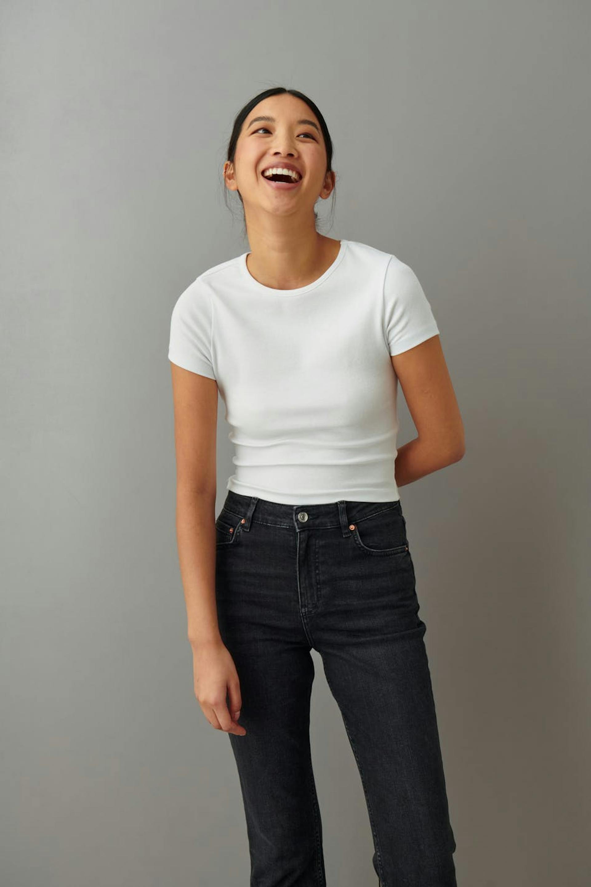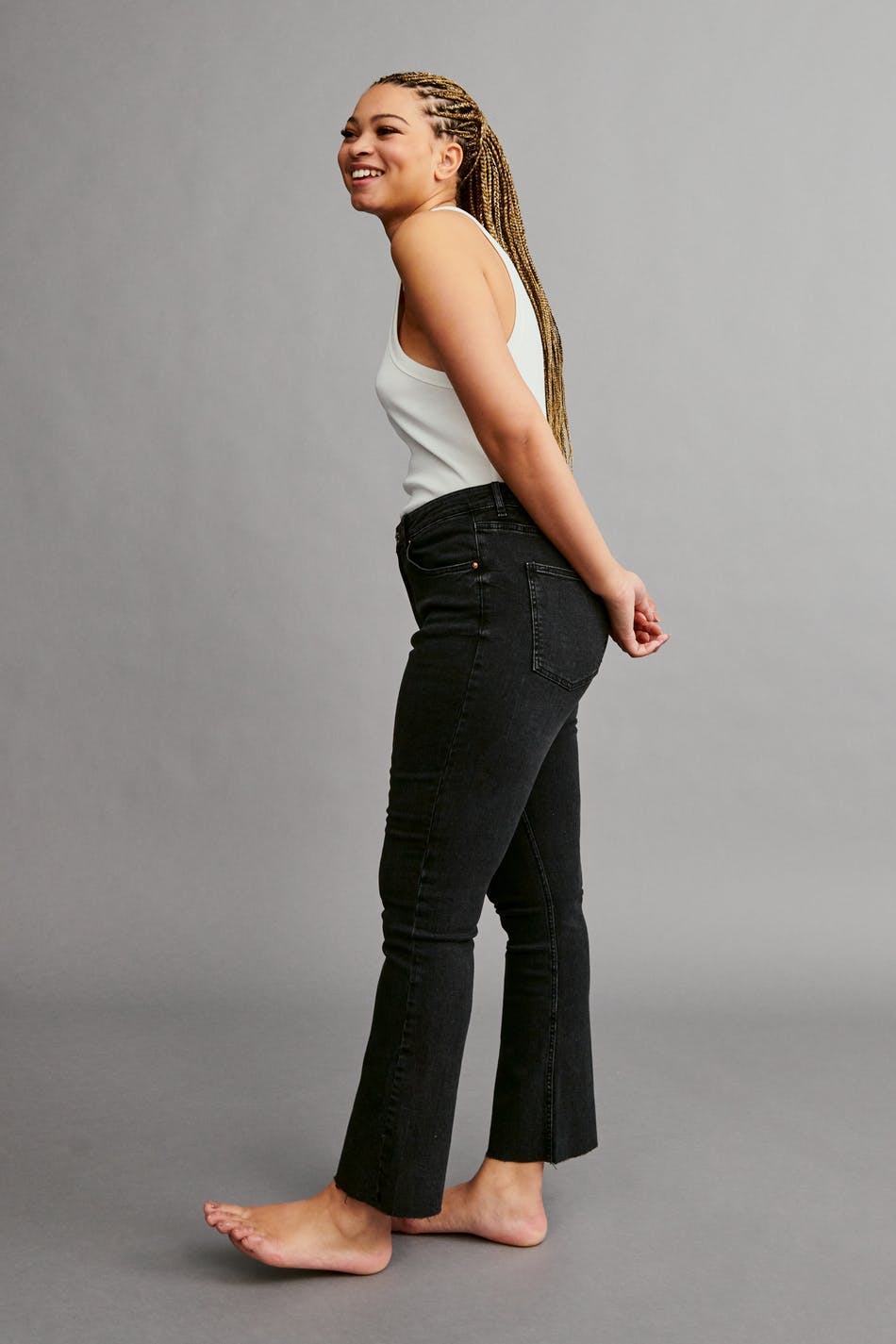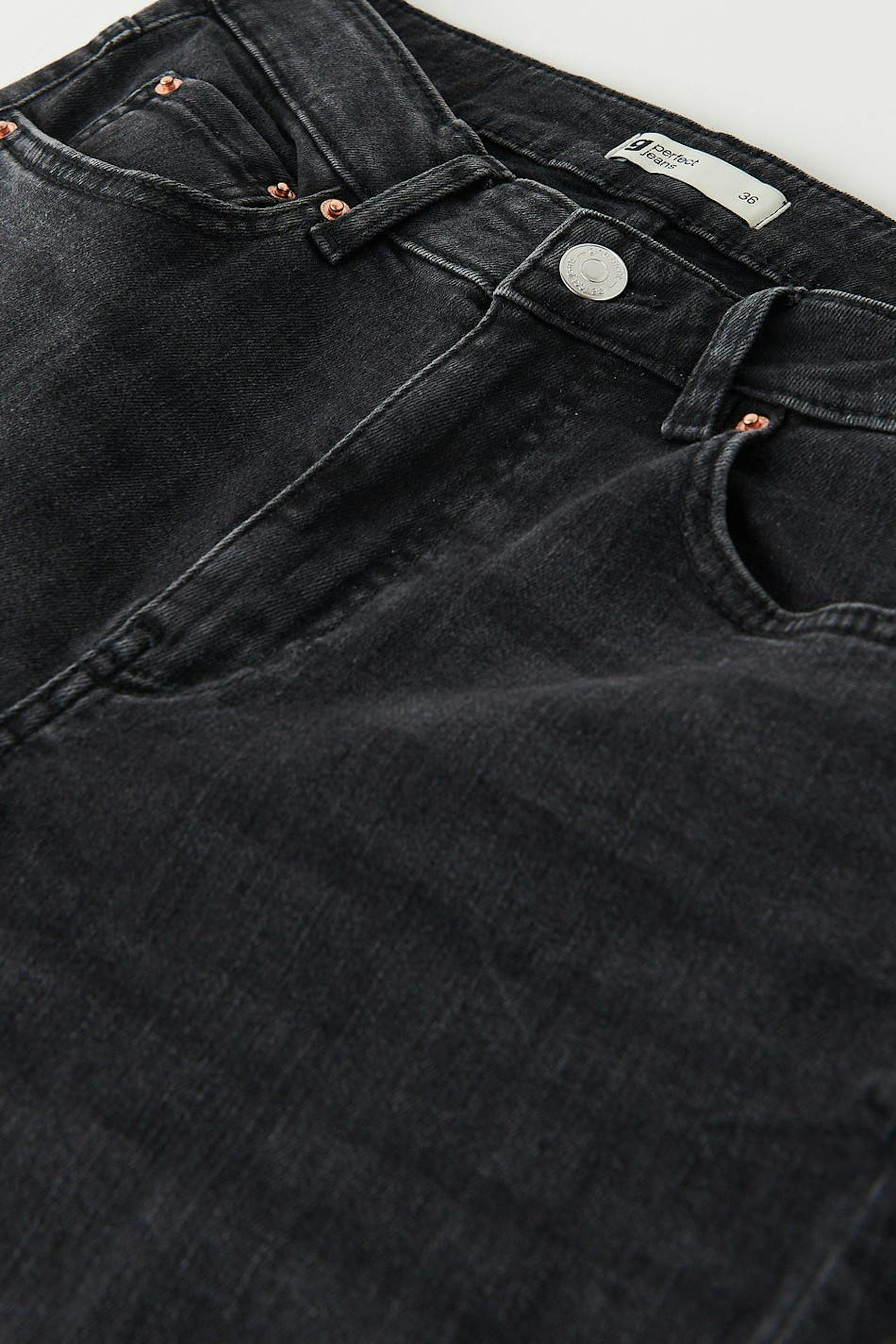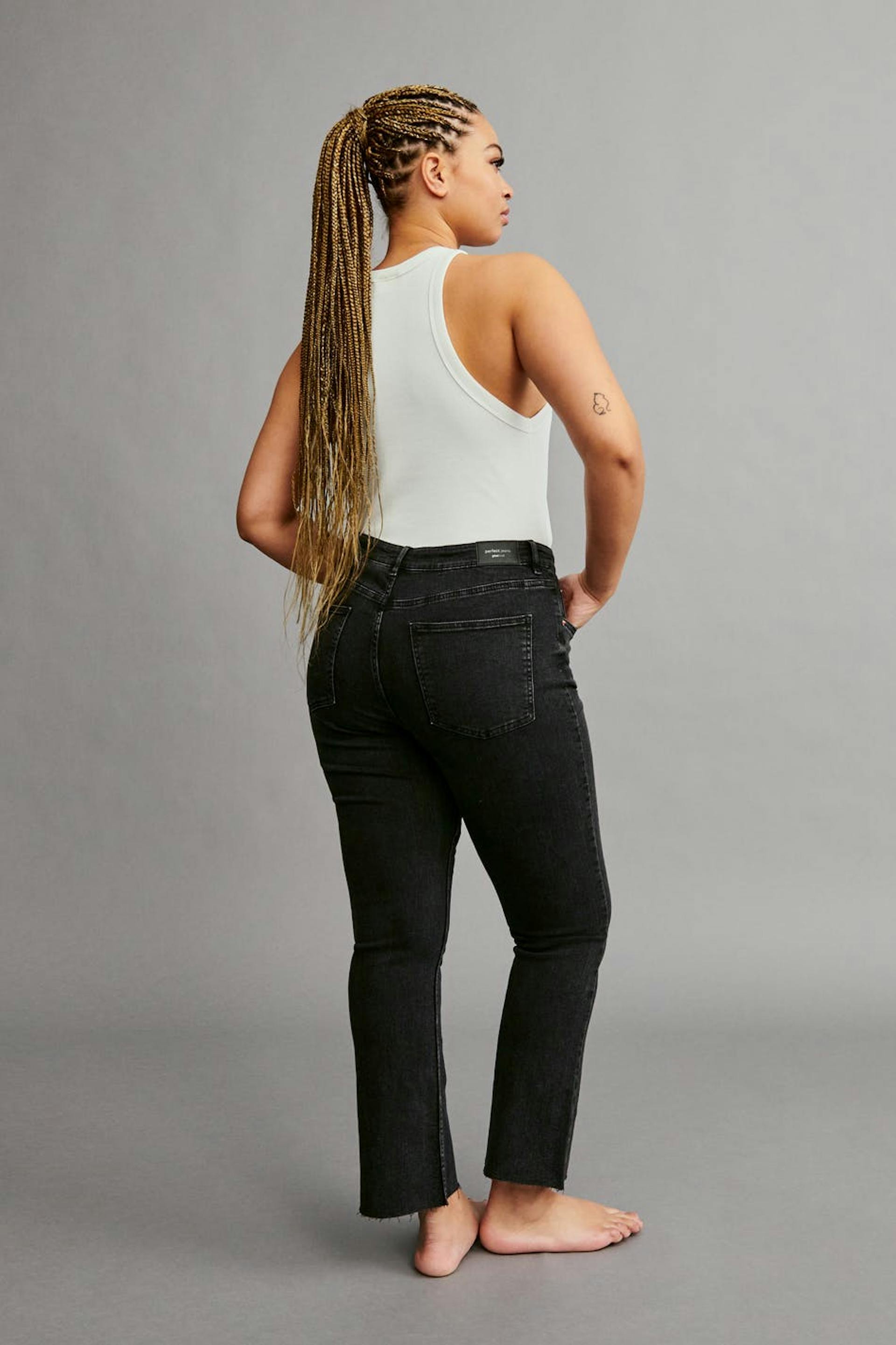 Flare jeans with mid waist. The jeans are black-grey and have a fitted fit in stretch denim. They have zip fly and cropped, slightly flared legs with raw edges at the end of the legs. Use our size guide to find your size.