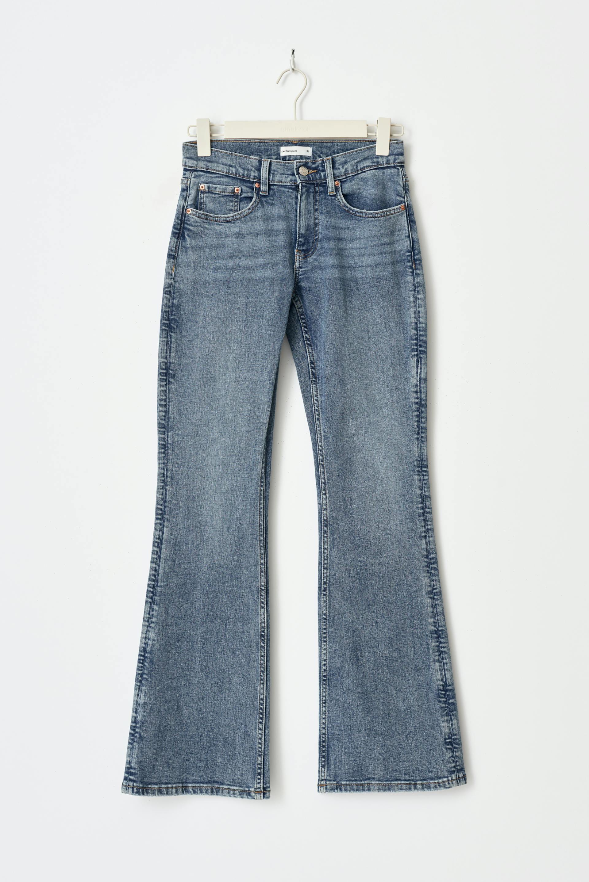 Petite jeans with low waist. The jeans are blue and have flared legs. They have figure-hugging fit, stretchy quality, zip fly and pockets at the front and back. Use our size guide to find your size. Perfect for those who are 160 cm (5 ft 3 in.) or shorter.