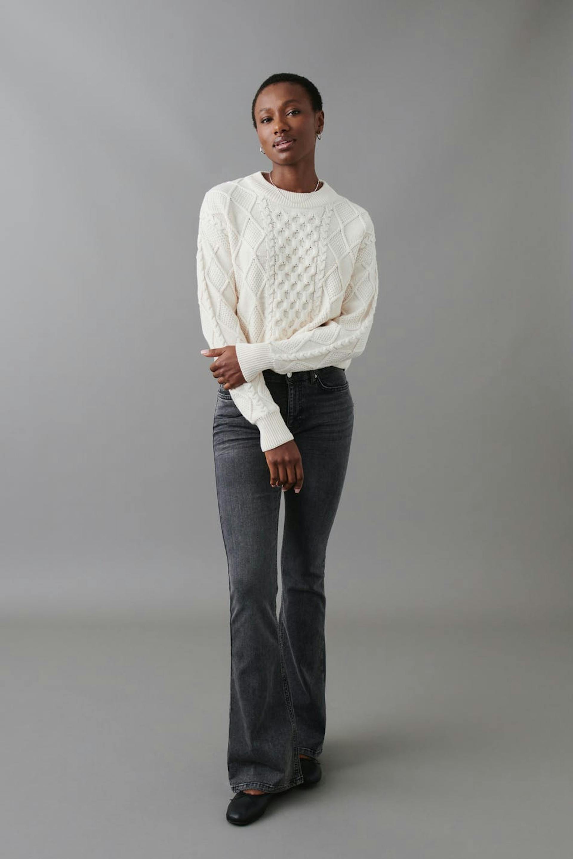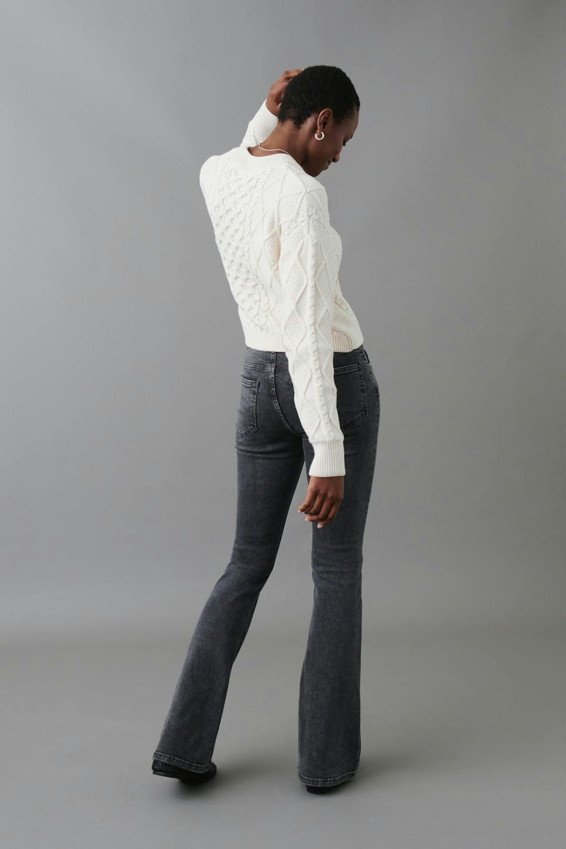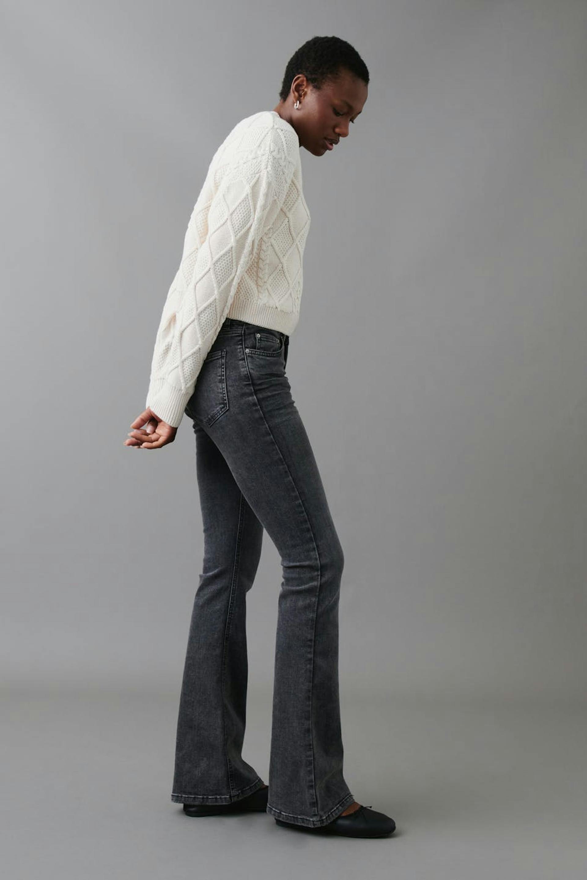 Boot cut jeans with low waist. The jeans are grey and have flared legs in stretch denim. They have zip fly and pockets at the front and back. Perfect for those who are 175 cm (5 ft 9 in.) or taller. Use our size guide to find your size.