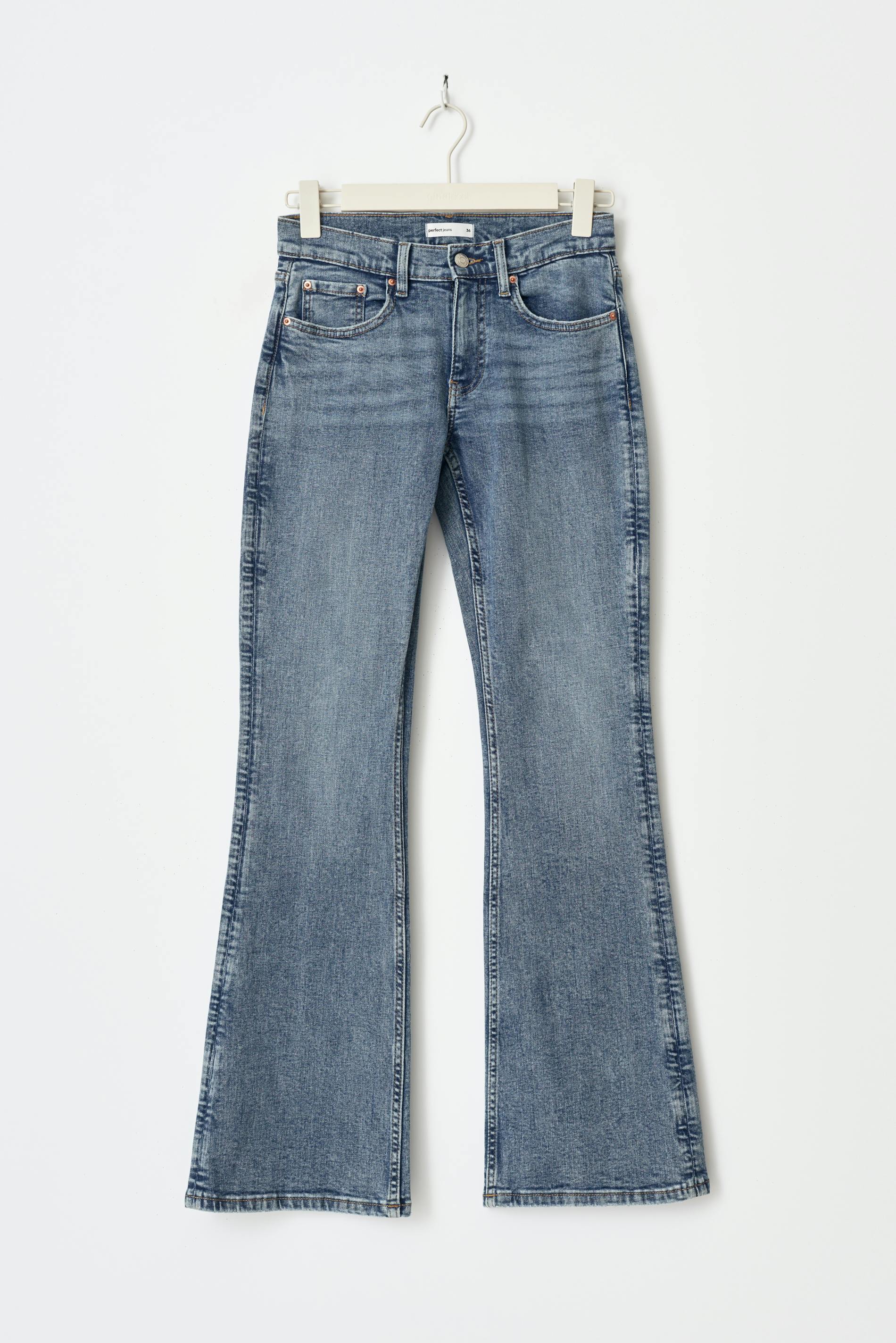 Boot cut jeans with extra long legs. The jeans are blue and have low waist. They have flared legs, figure-hugging fit, stretchy quality, zip fly and pockets at the front and back. Perfect for those who are 175 cm (5 ft 9 in.) or taller.
