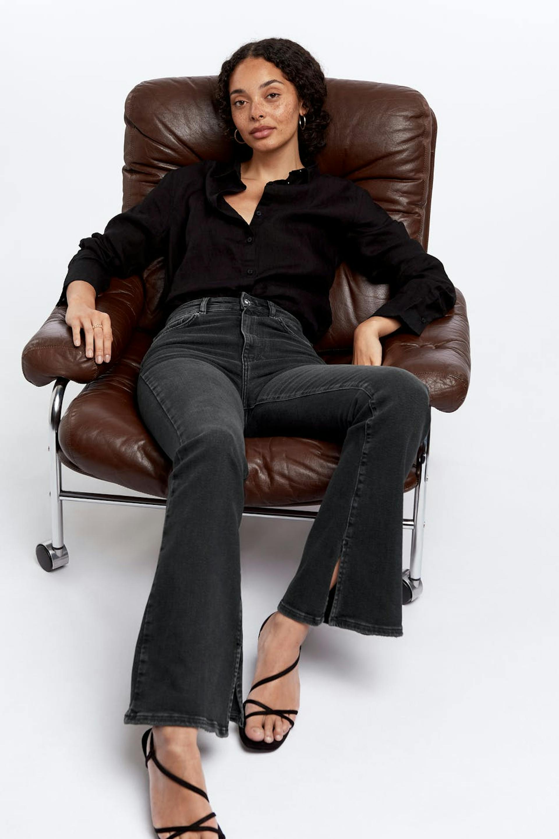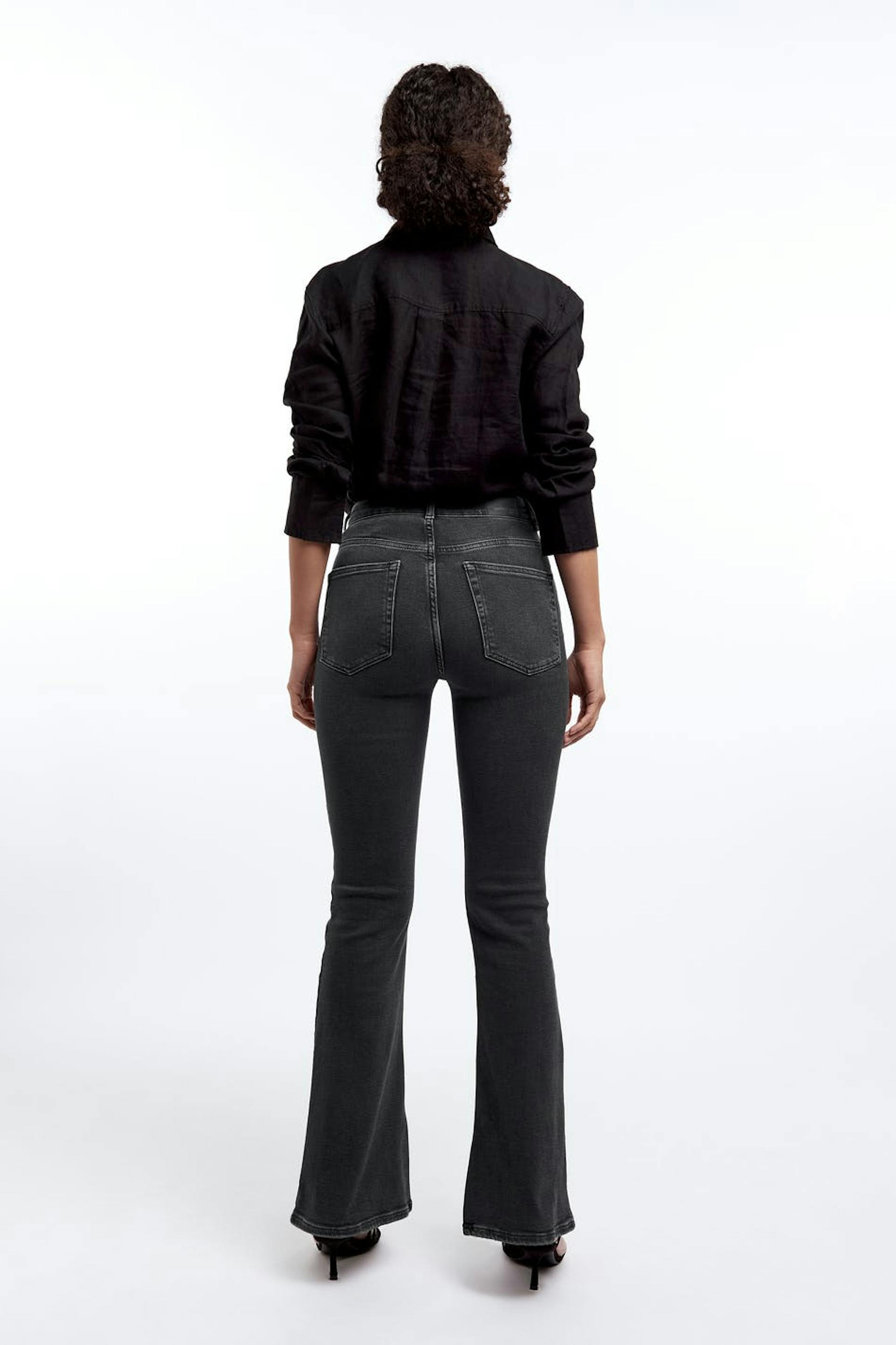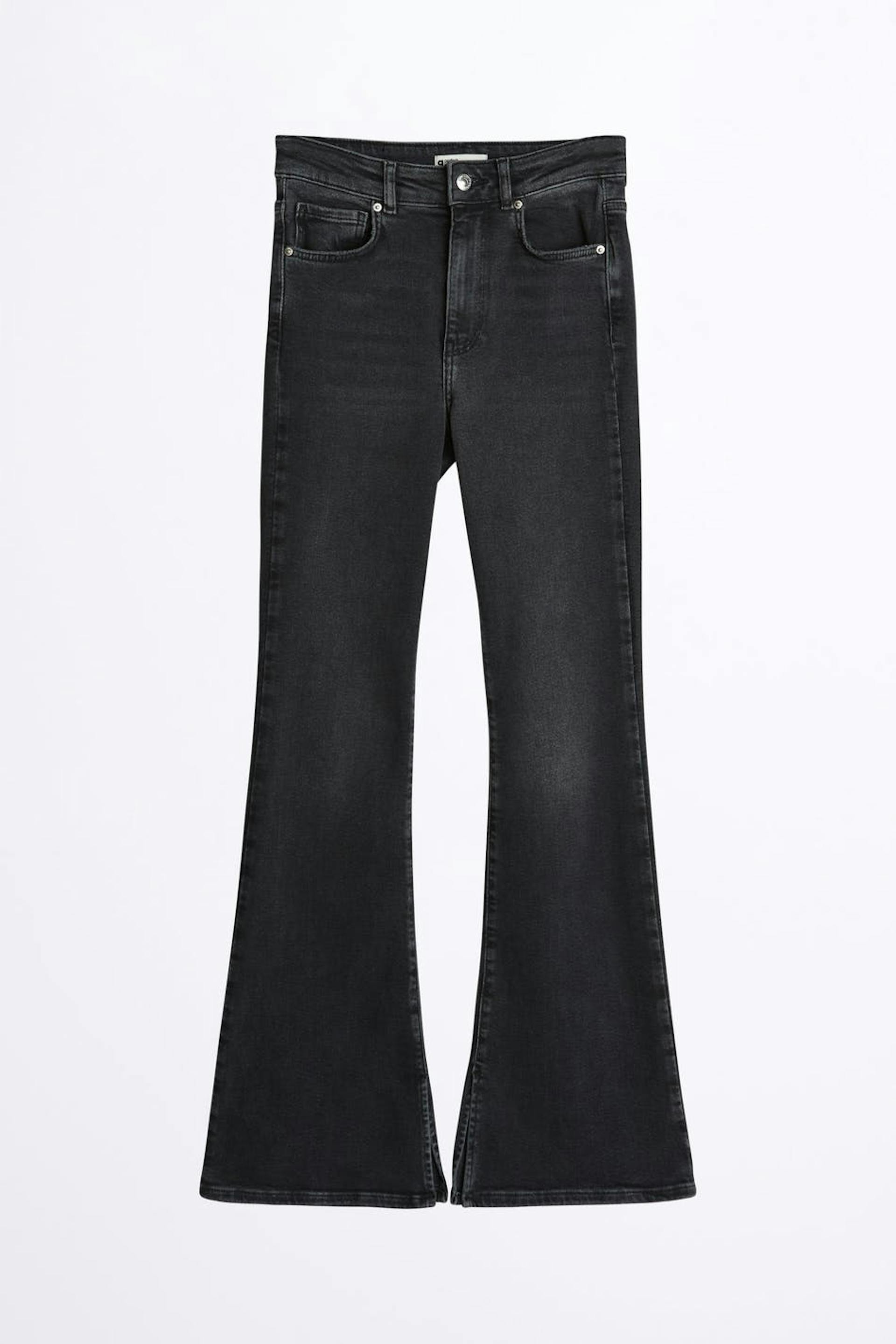 Flare jeans with a skinny fit. The jeans has a high waist. It has a slit detail at the end of the legs.