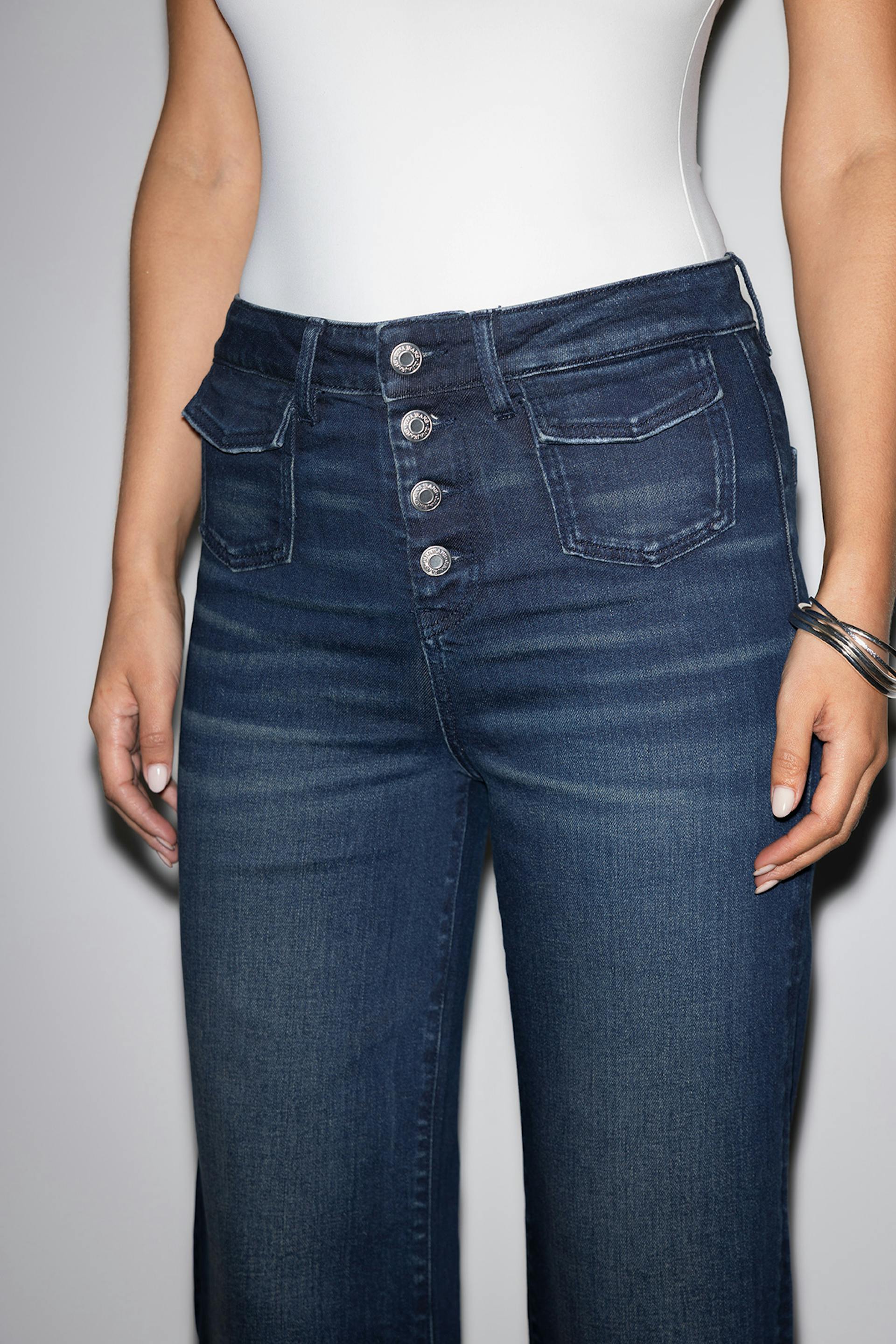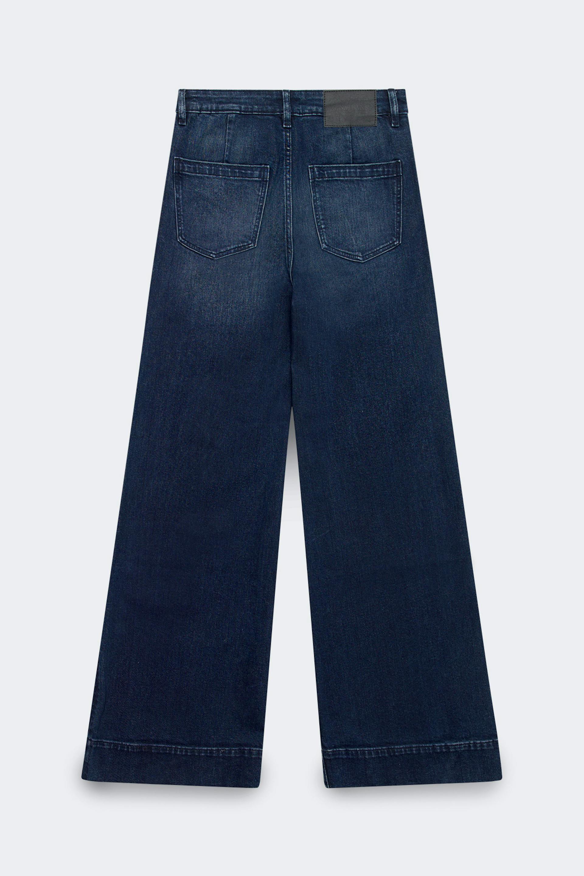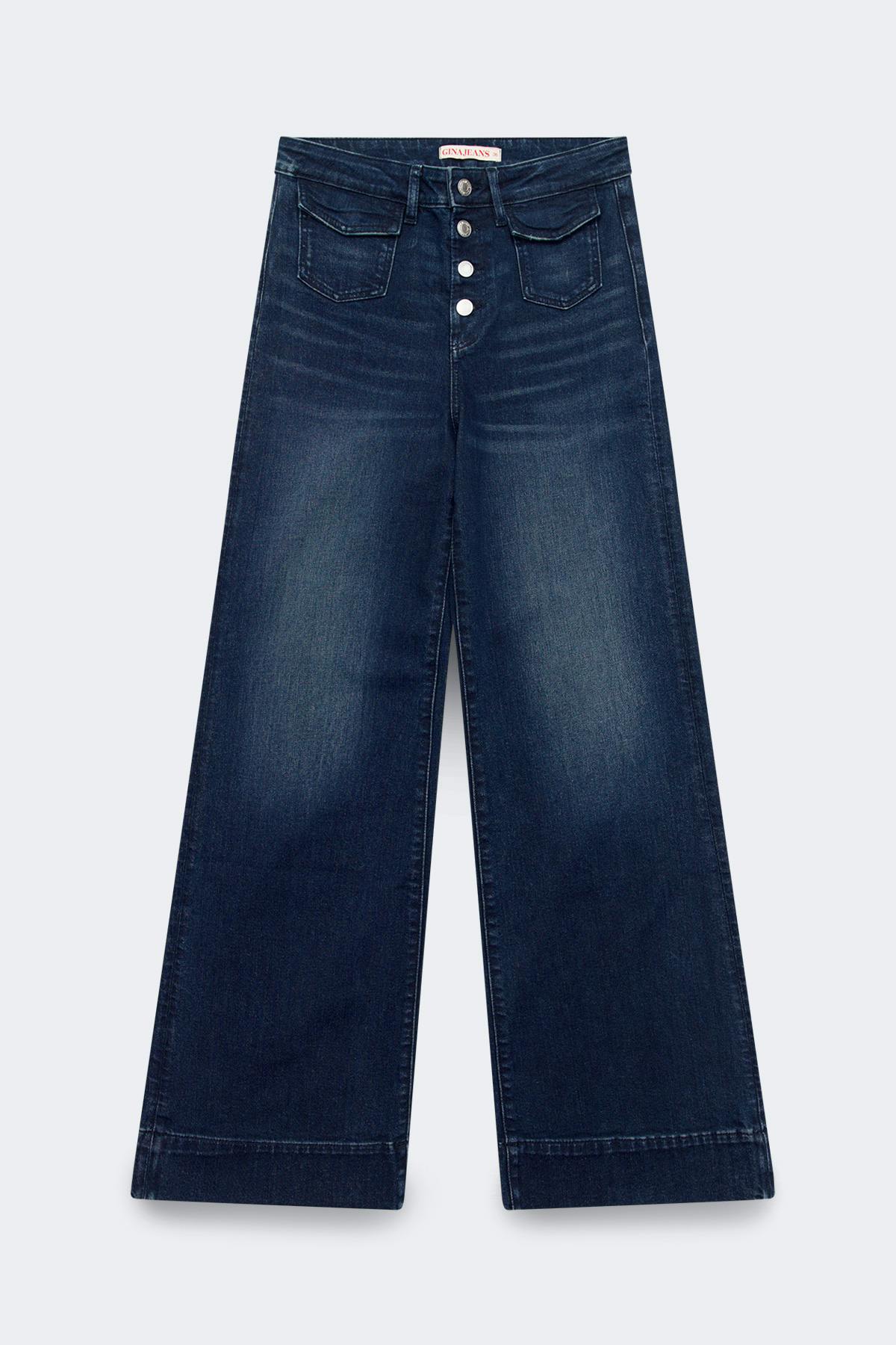 Flare jeans with button fly closure. The jeans are dark blue and have patch front pockets with flap. They have mid waist, flared legs with full length, figure-hugging fit, back pockets, belt loops and stretch. Use our size guide to find your size.