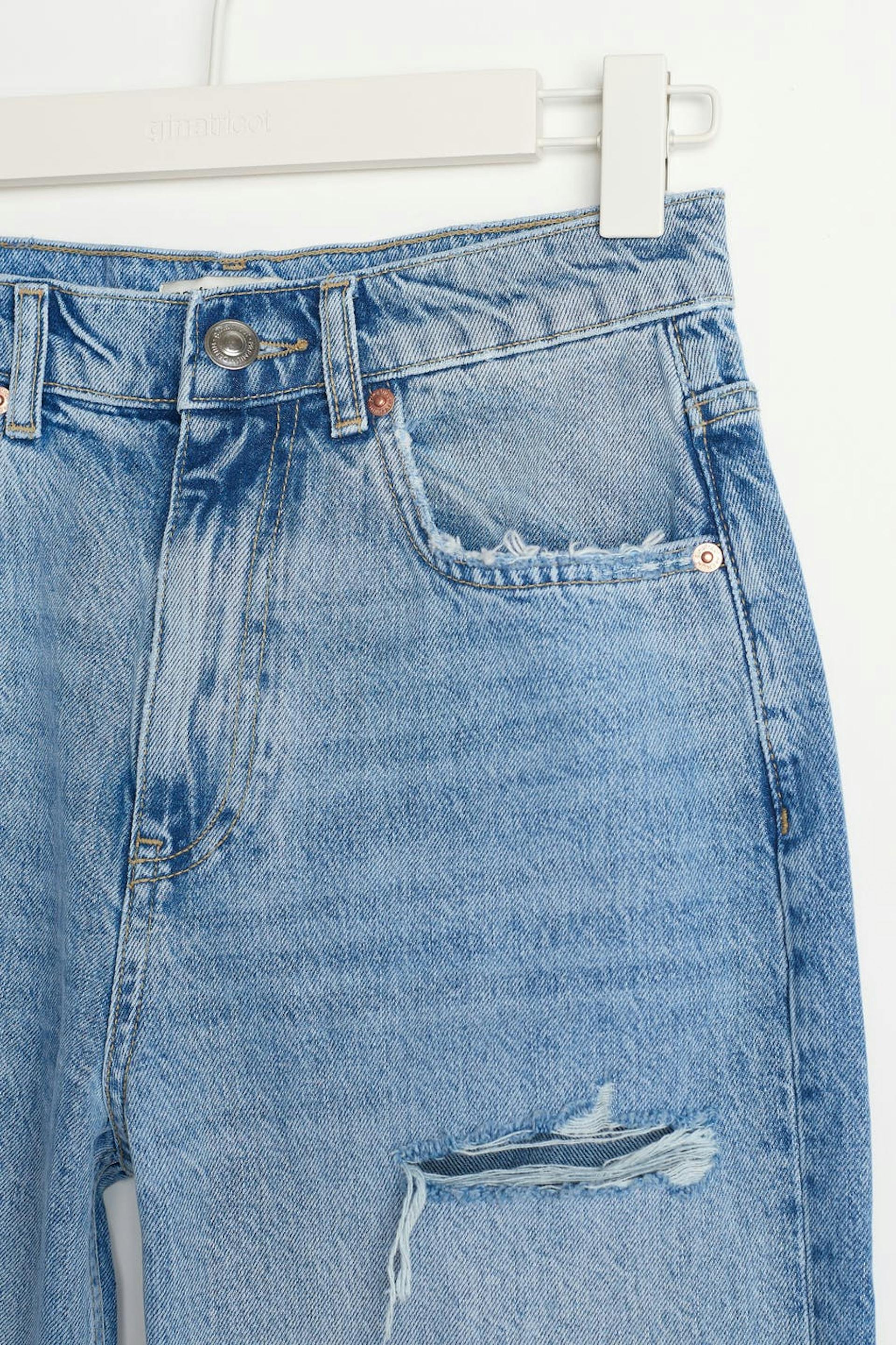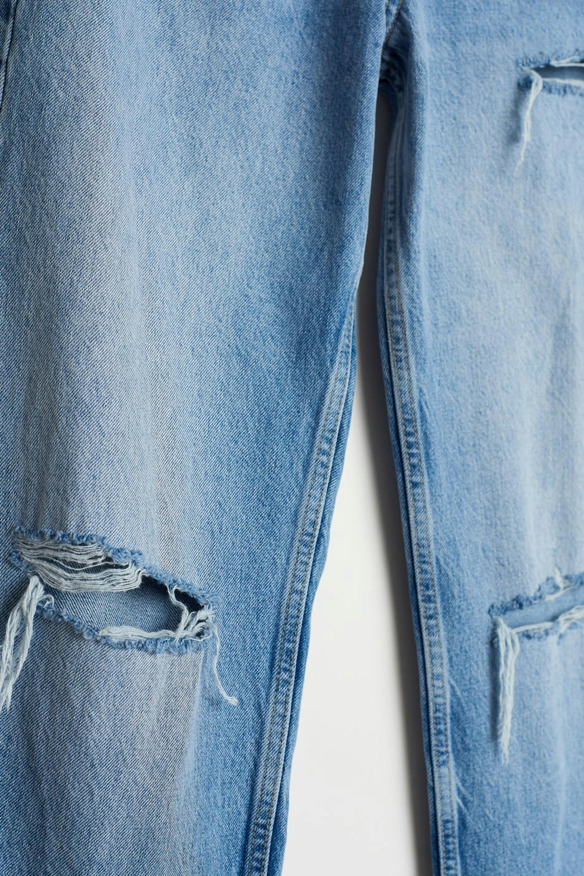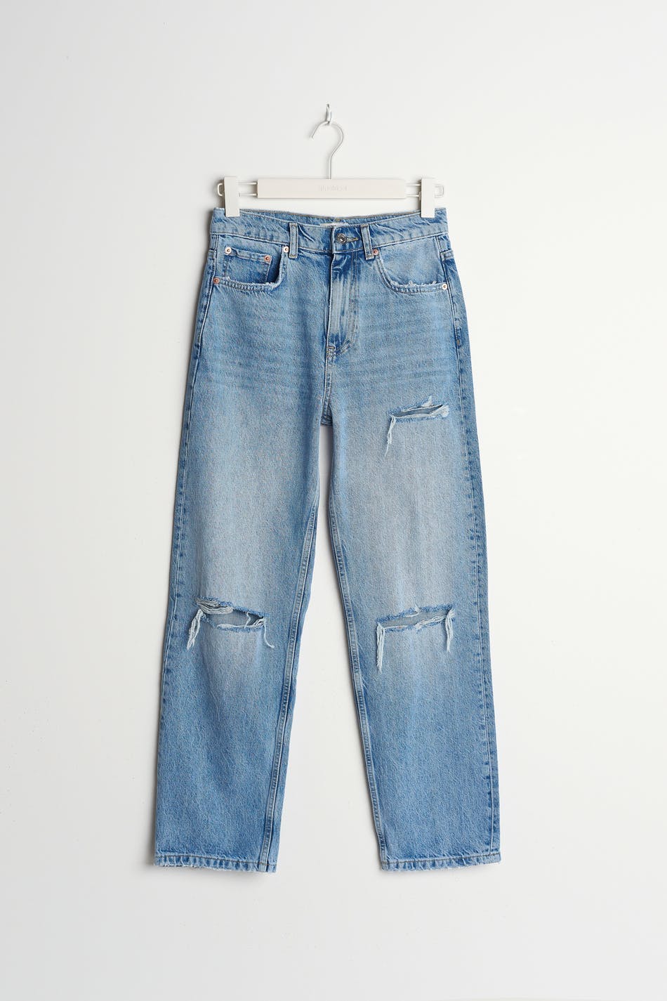 Petite highwaist jeans with distressed knees. The jeans is blue and non-stretch and has a high waist. It has a 90s inspired, straight fit and shorter leg length. Perfect for those who are 160 cm (5 ft 3 in.) or shorter.