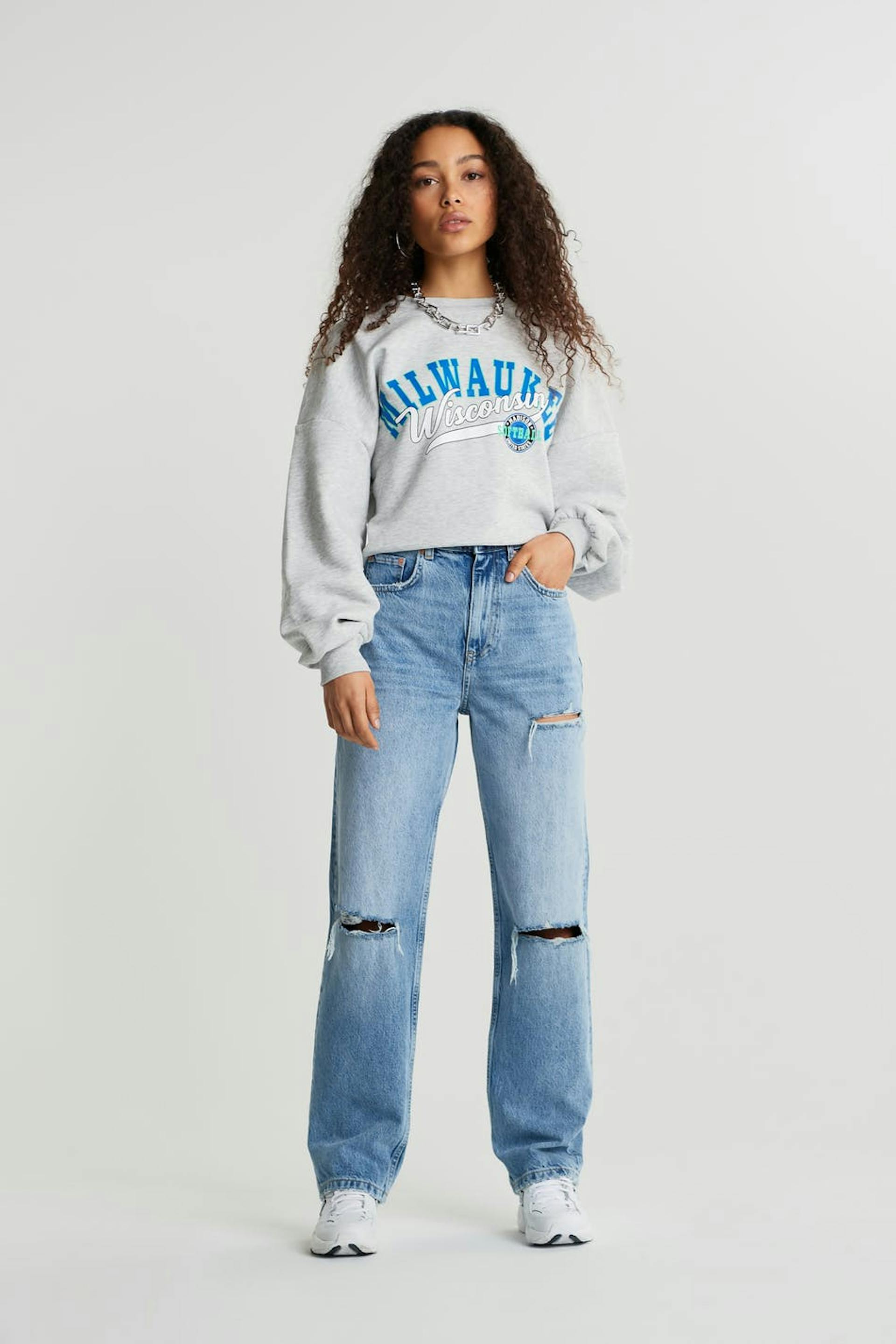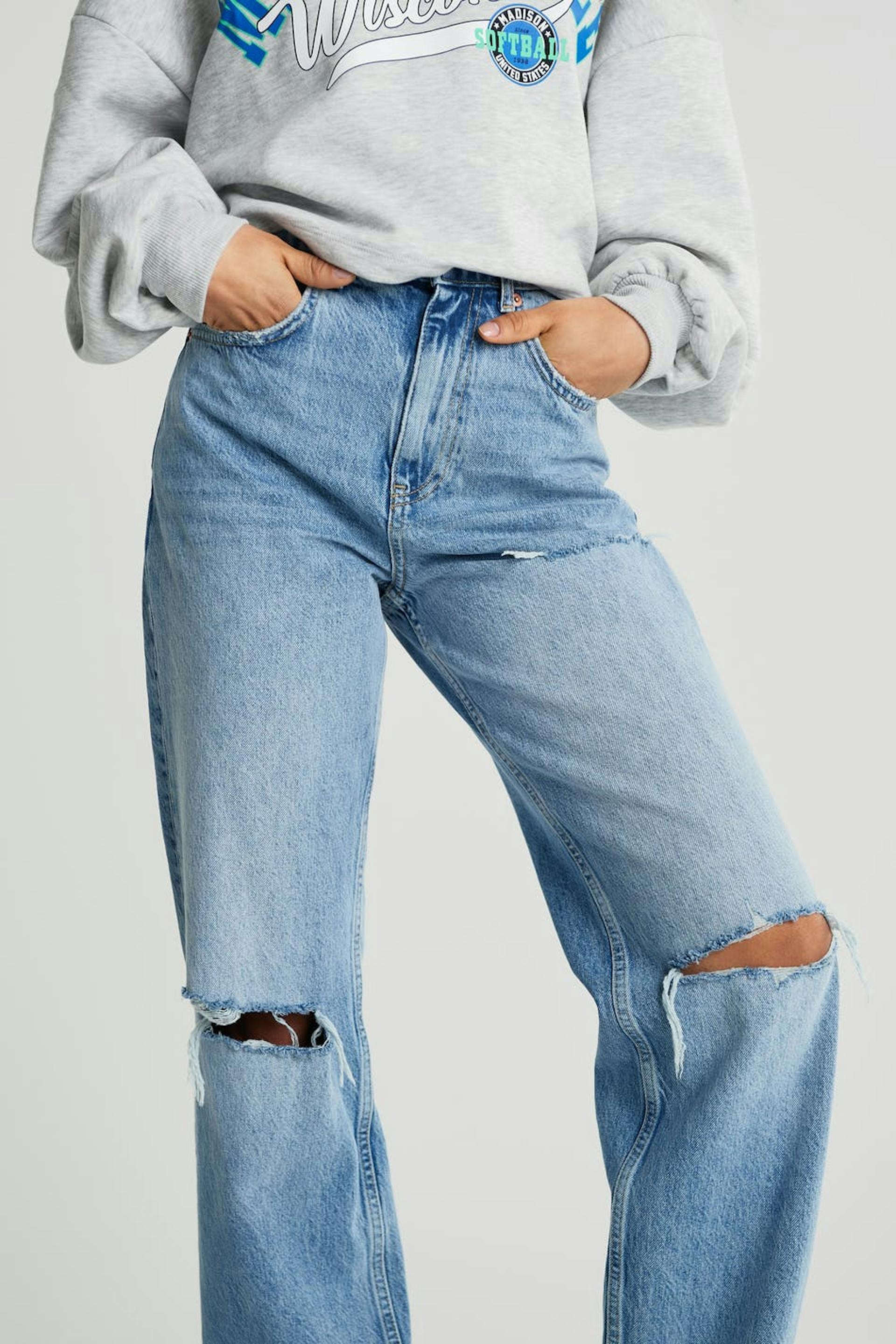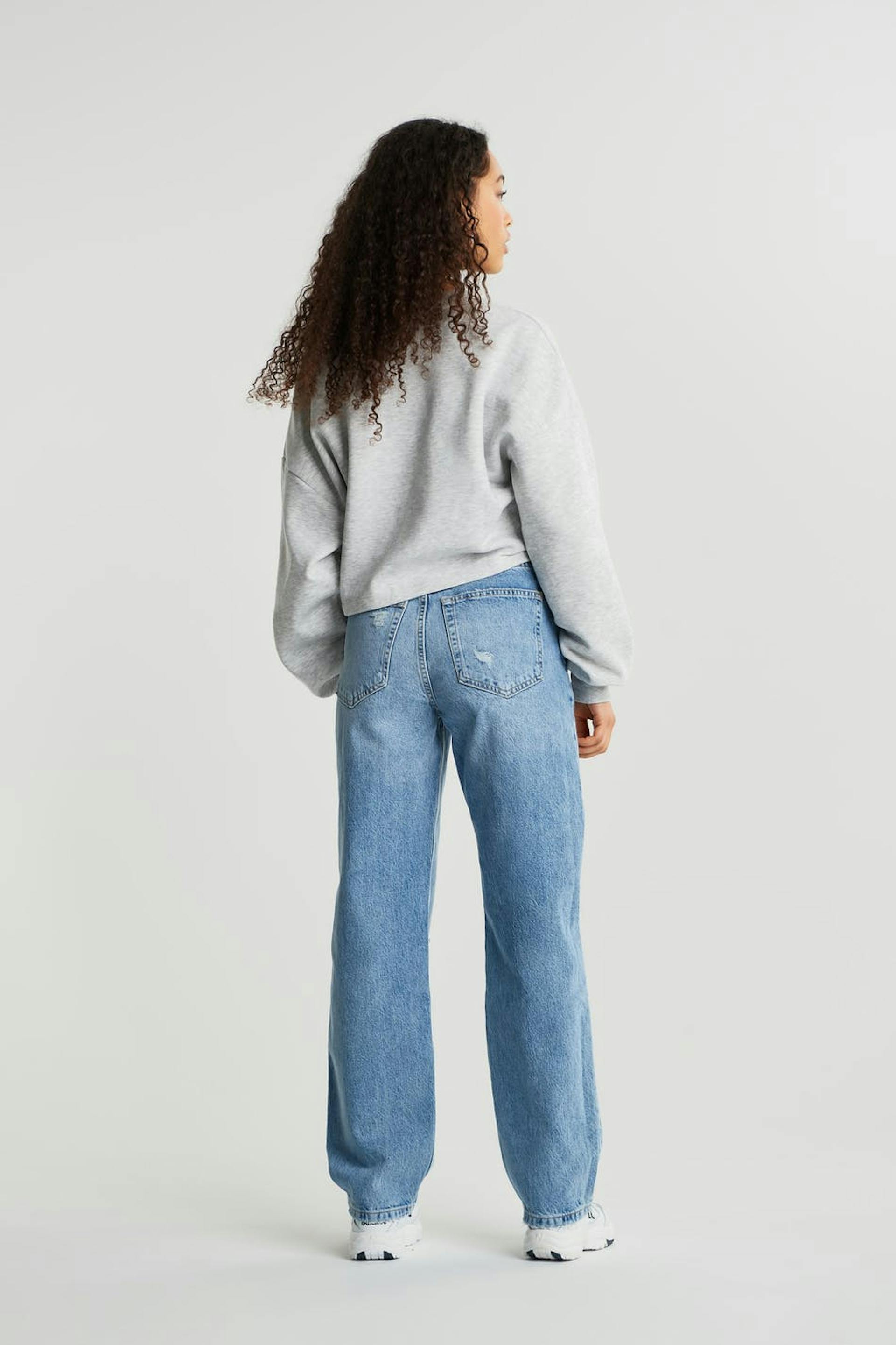 Petite highwaist jeans with distressed knees. The jeans is blue and non-stretch and has a high waist. It has a 90s inspired, straight fit and shorter leg length. Perfect for those who are 160 cm (5 ft 3 in.) or shorter.