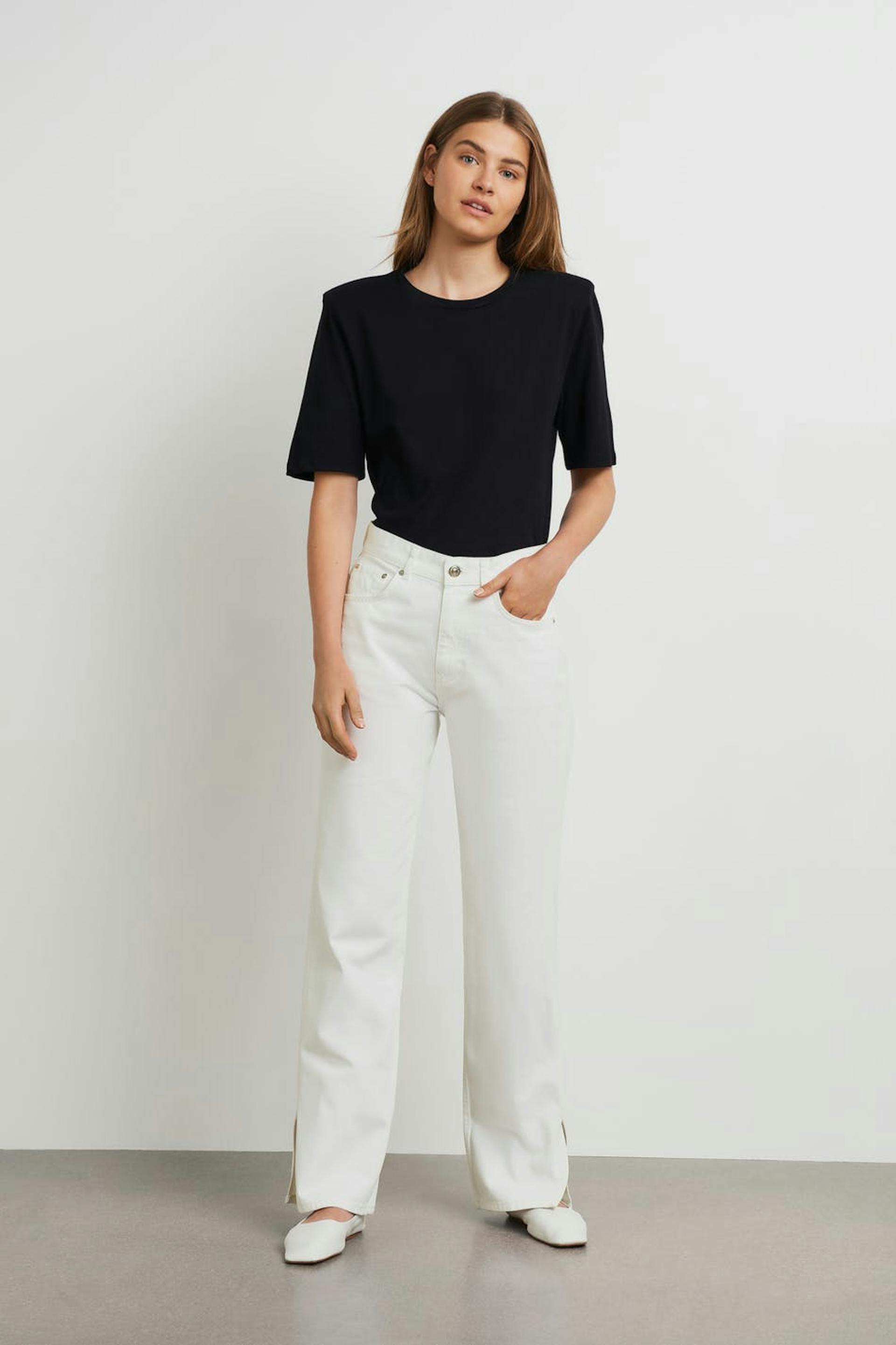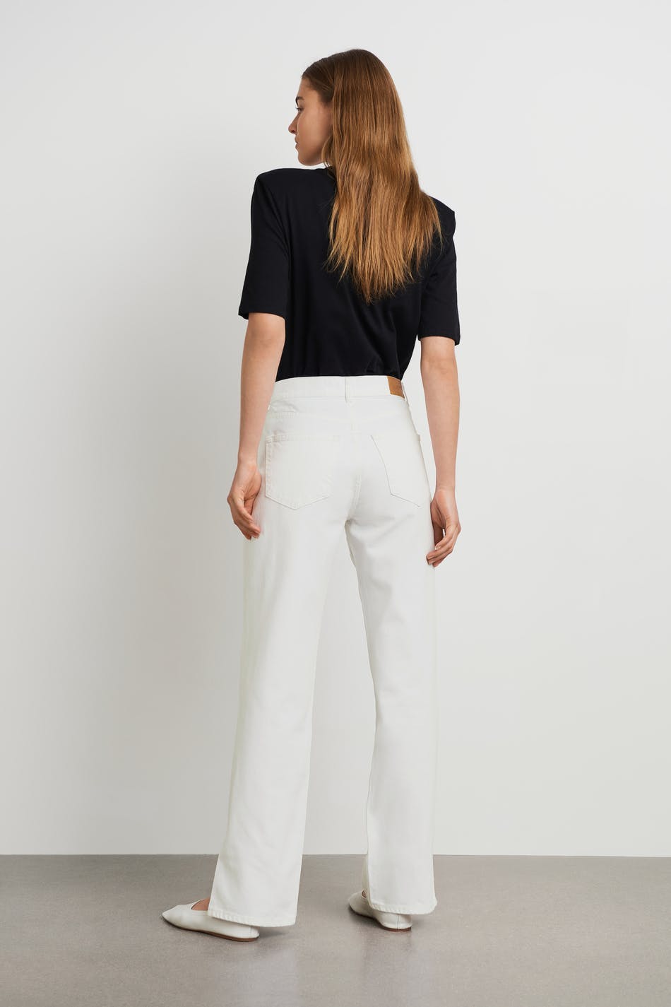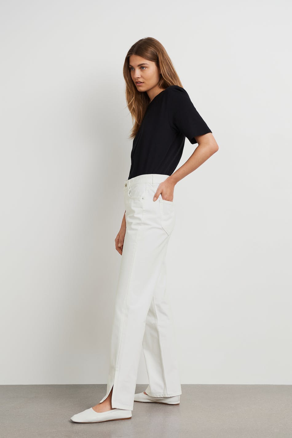 Non-stretch highwaist jeans with a 90s inspired fit. The jeans is white and straight and has a slit at the end of the legs. It is made of denim.