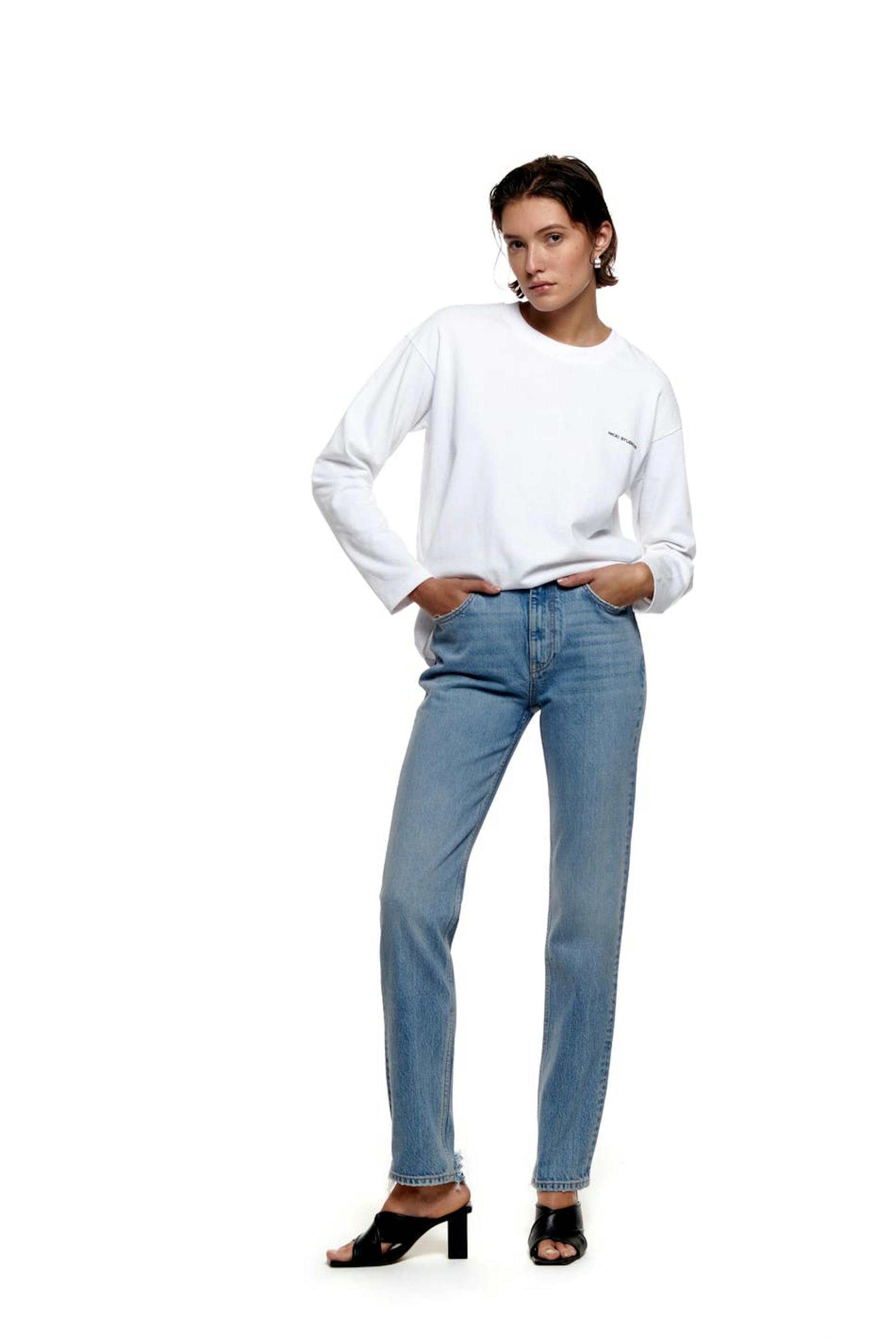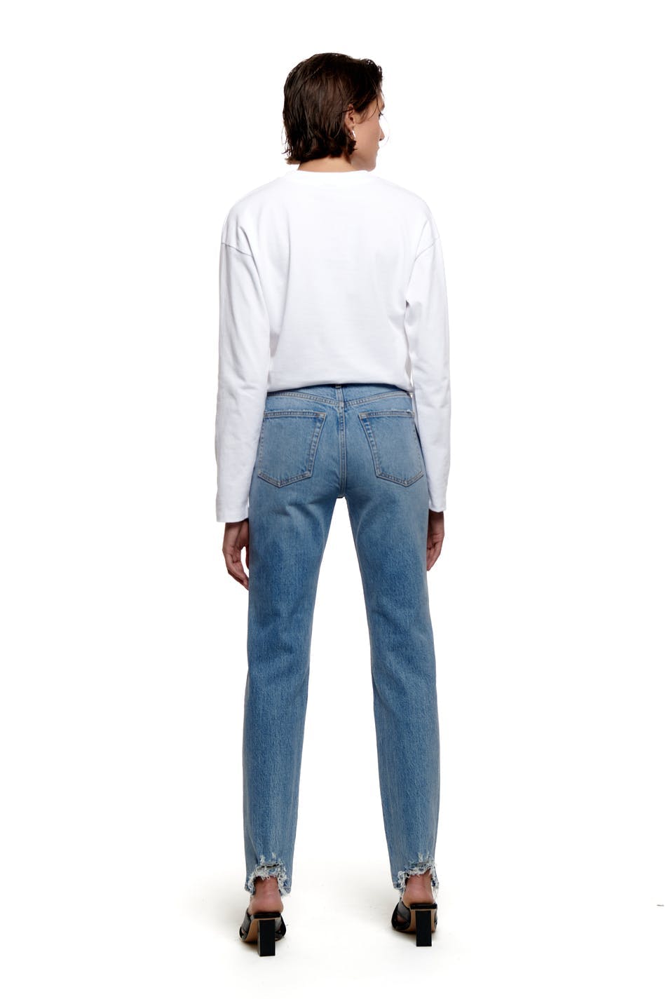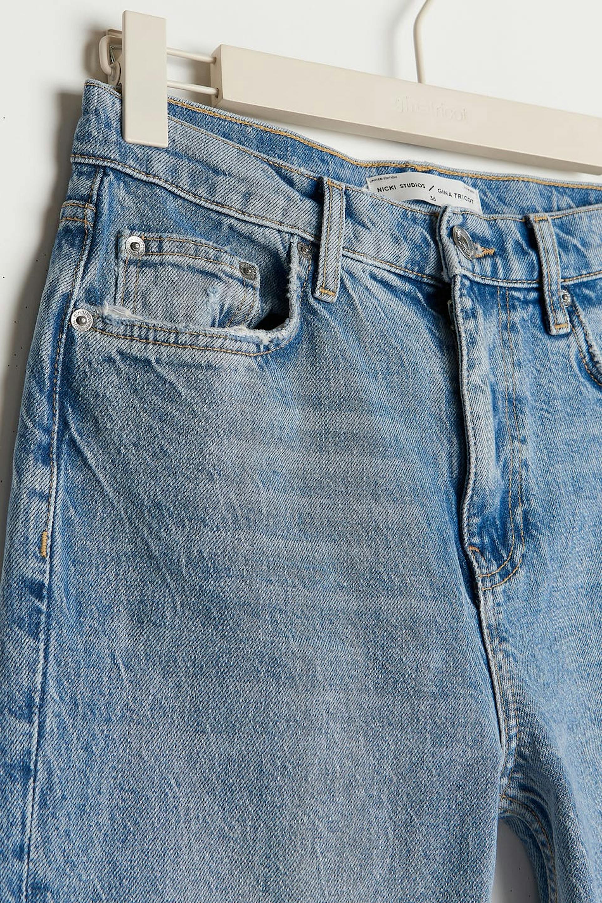 Nicki Studios X Gina Tricot. Jeans with high waist. The jeans is blue and has slim, straight legs. It is made of stretch denim and has distressed details at the end of the legs and pockets at the front and back.