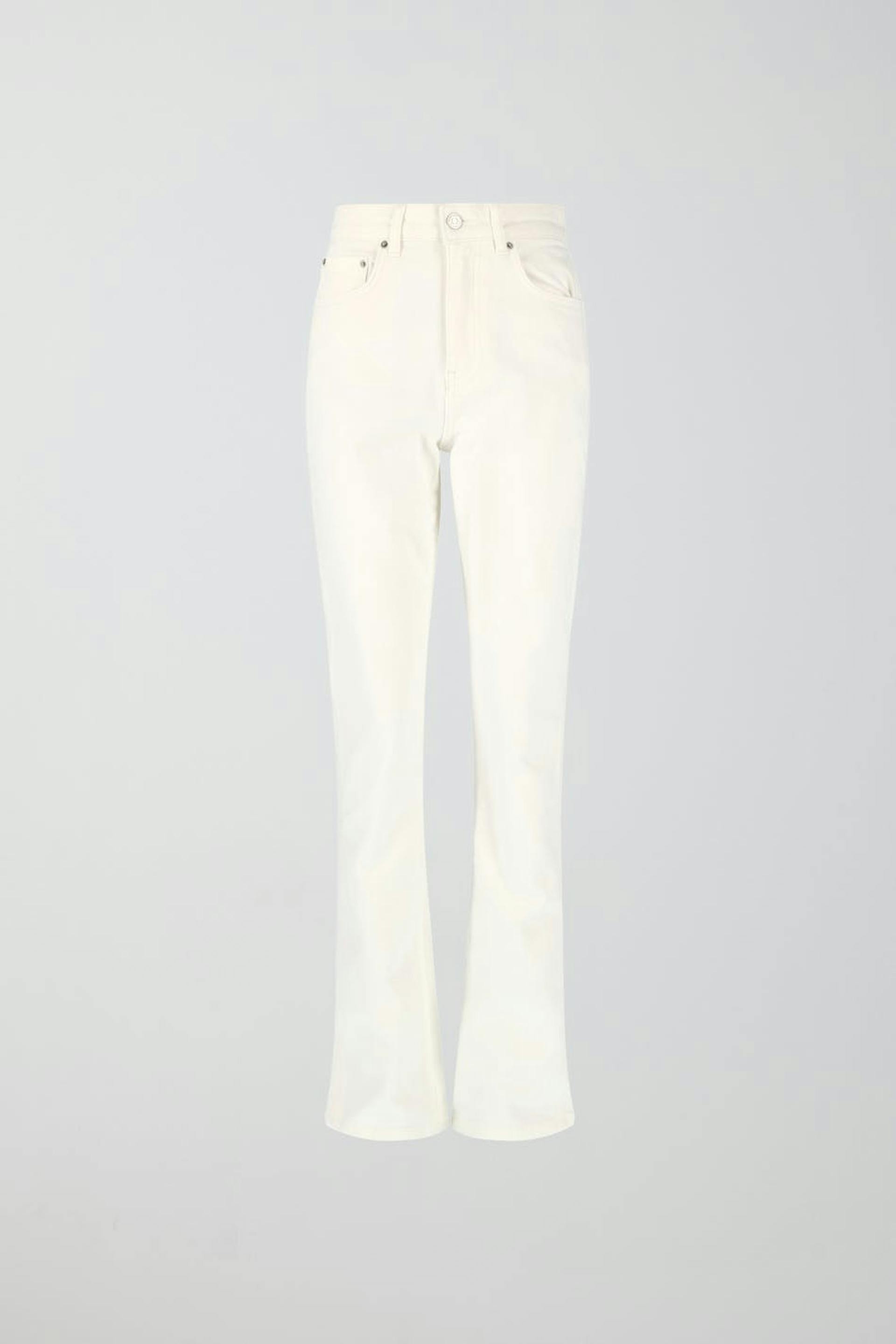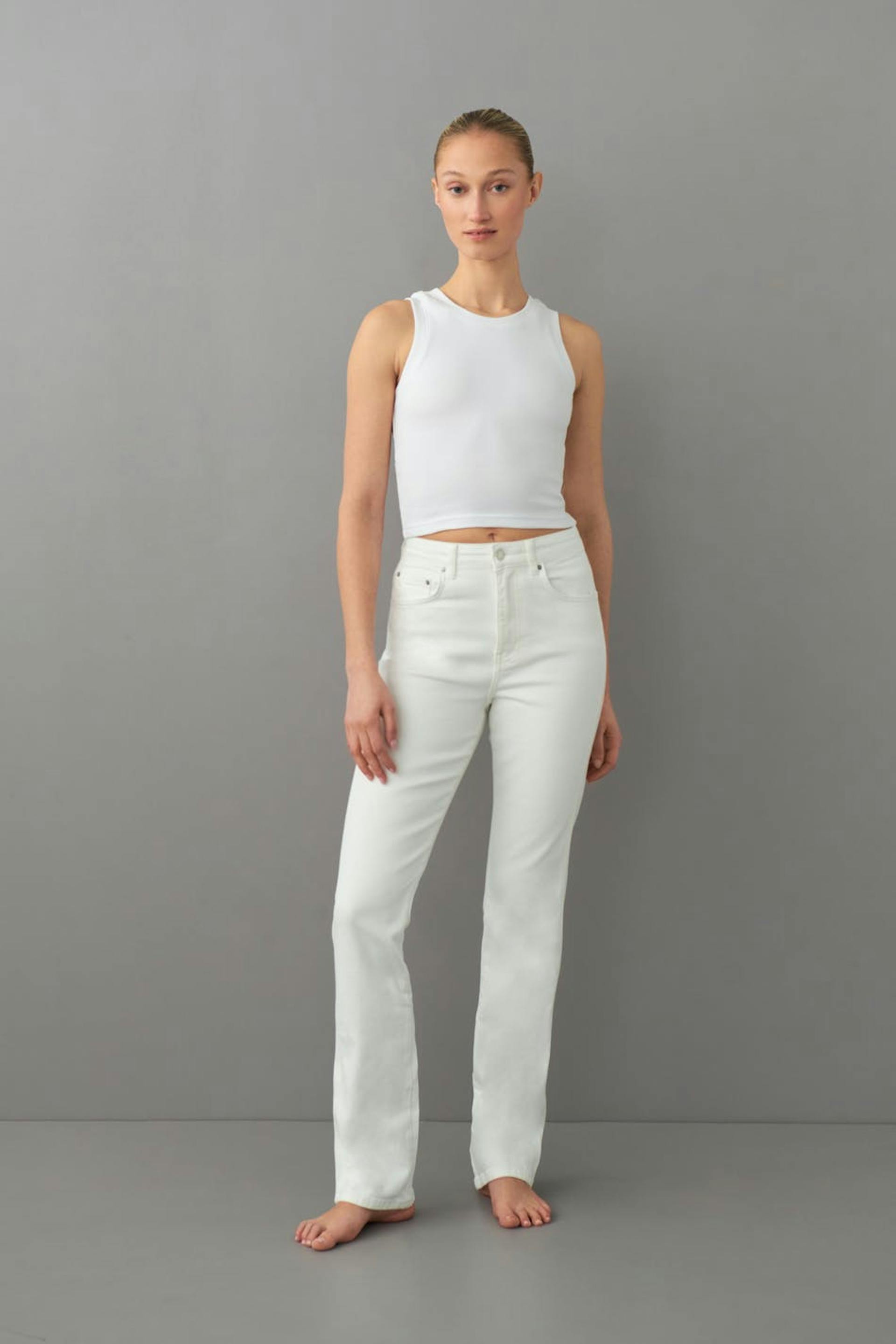 Straight jeans with high waist in stretch denim. The jeans are white and have straight legs with full length. They have zip fly and pockets at the front and back. Use our size guide to find your size.