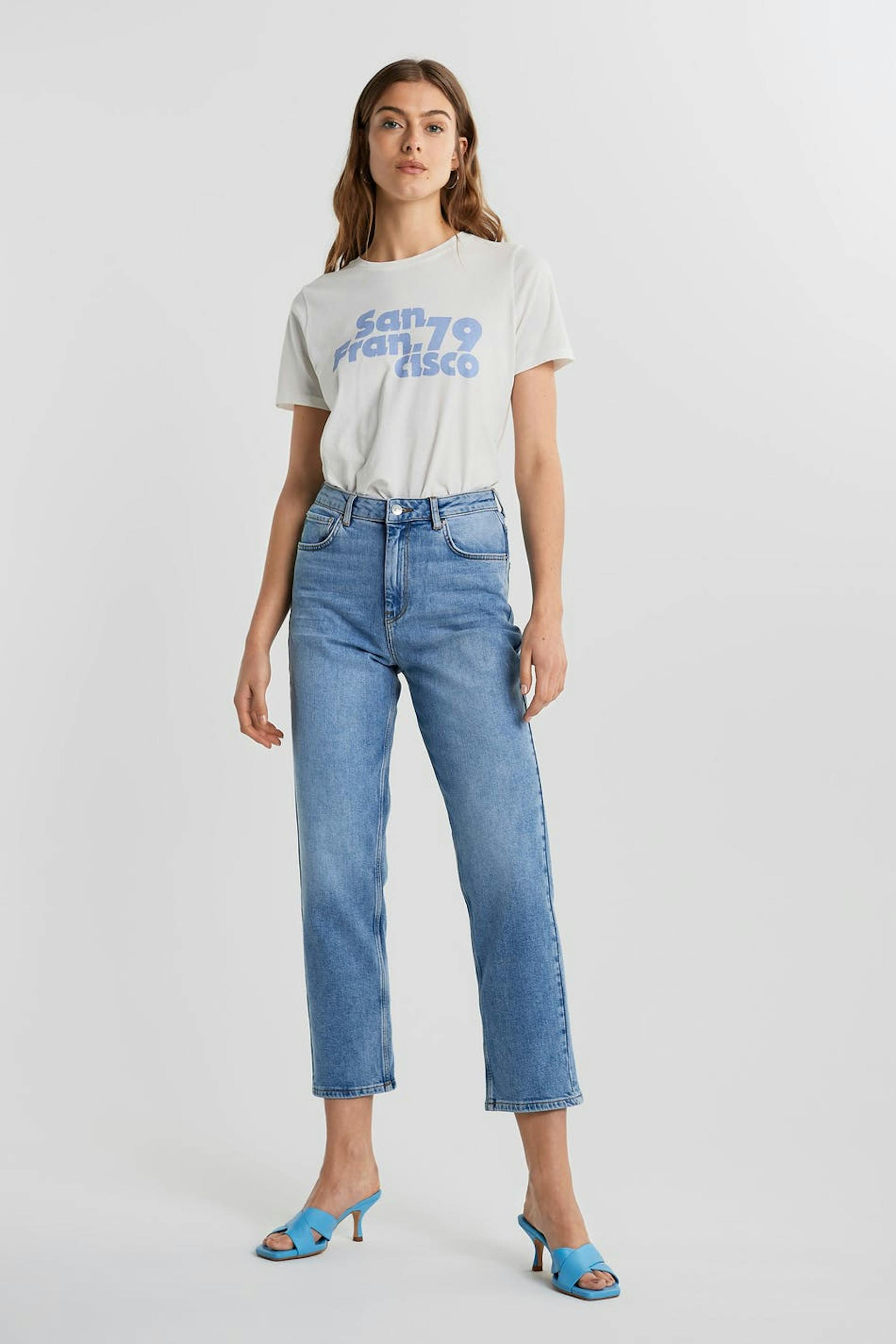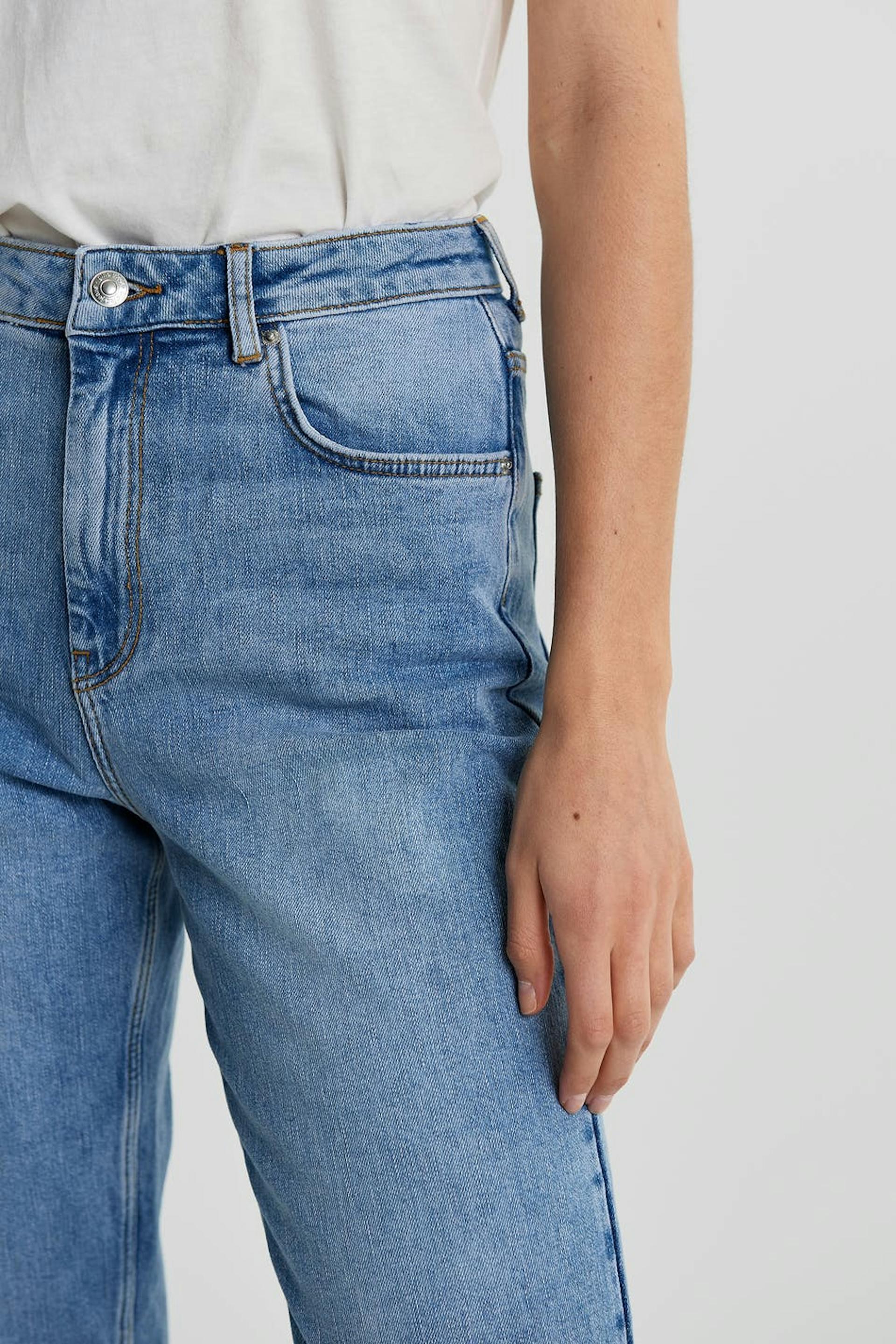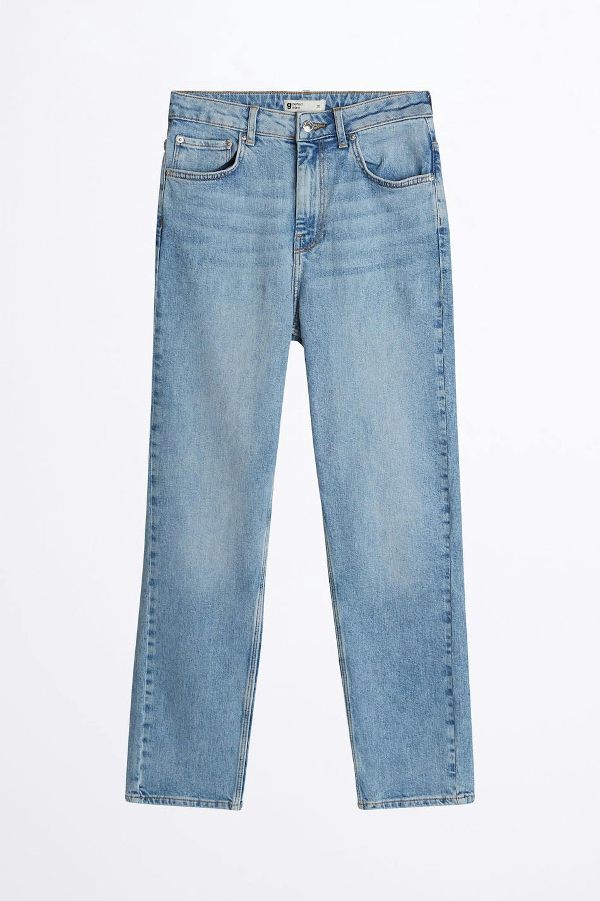 Straight jeans with a high waist. The jeans is light-blue and has a material in denim with little stretch.