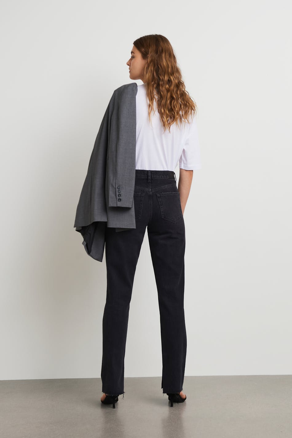 Straight jeans with a high waist. The jeans is black and has a slim fit. It has a detail with a slit on the inside leg and a non-stretch material in denim.