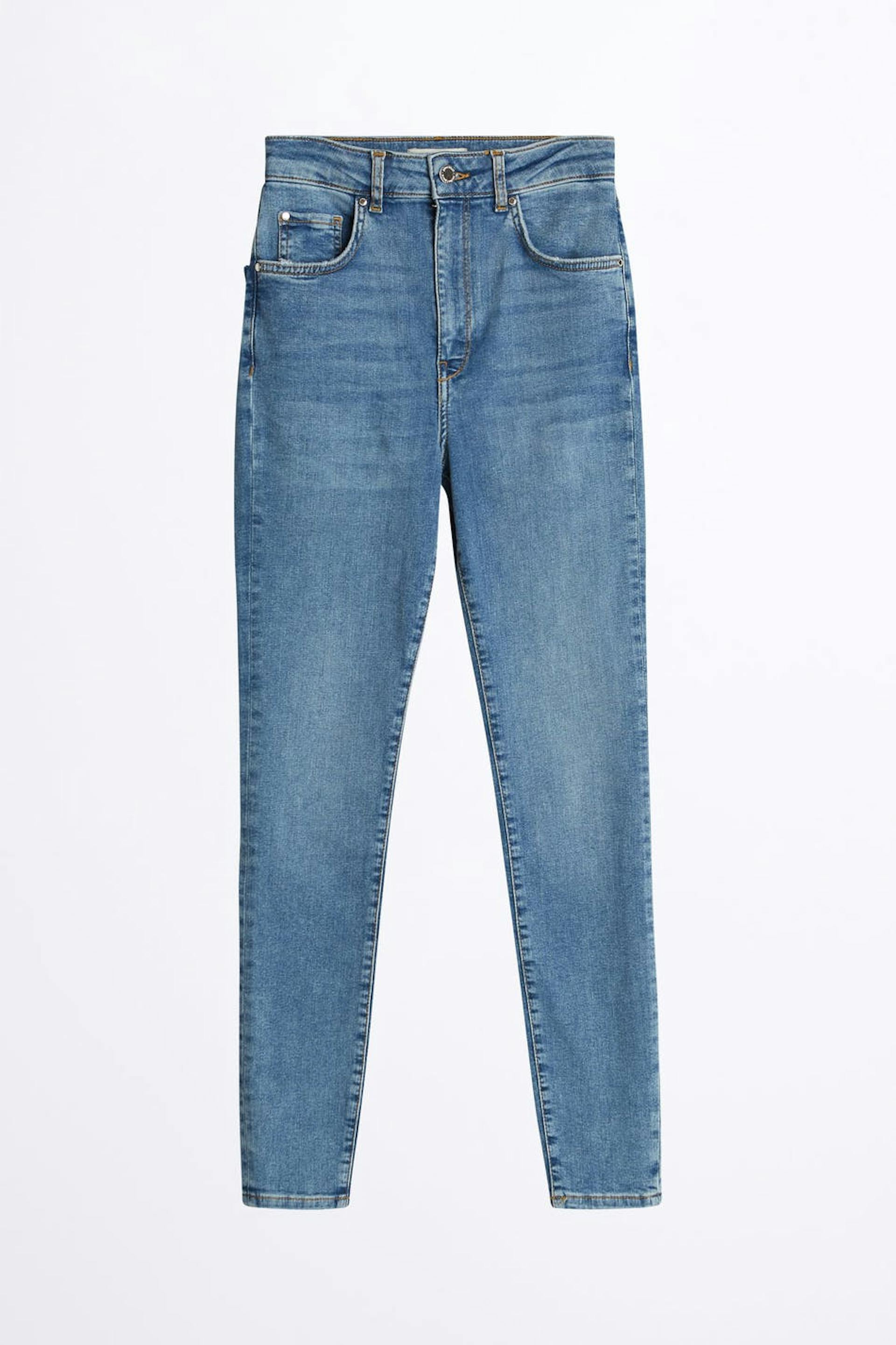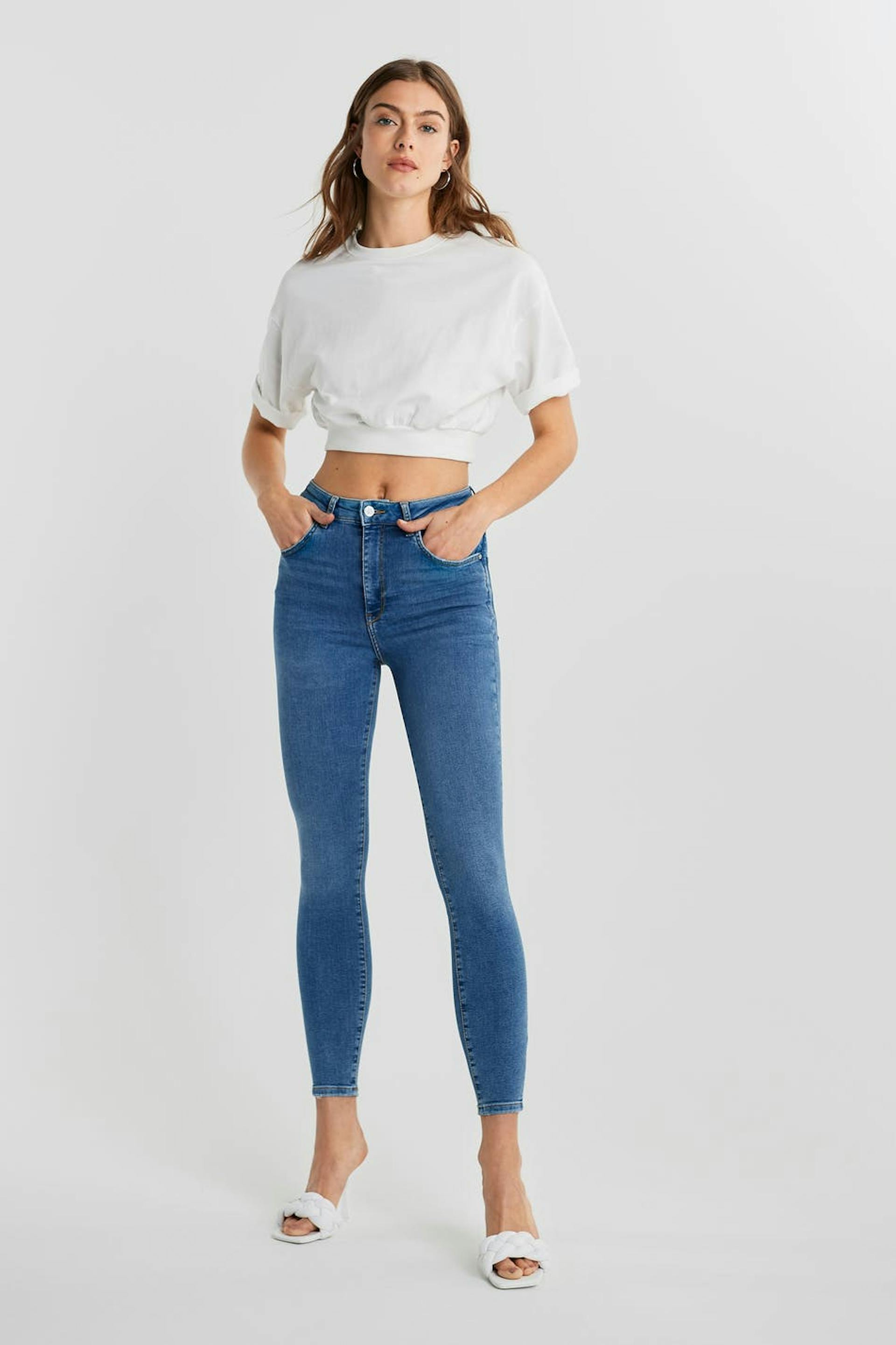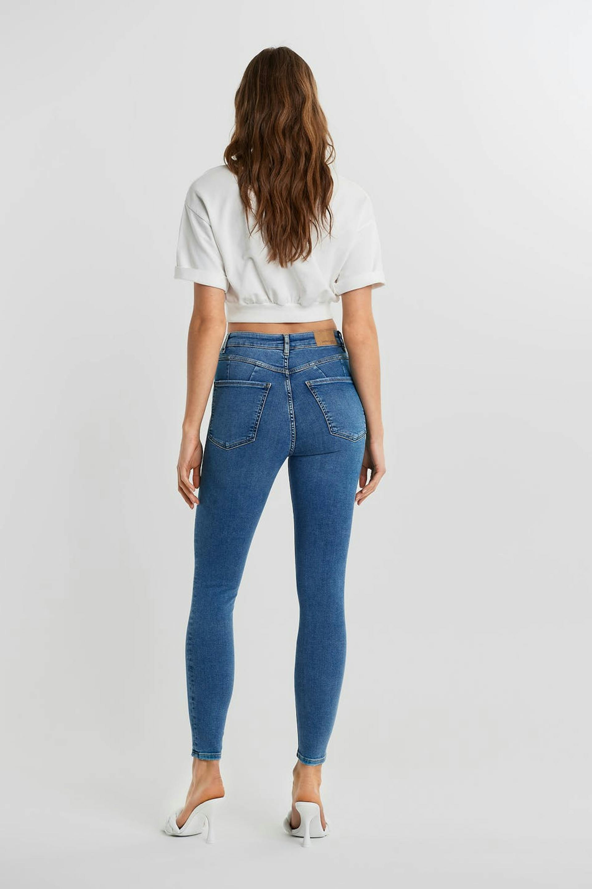 Stretchy jeans with a fitted fit. The jeans is blue and has a skinny fit. It has a high waist and curved yoke at the back.