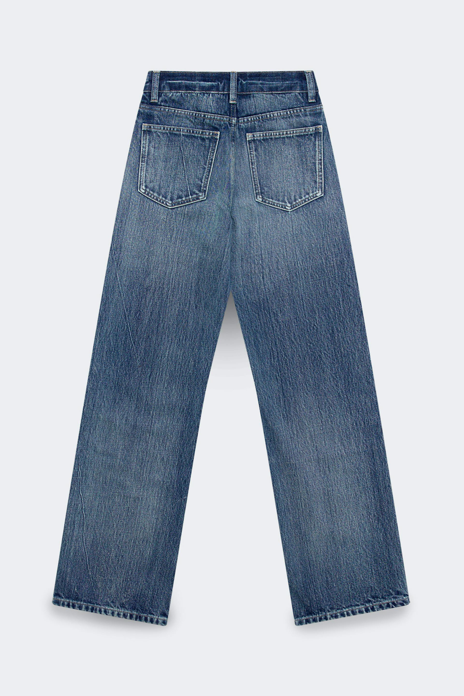 High waist jeans with wide legs. The jeans are blue and have full length. They have zip fly, pockets at the front and back and belt loops. Use our size guide to find your size.