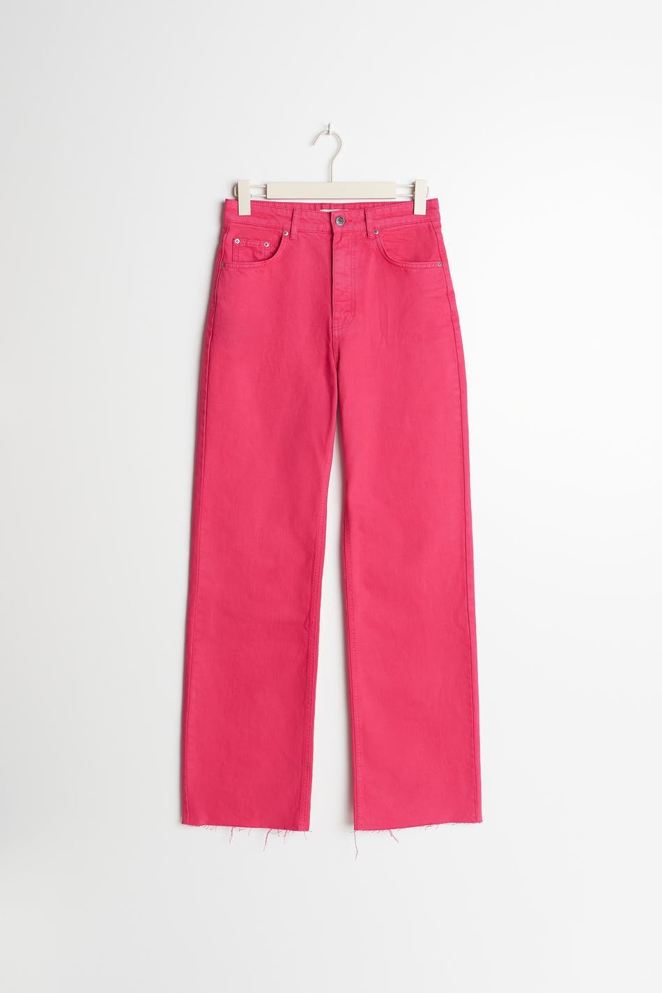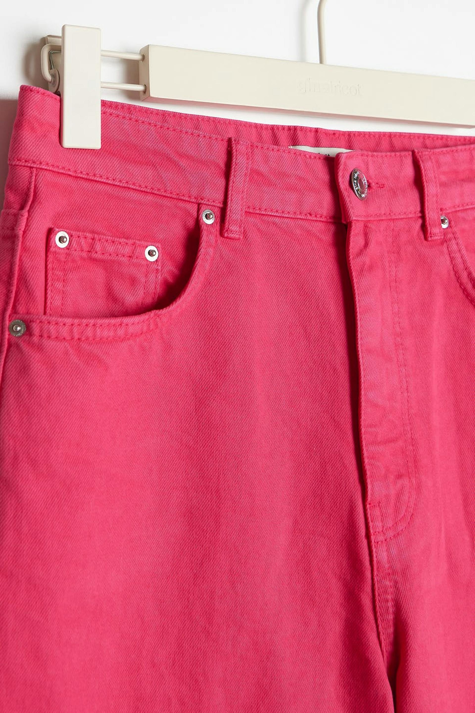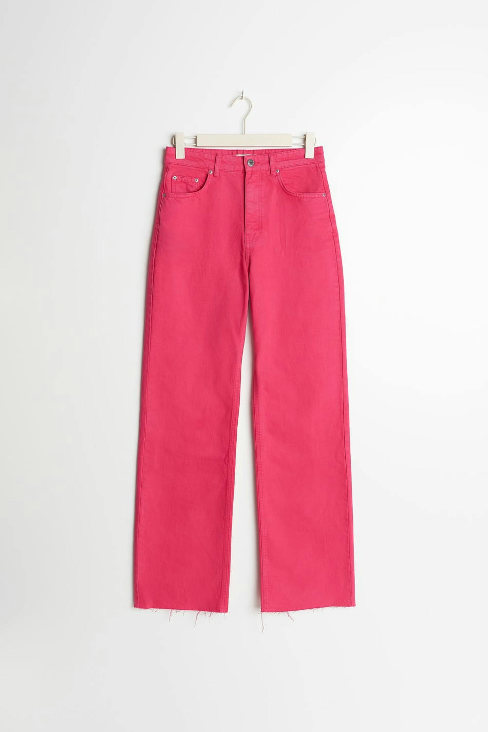 Non-stretch jeans with super high waist. The jeans is pink and has straight, wide trouser legs with full length. It has zip fly and raw edge at the end of the legs. The jeans can easily be cut to the preferred length. Use our size guide to find your size.