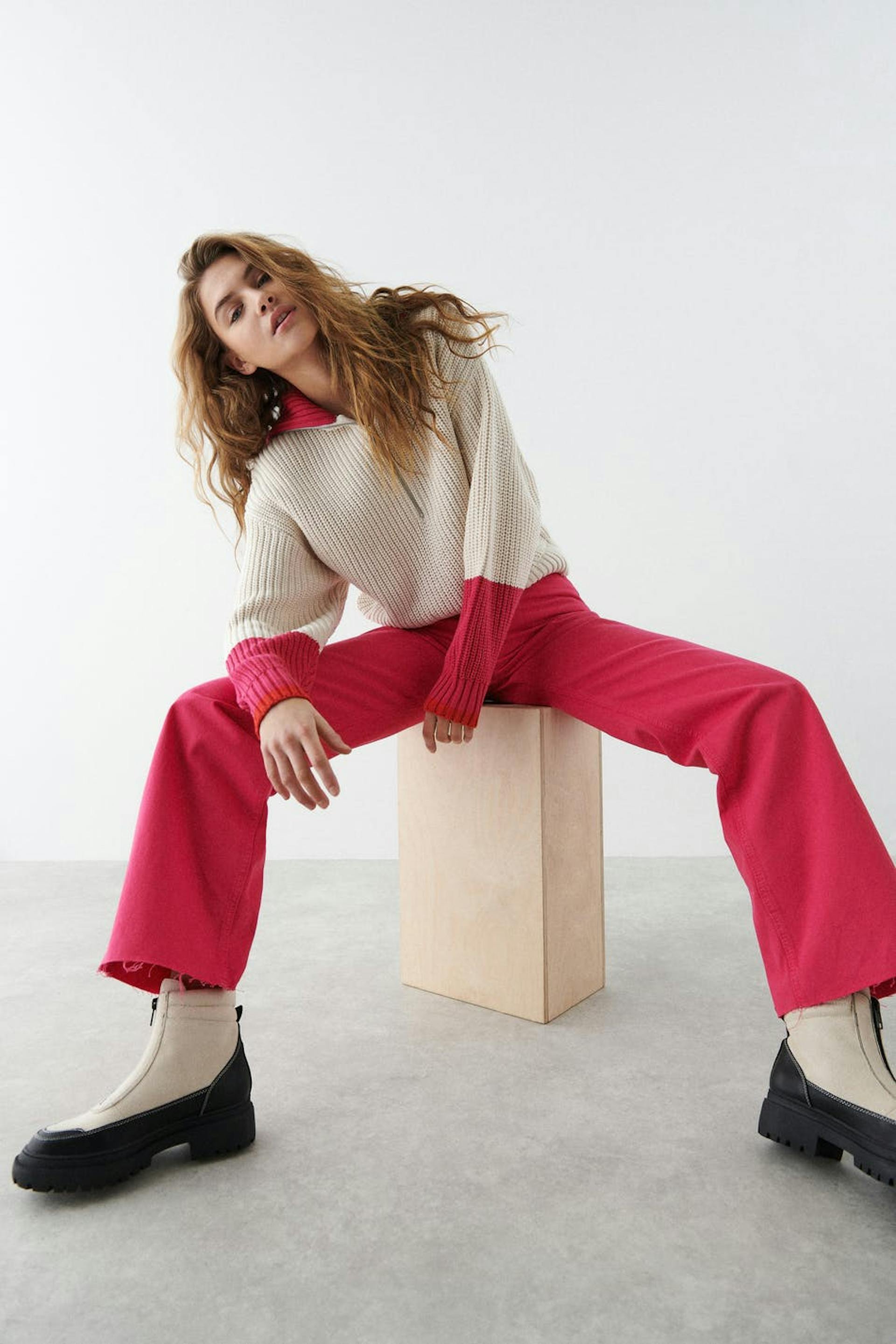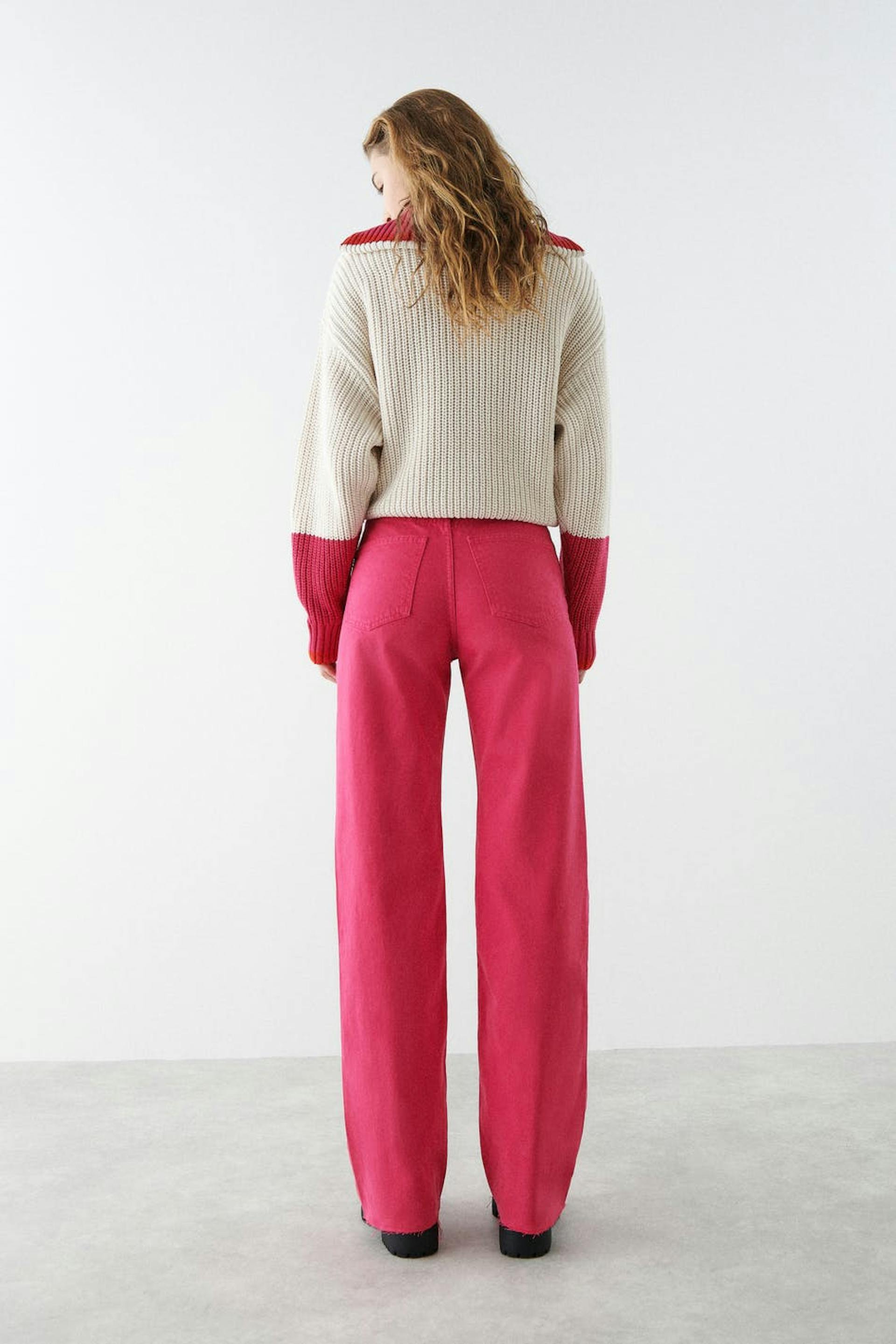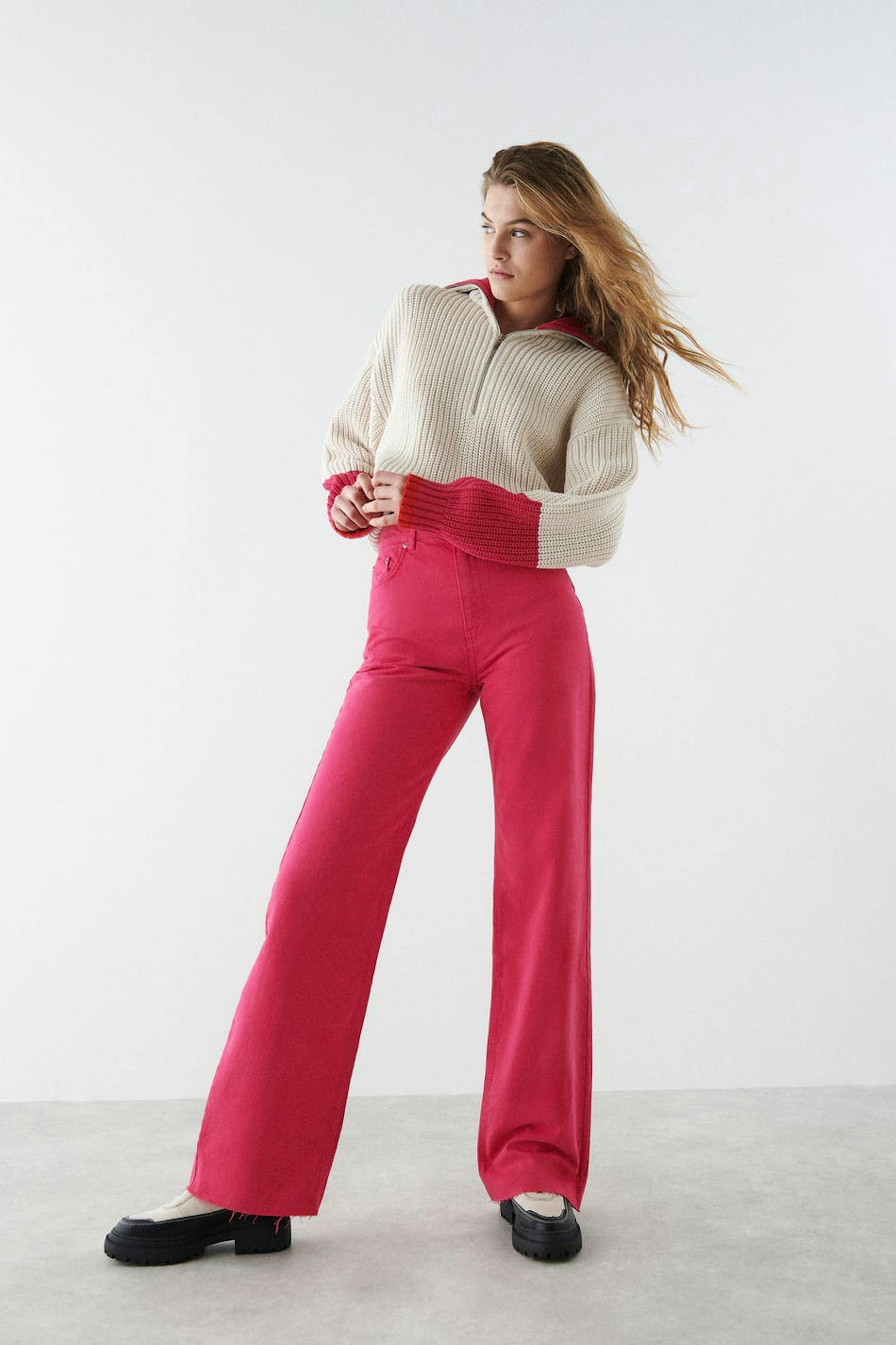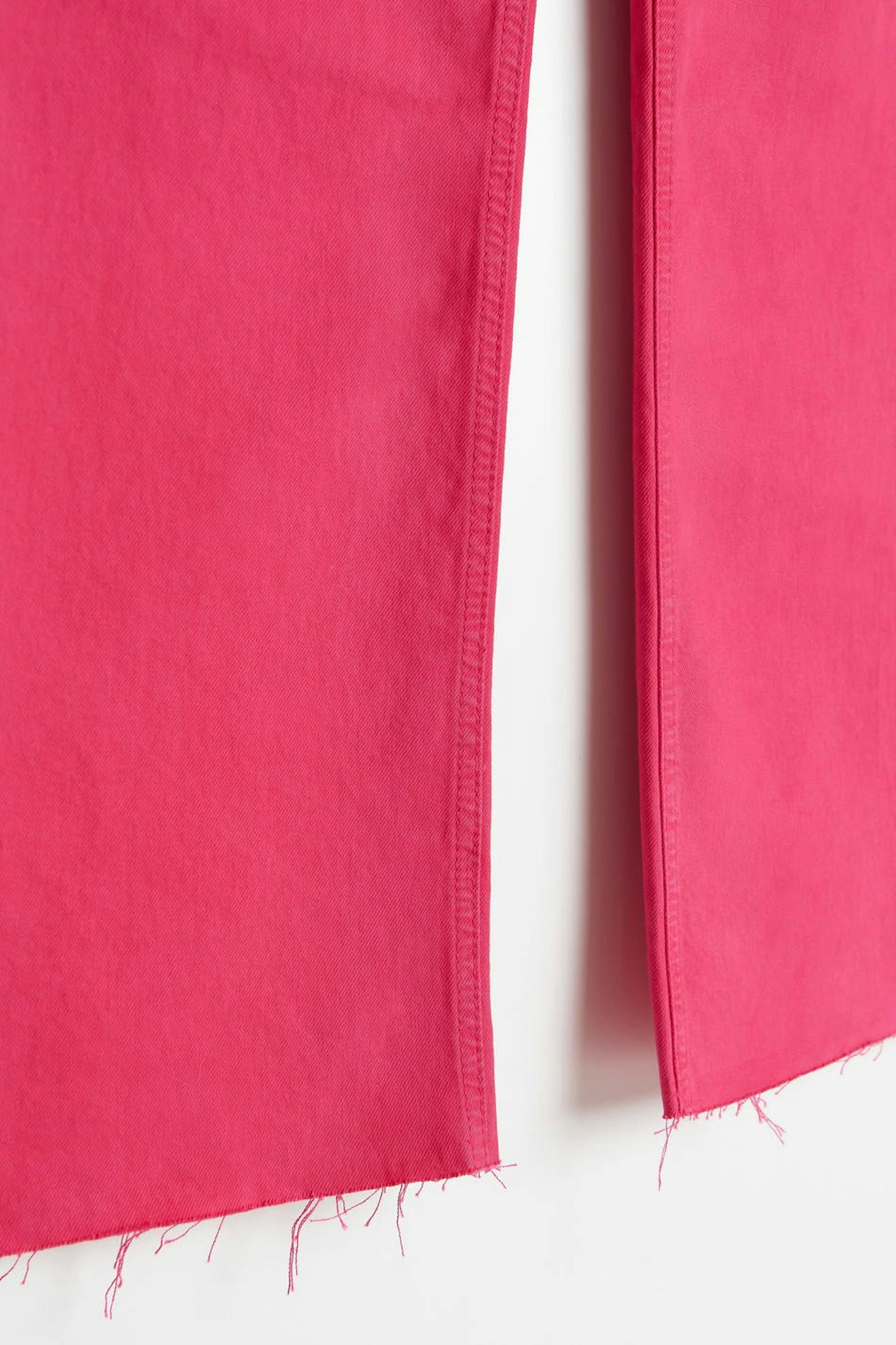 Non-stretch jeans with super high waist. The jeans is pink and has straight, wide trouser legs with full length. It has zip fly and raw edge at the end of the legs. The jeans can easily be cut to the preferred length. Use our size guide to find your size.
