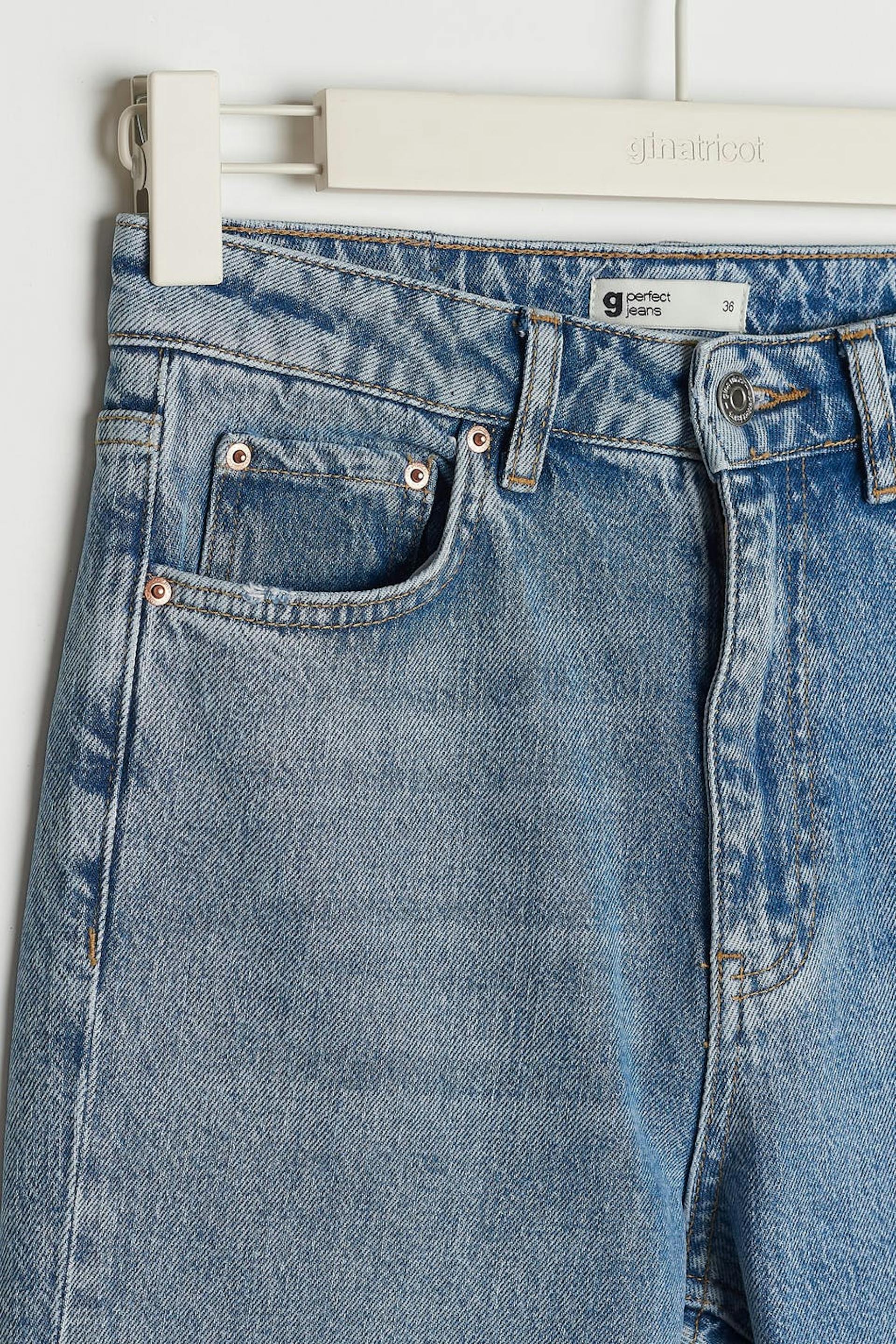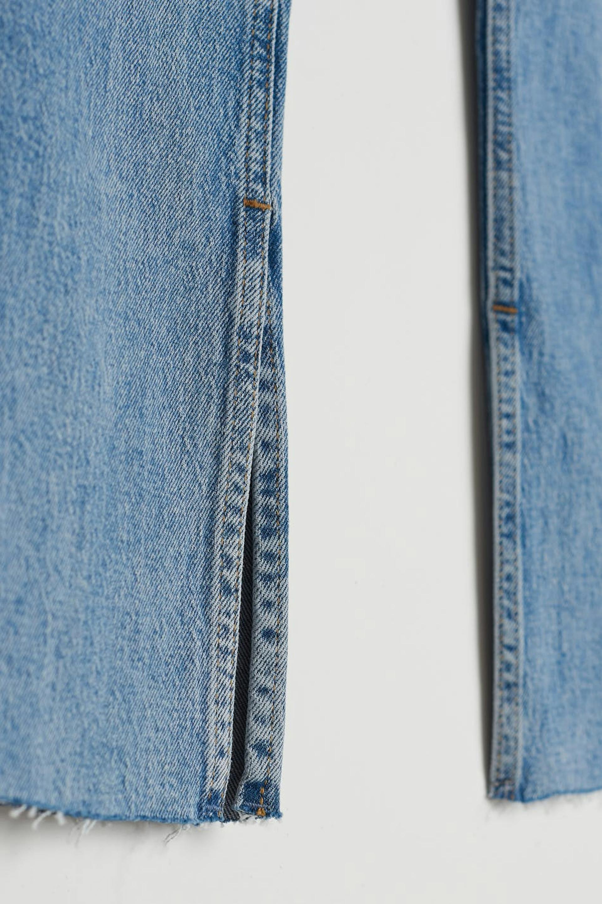 Petite slim jeans with high waist. The jeans is blue and has straight legs with full length. It is made of denim and has low stretch, slit at the end of the legs, fly with zip and raw edge at the bottom. Perfect for those who are 160 cm (5 ft 3 in.) or shorter. Use our size guide to find your size.