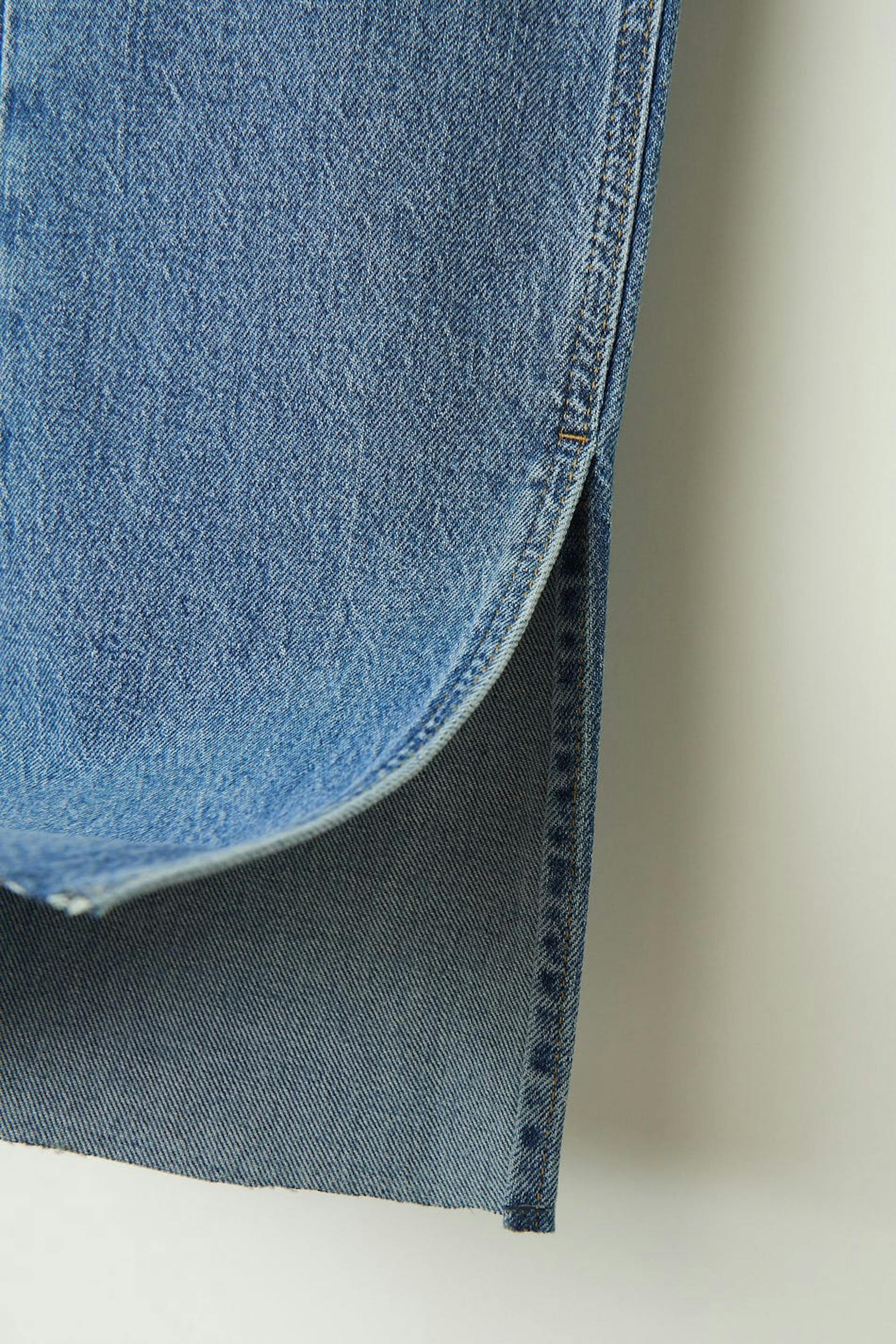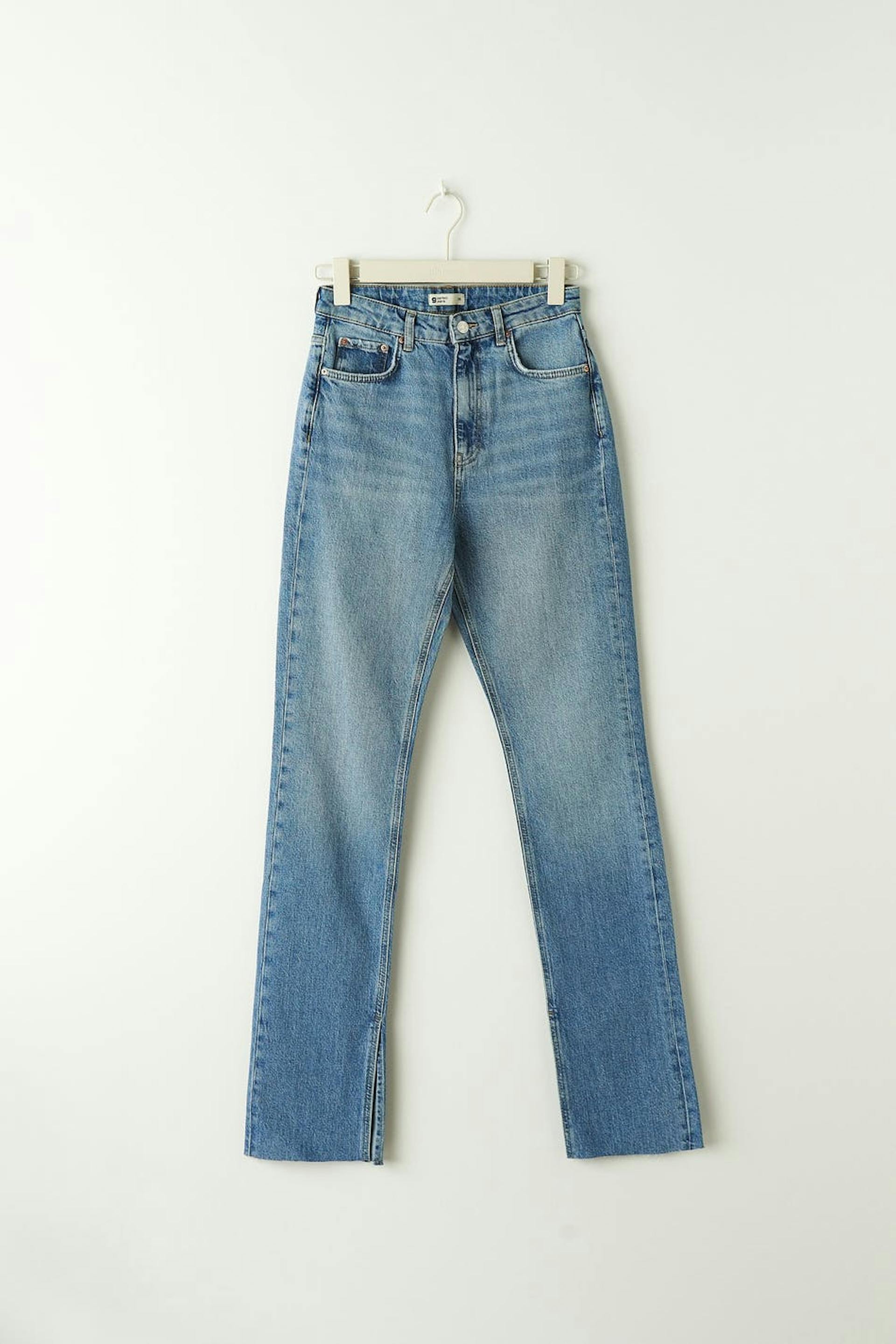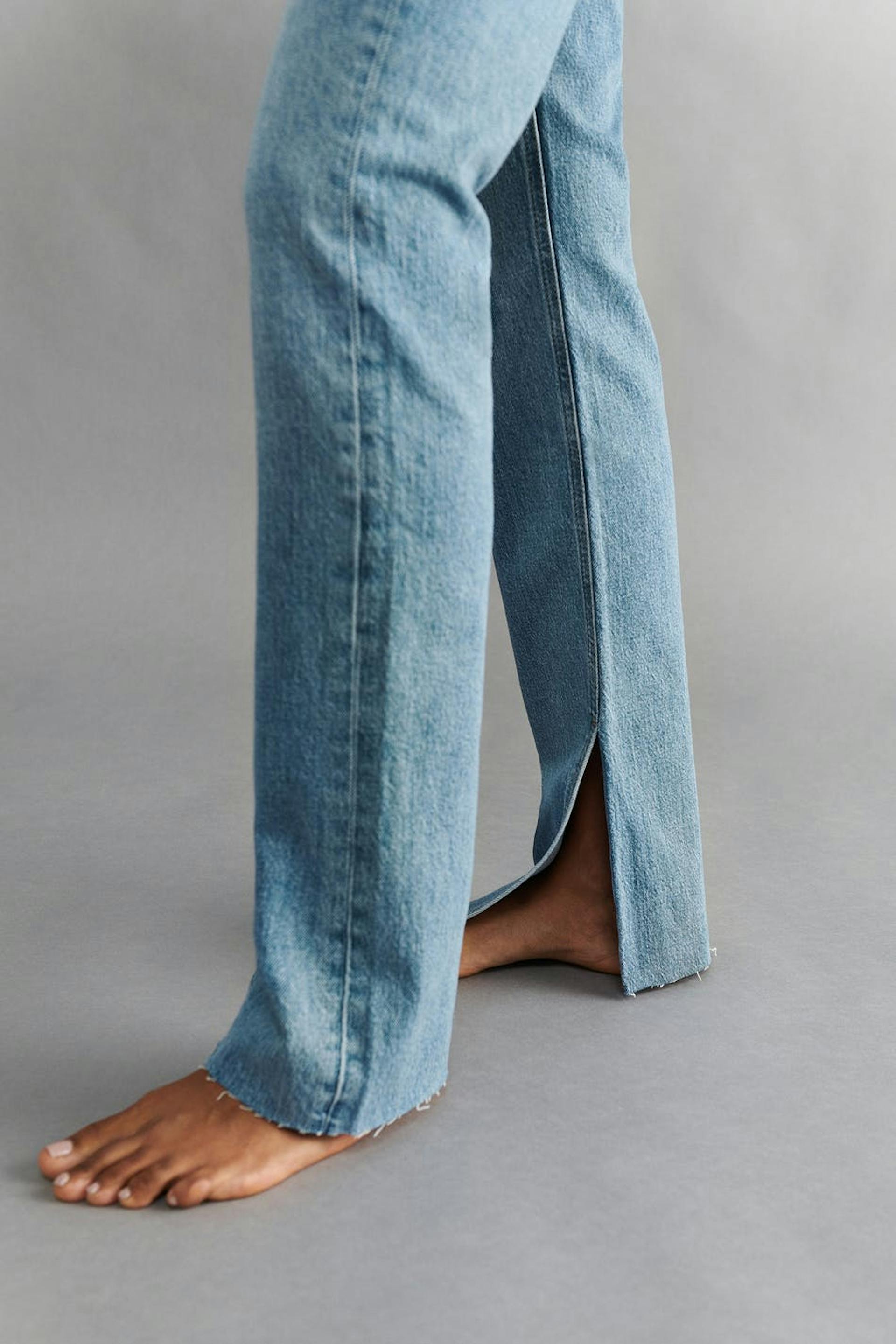 Slim jeans with high waist in low stretch denim. The jeans are blue and have straight legs with full length. They have slit at the end of the legs, raw edge at the bottom, fly with zip and pockets at the front and back. Use our size guide to find your size.
